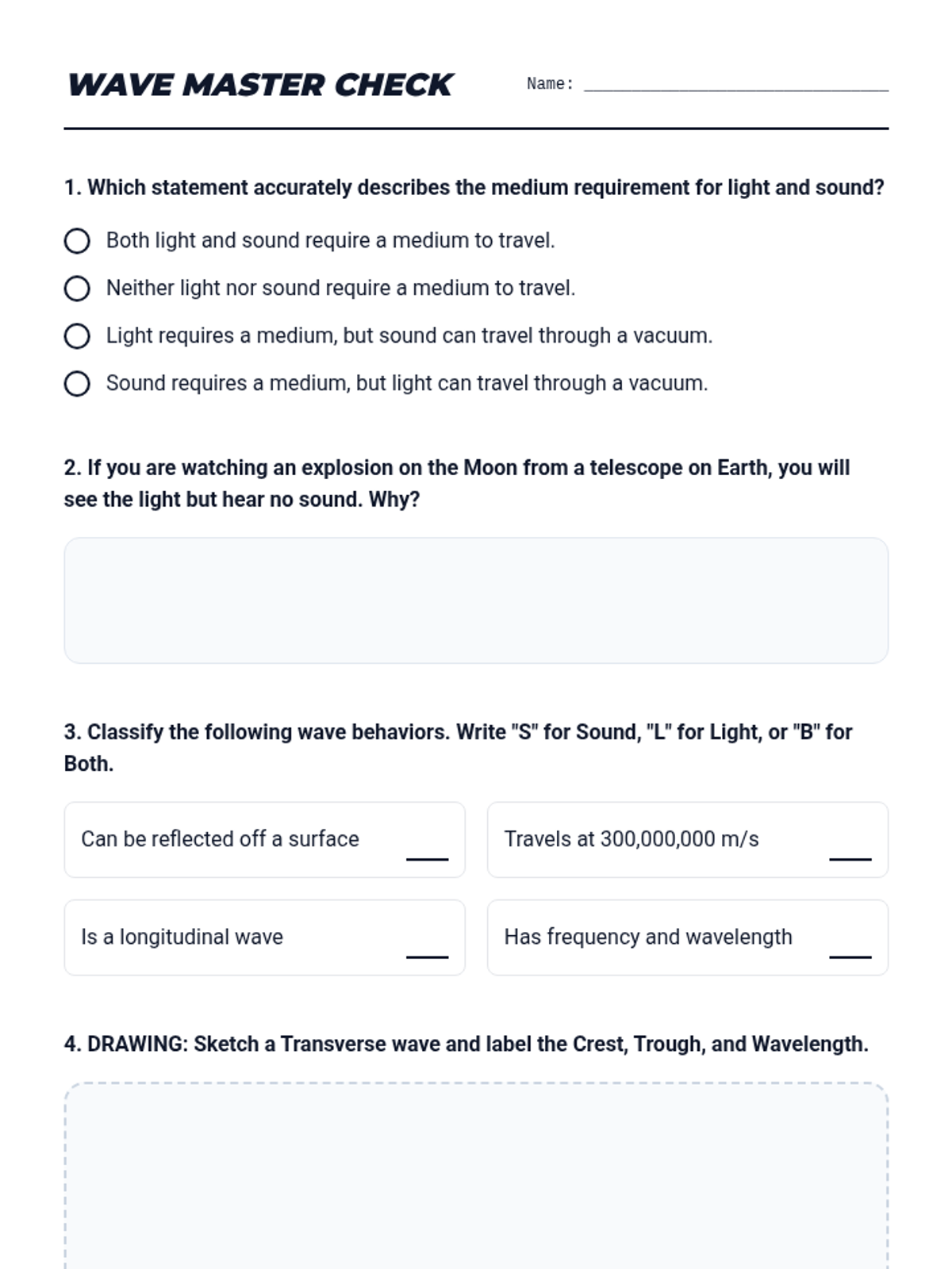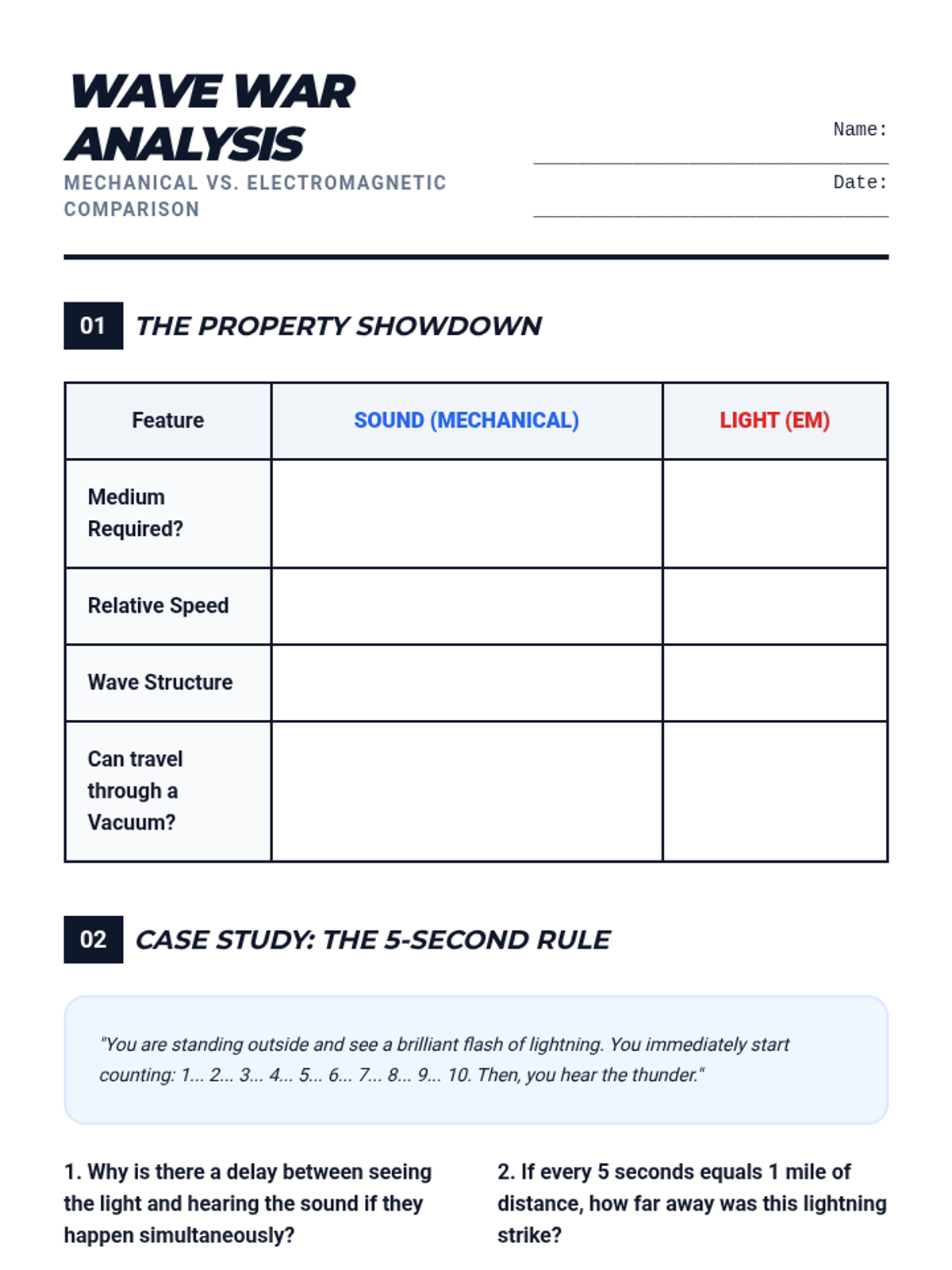 A comparative analysis of mechanical (sound) and electromagnetic (light) waves, focusing on speed, medium requirements, and wave behavior.