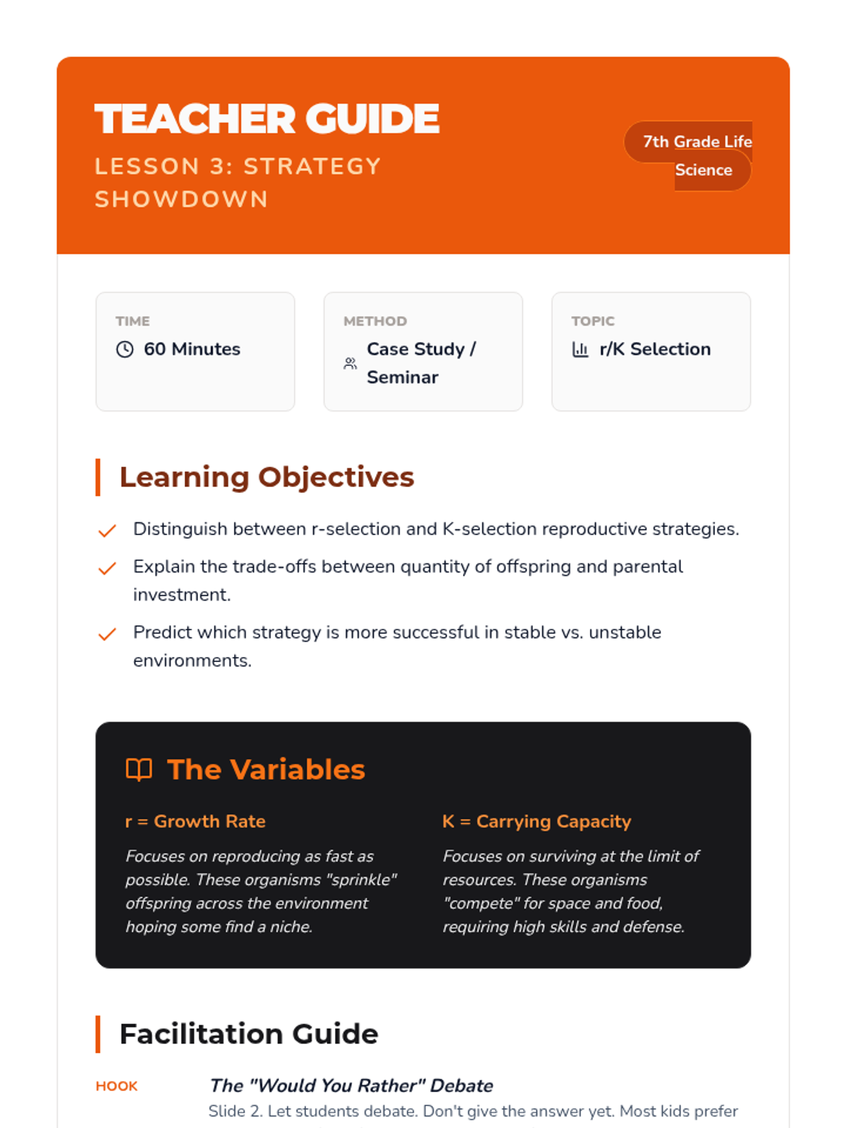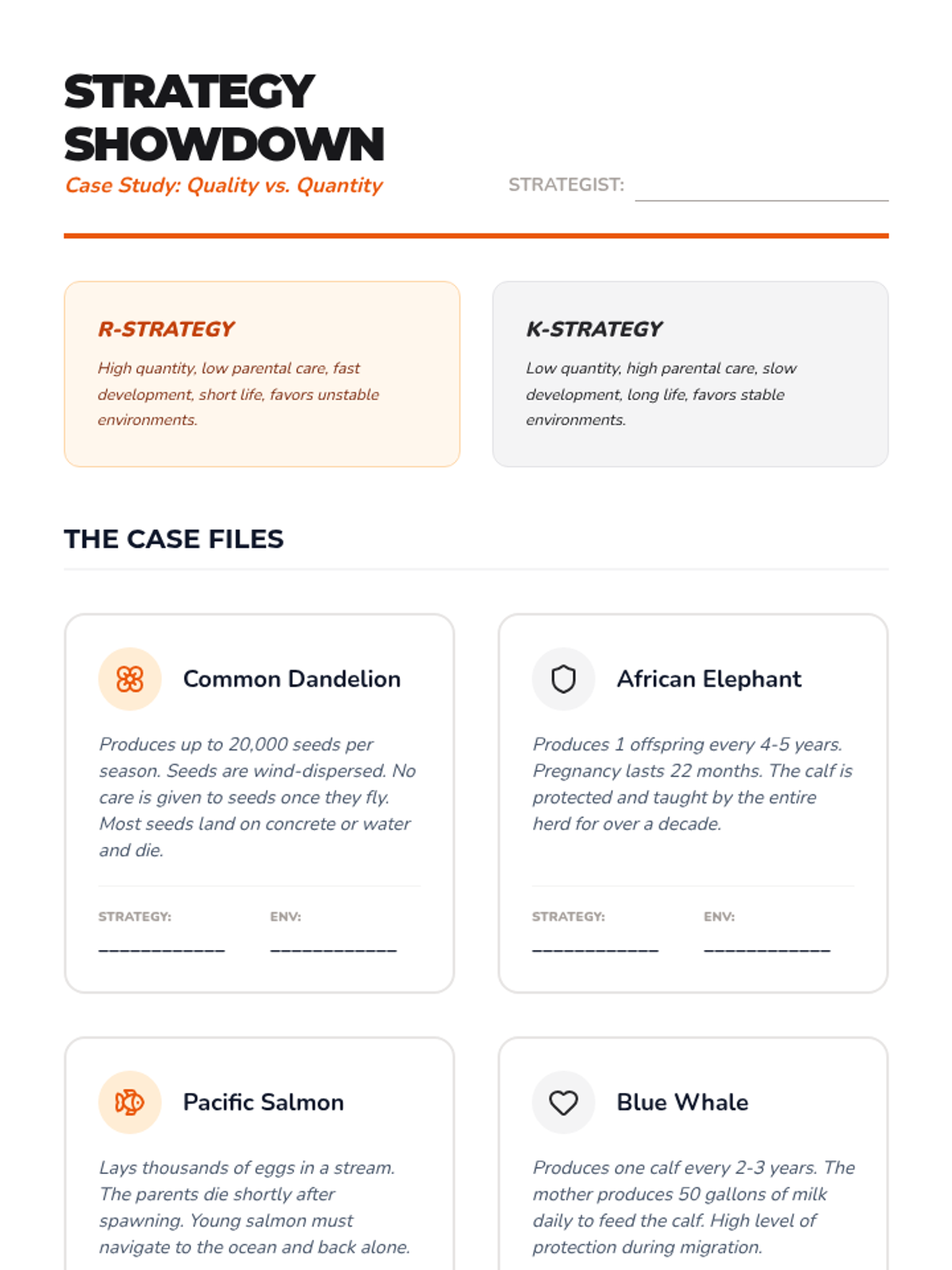 Compare r-selection and K-selection strategies (quality vs. quantity) through case studies of diverse organisms from sea turtles to gorillas.