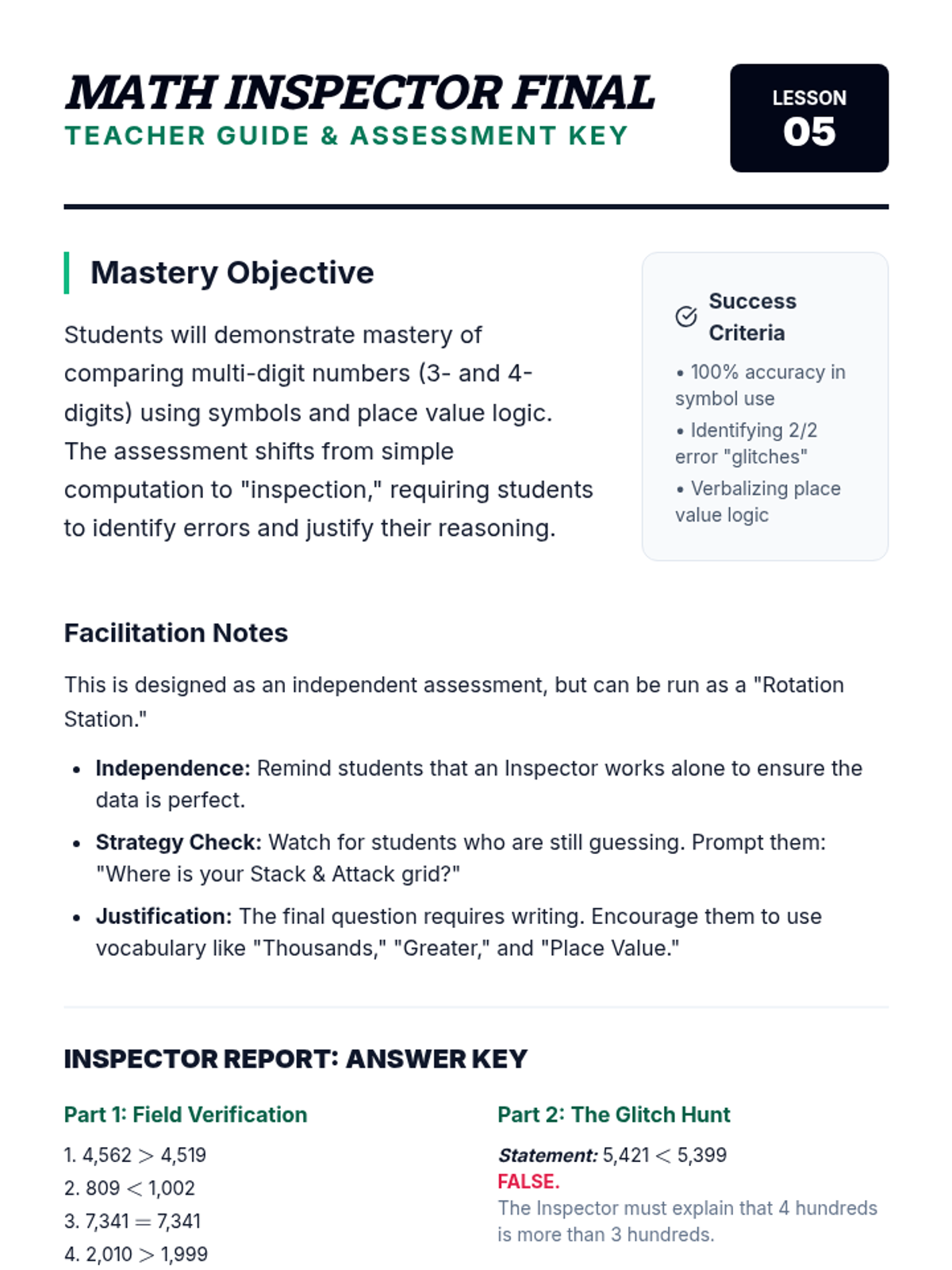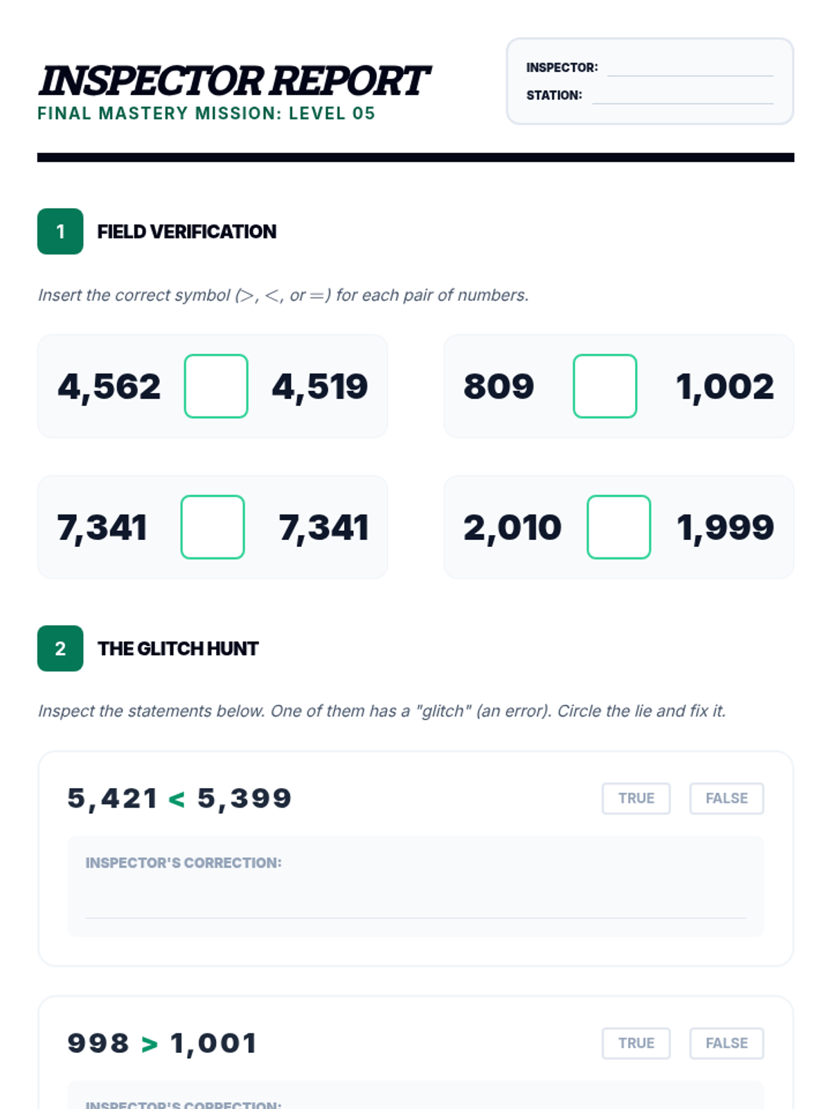 A cumulative assessment where students act as 'Math Inspectors' to verify and correct comparison statements.