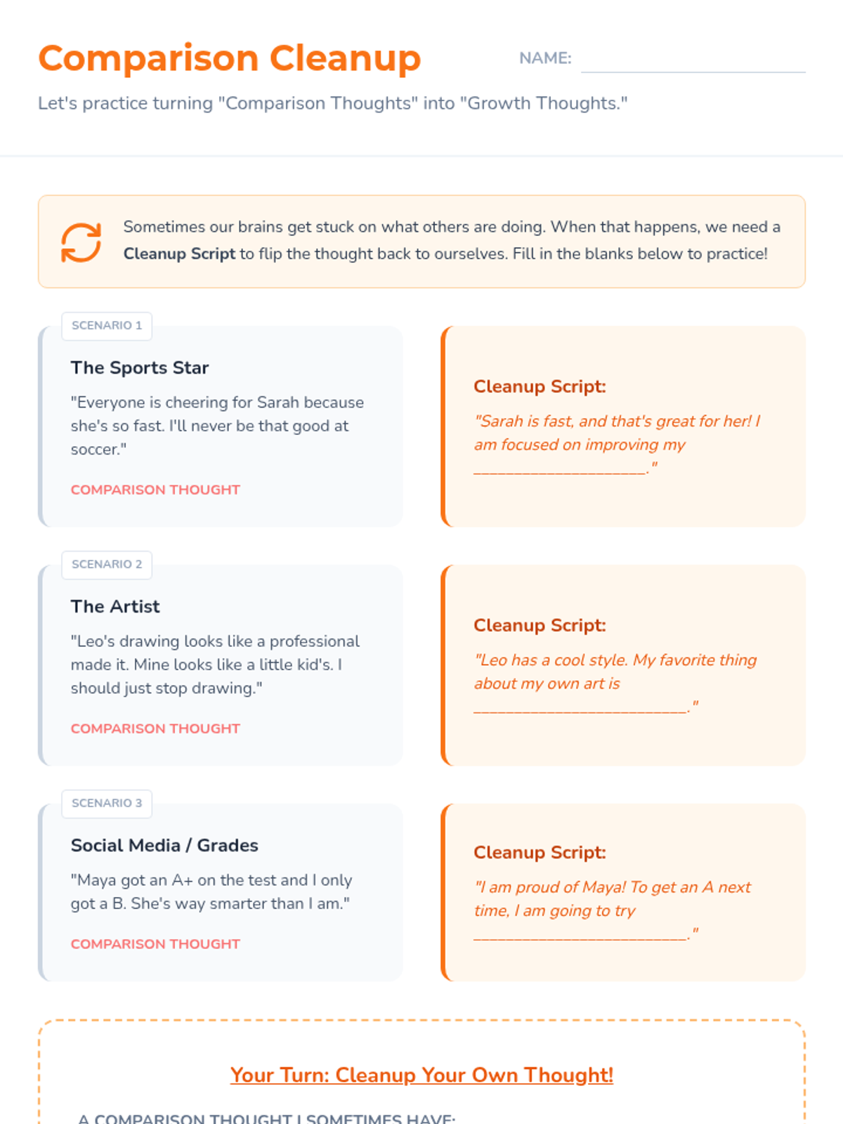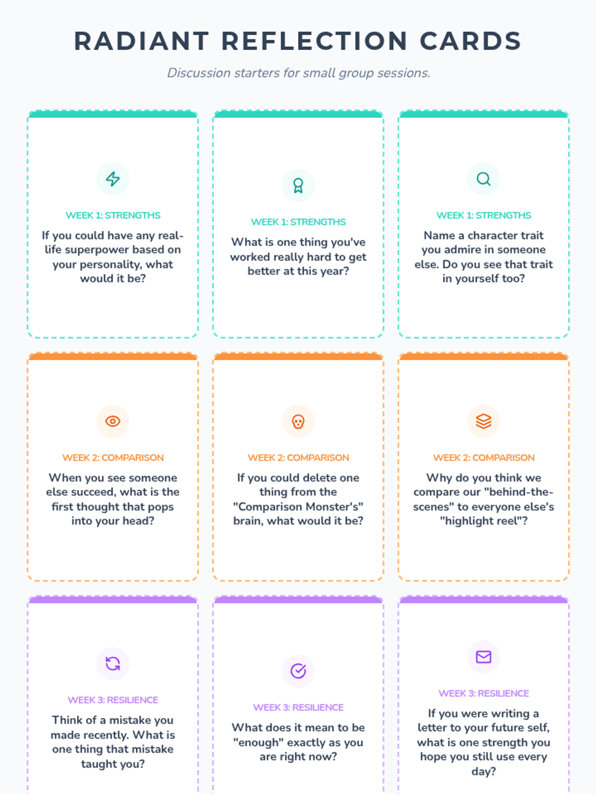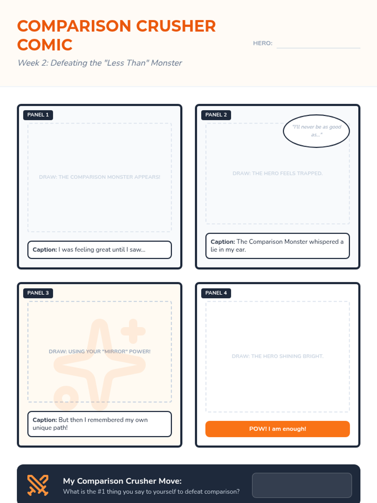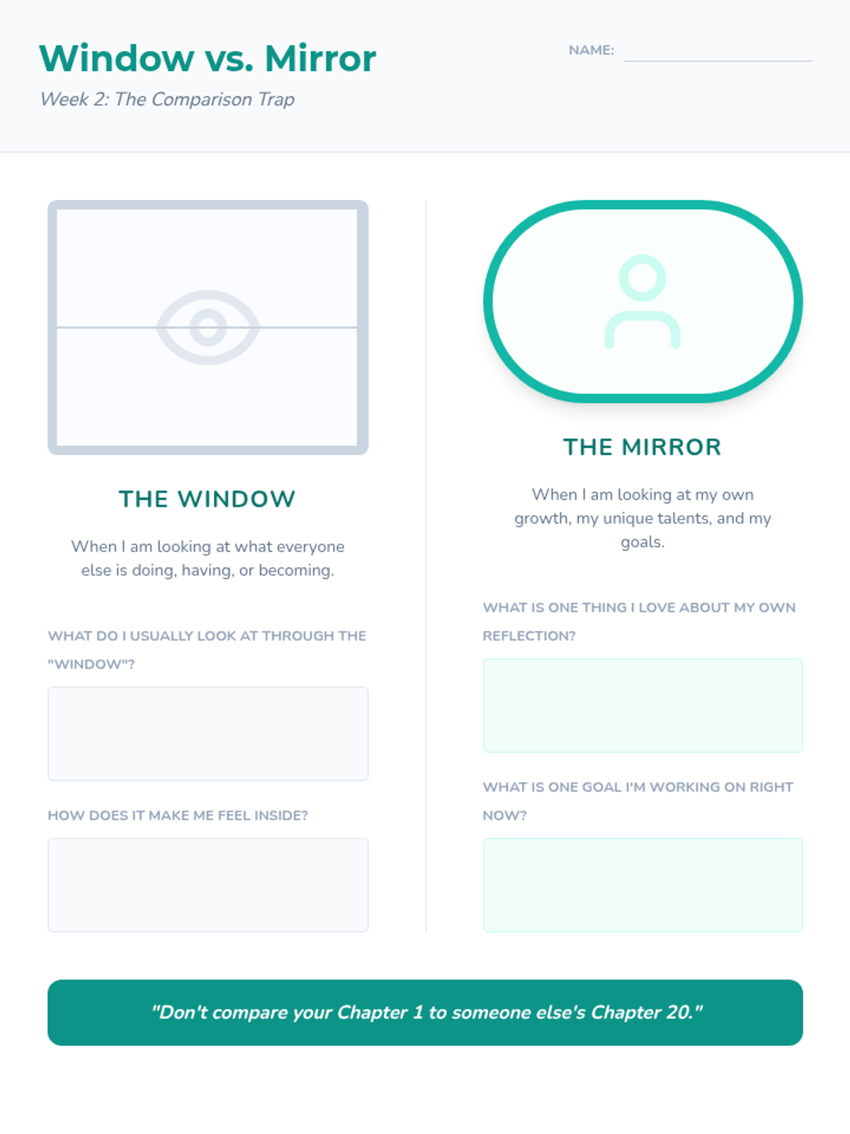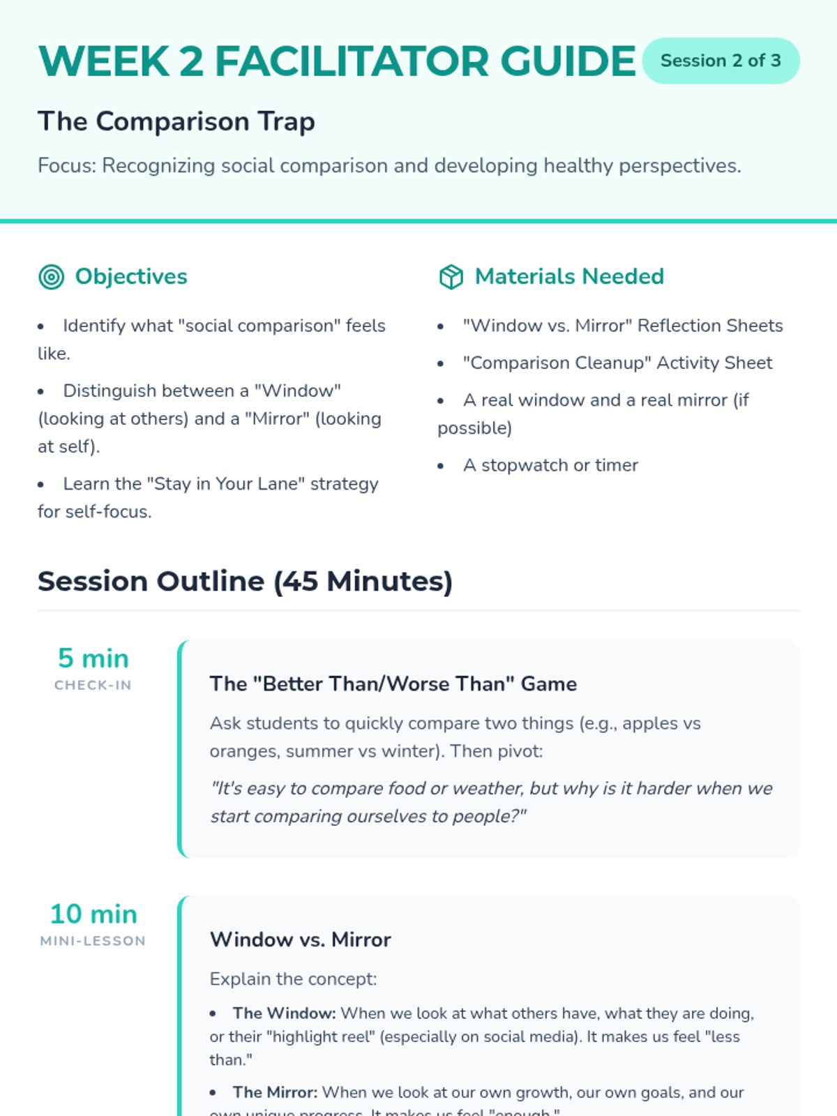 Week two addresses the 'comparison trap,' teaching students to recognize when they are comparing themselves to others and providing tools to refocus on their own progress.
