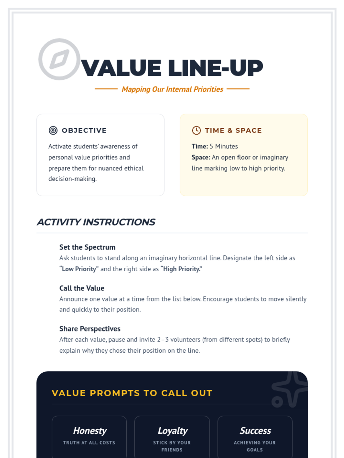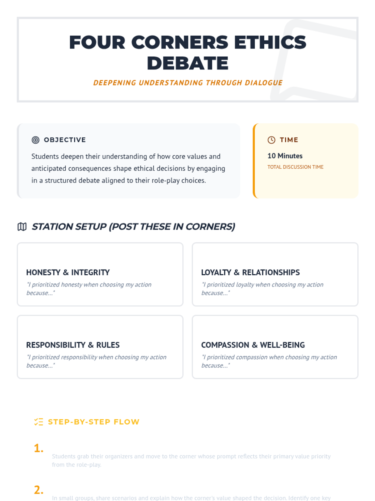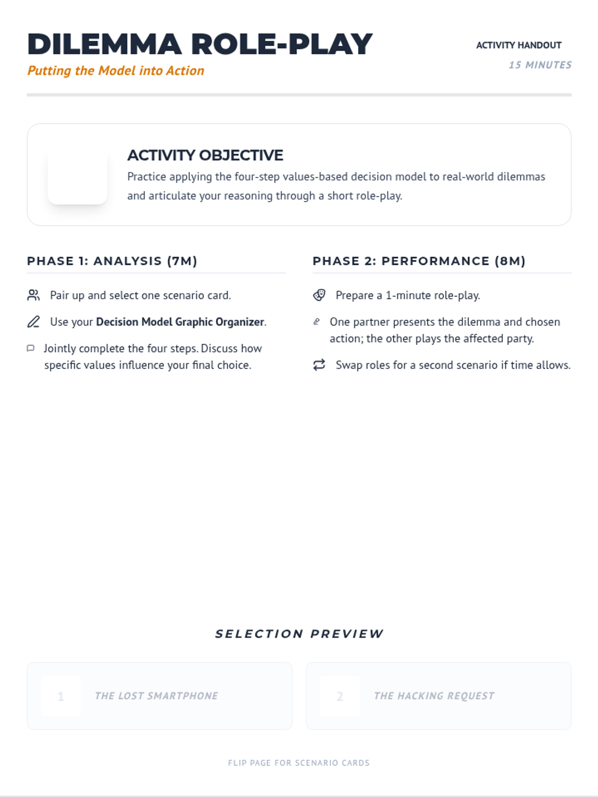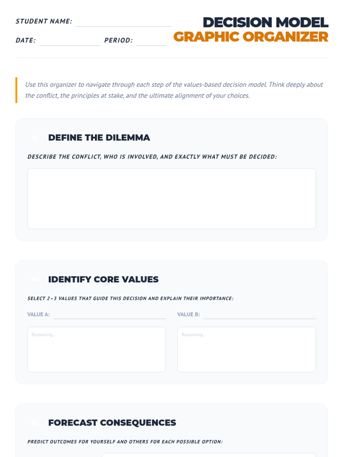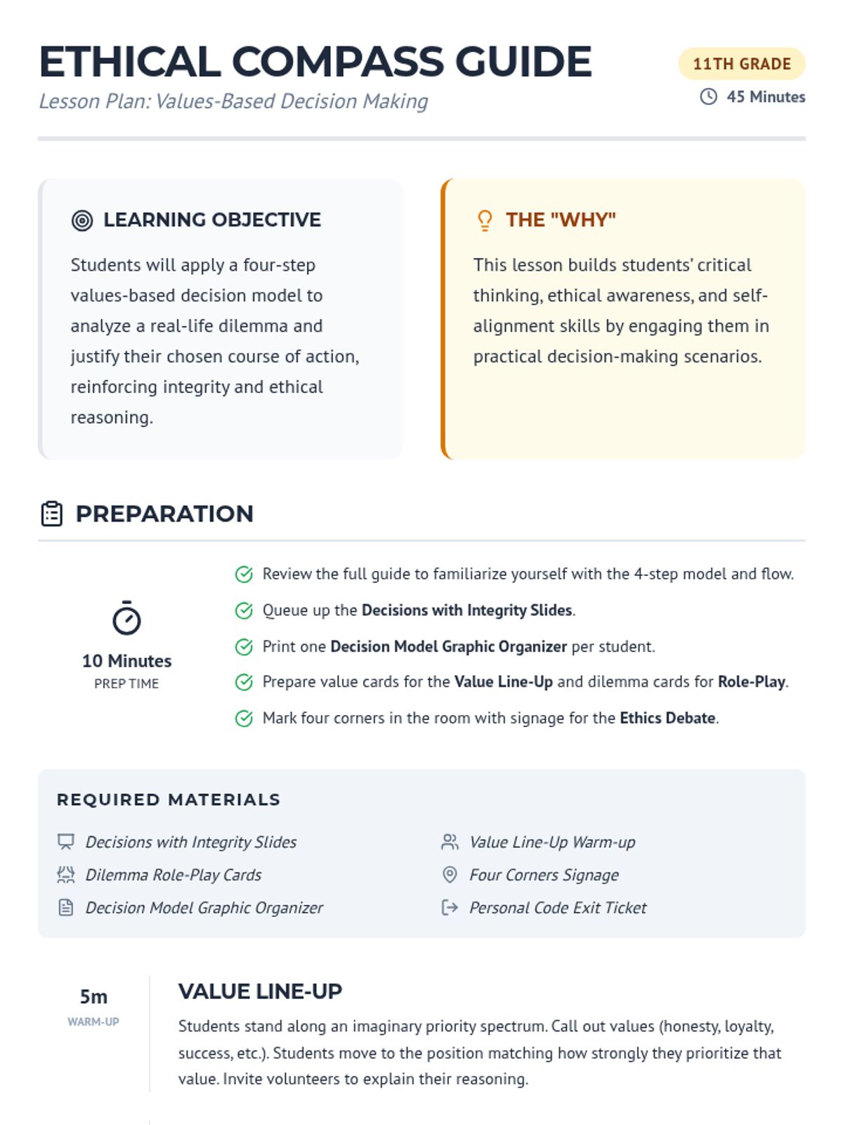 A 45-minute 11th-grade lesson where students use a four-step values-based decision model to analyze ethical dilemmas and justify their choices through interactive role-play and debate.