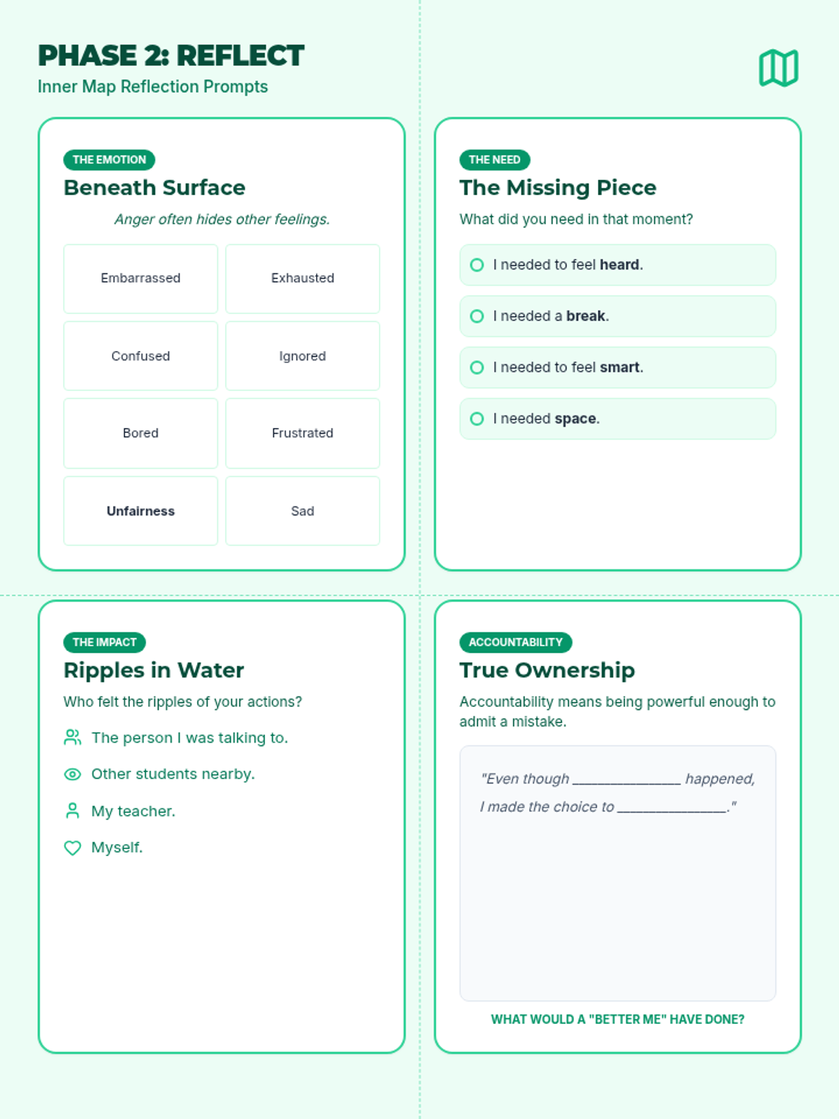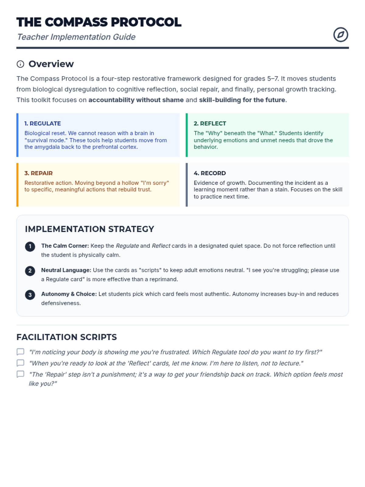 A comprehensive toolkit for middle schoolers to navigate behavioral challenges using the Regulate, Reflect, Repair, and Record framework. Focuses on restorative practices and emotional intelligence.