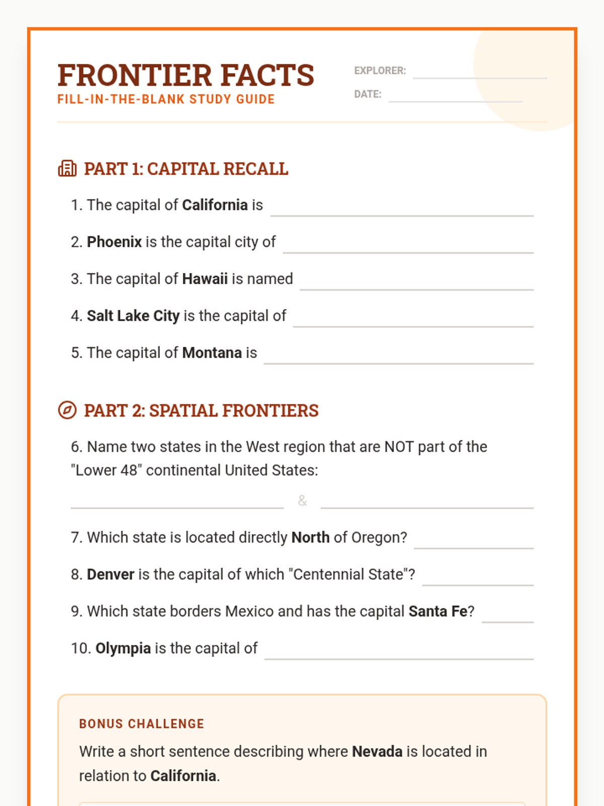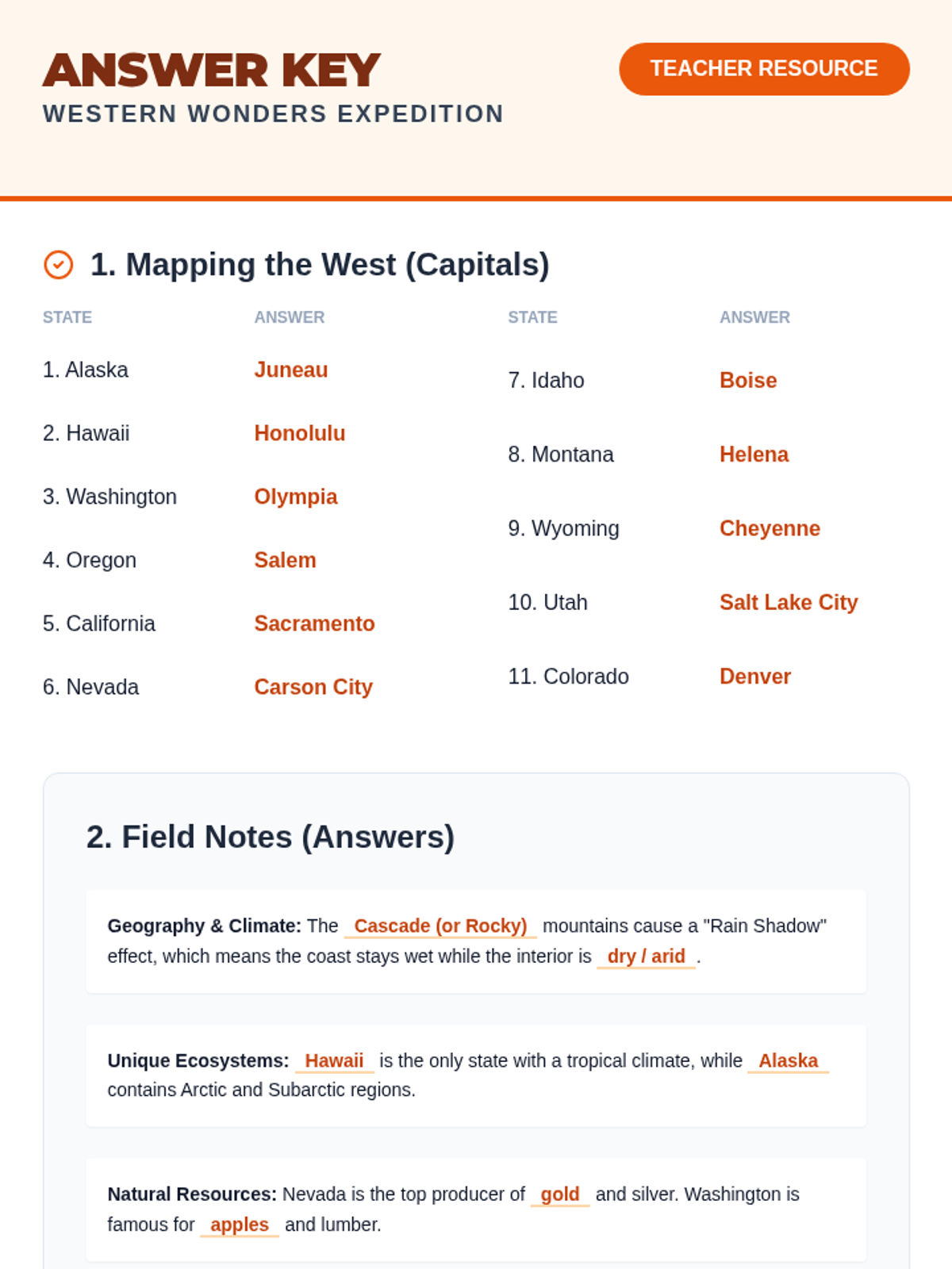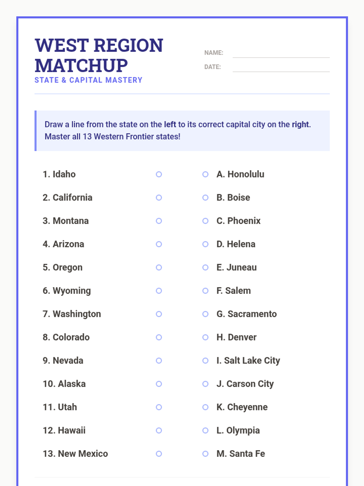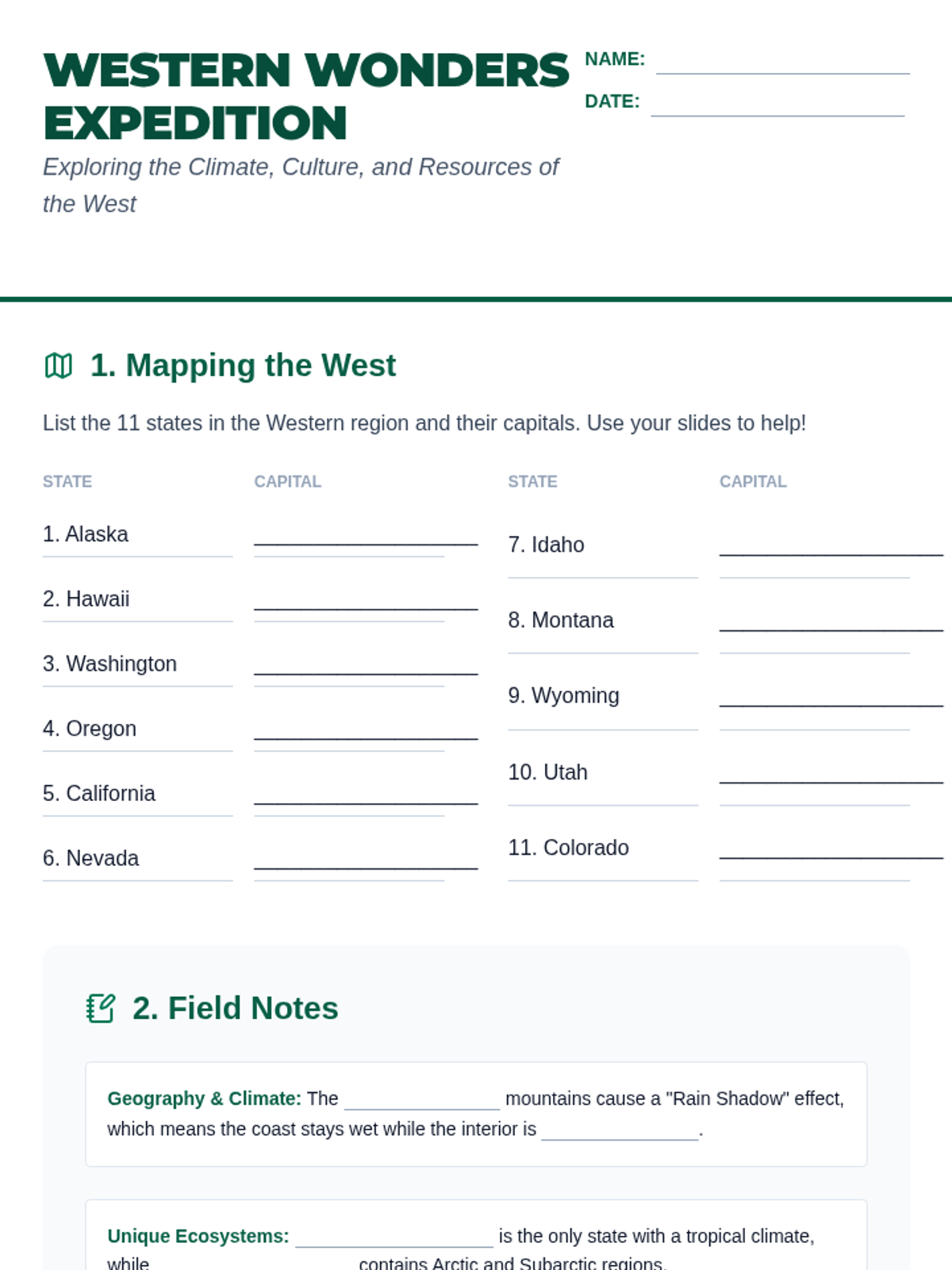A comprehensive exploration of the 13 Western US states, focusing on their geographic locations and capital cities. Students will use maps, flashcards, and review activities to master the region's layout.