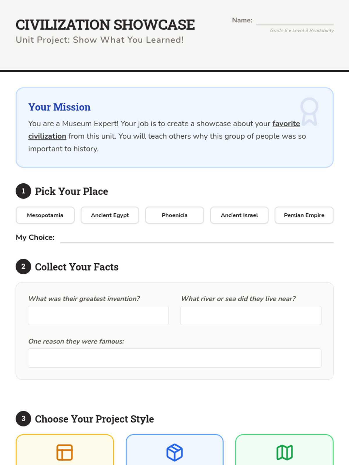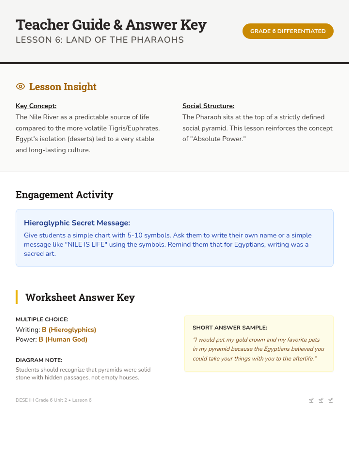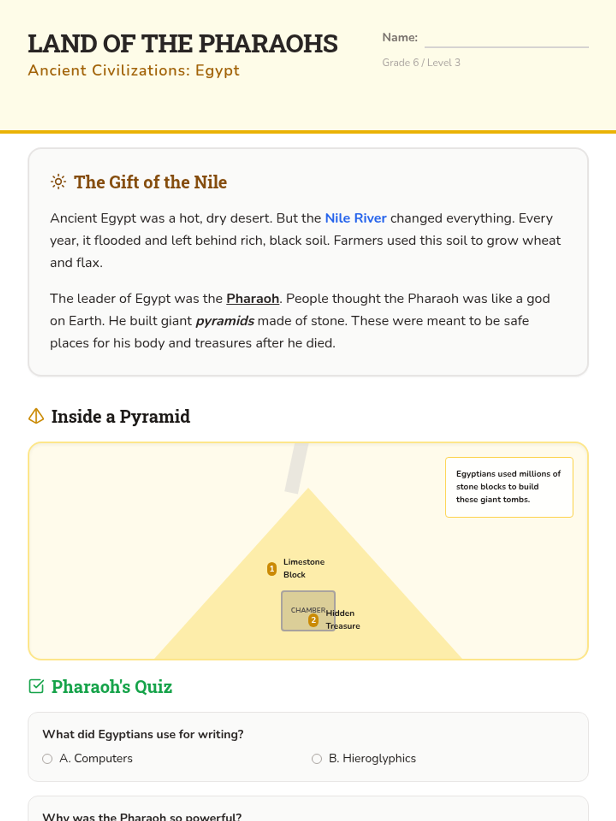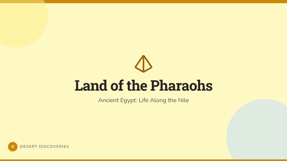 Focuses on Ancient Egypt, the importance of the Nile River, the power of Pharaohs, and the building of the pyramids.