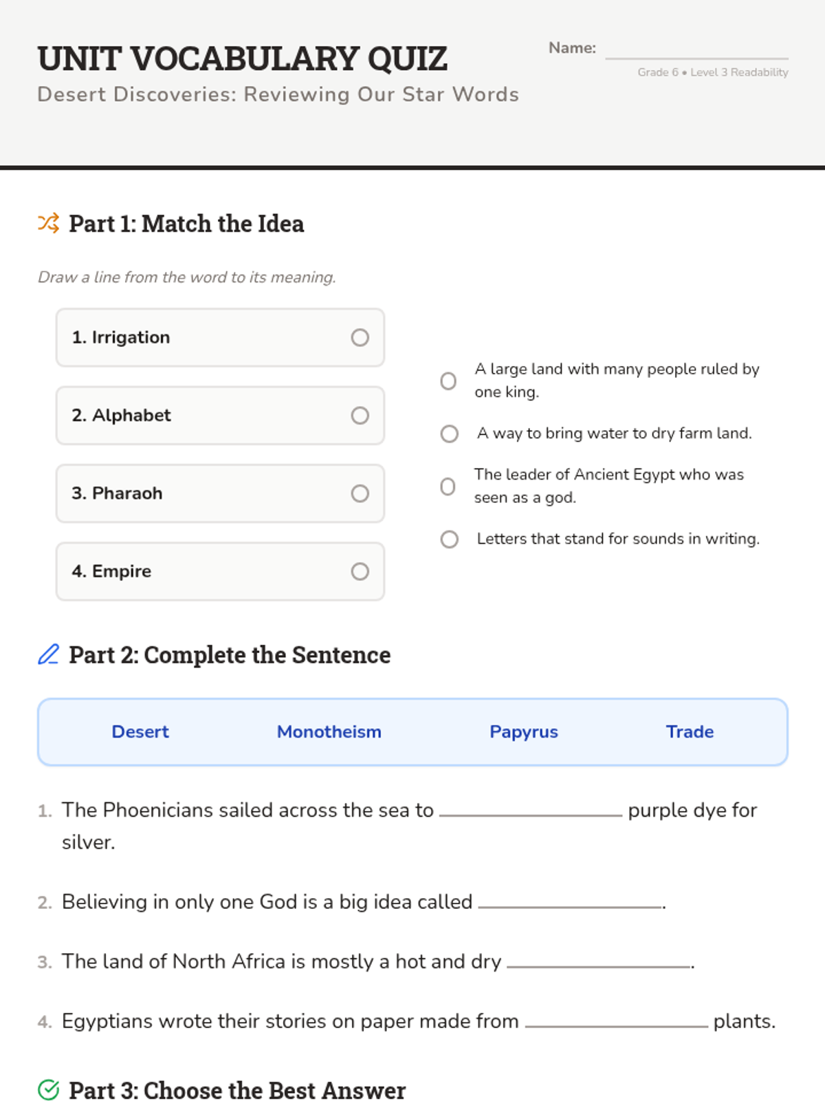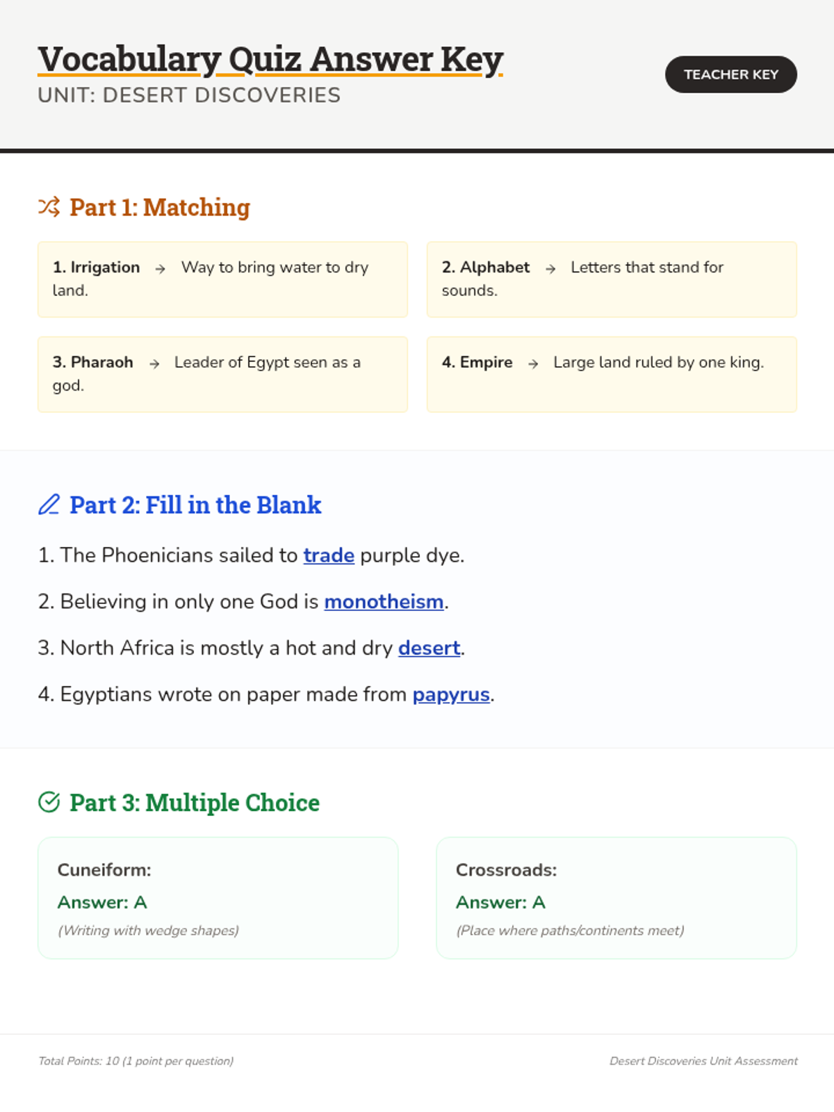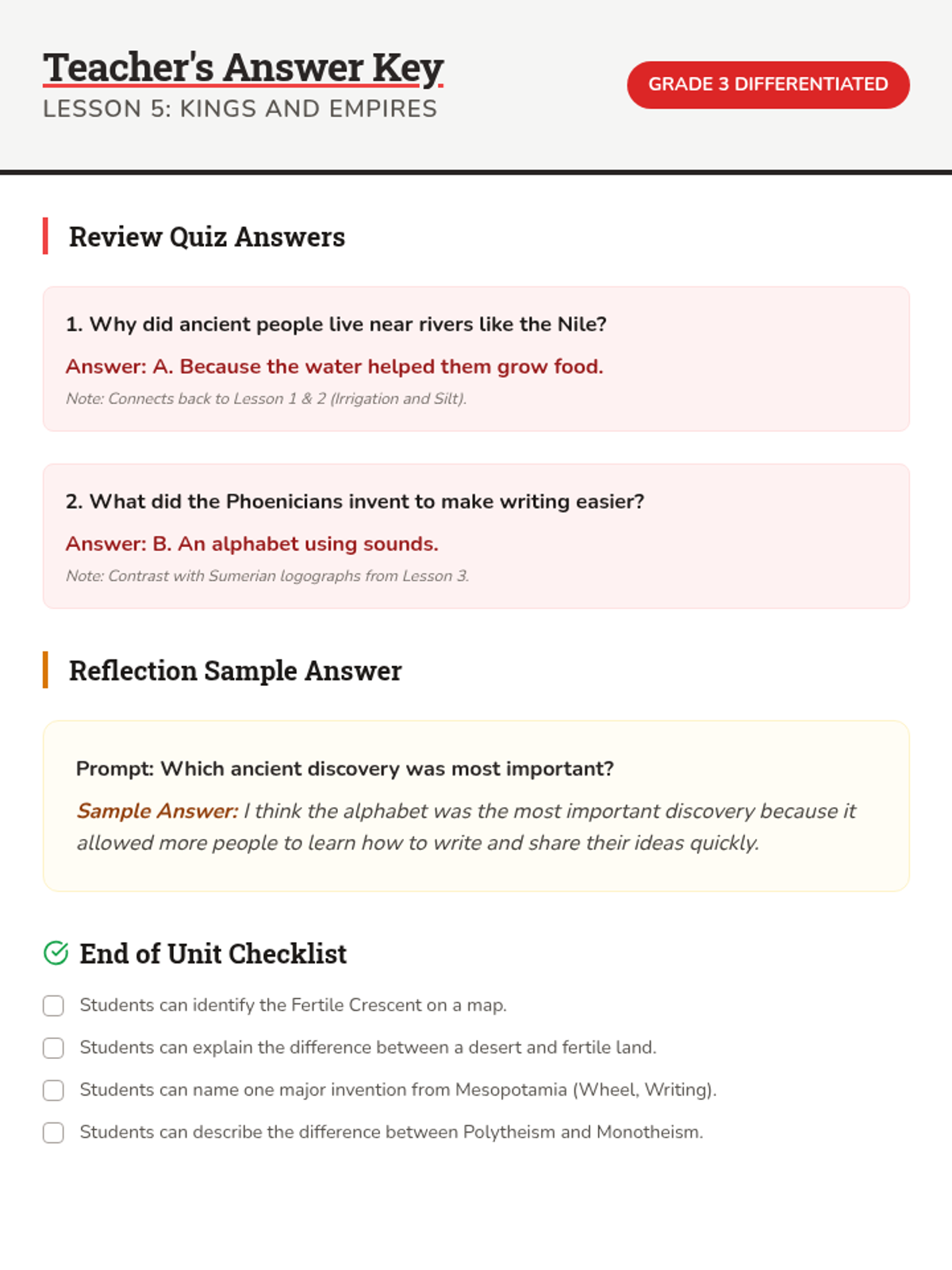 Focuses on Ancient Egypt, the importance of the Nile River, the power of Pharaohs, and the building of the pyramids.