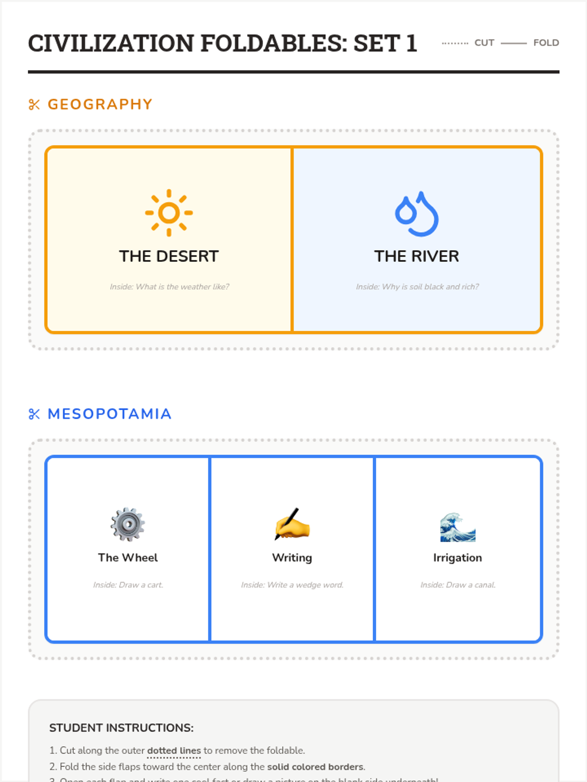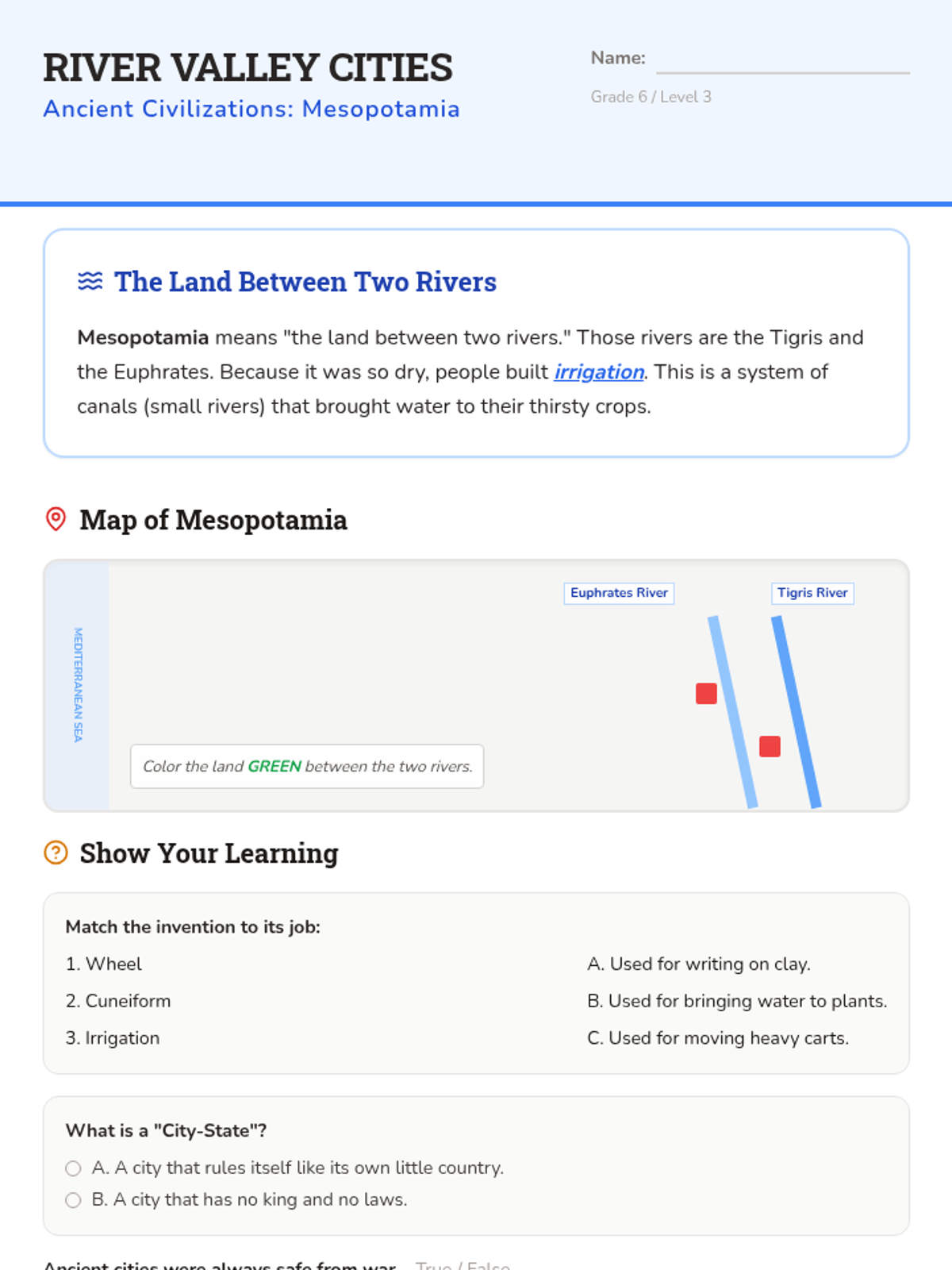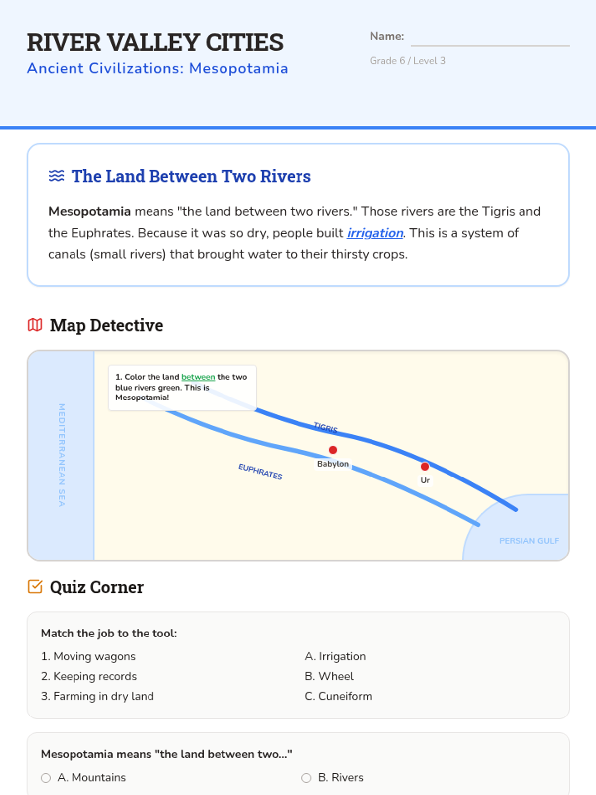 Explores the rise of the first civilizations in Mesopotamia, focusing on irrigation, city-states, and the invention of writing.