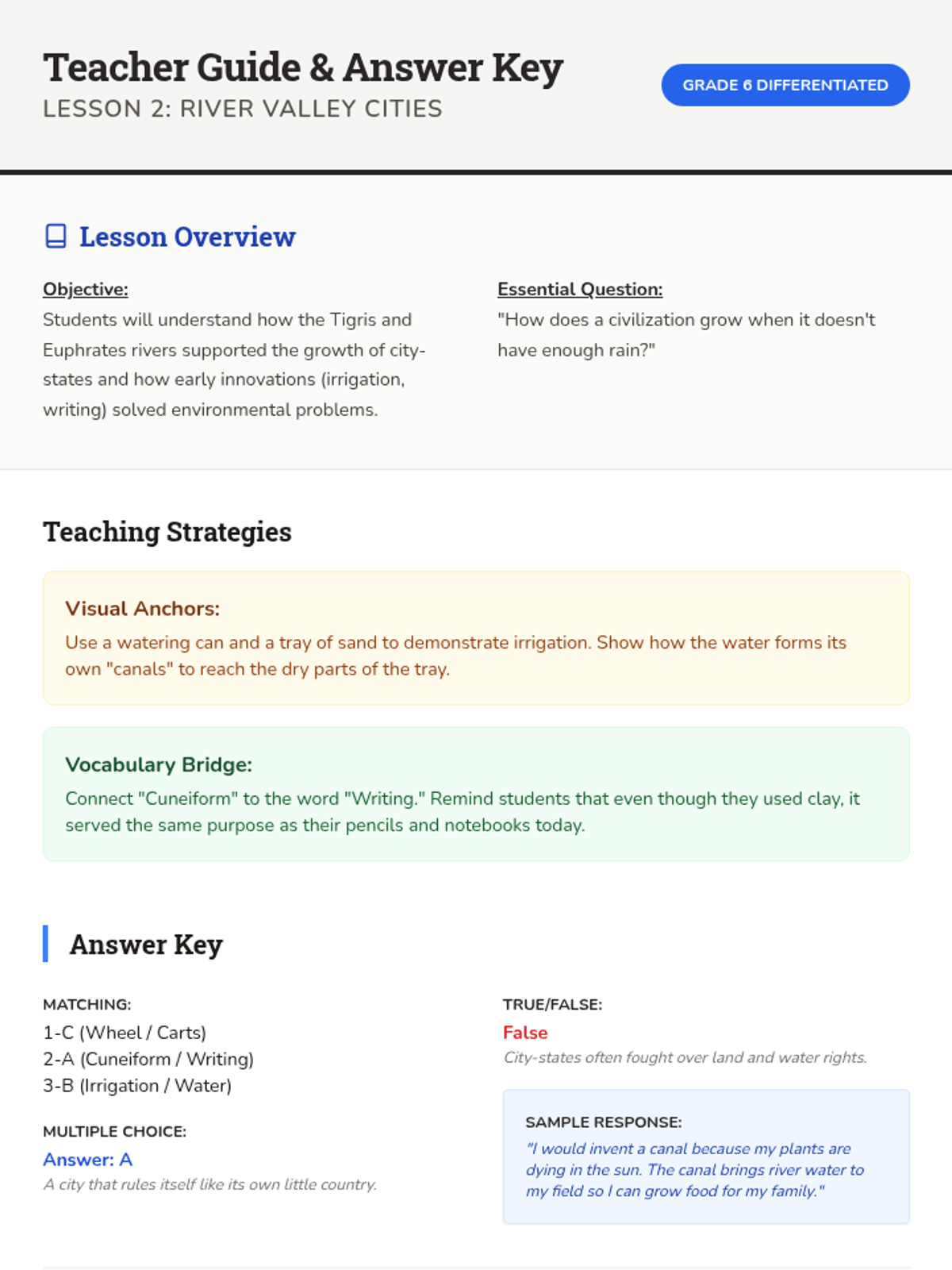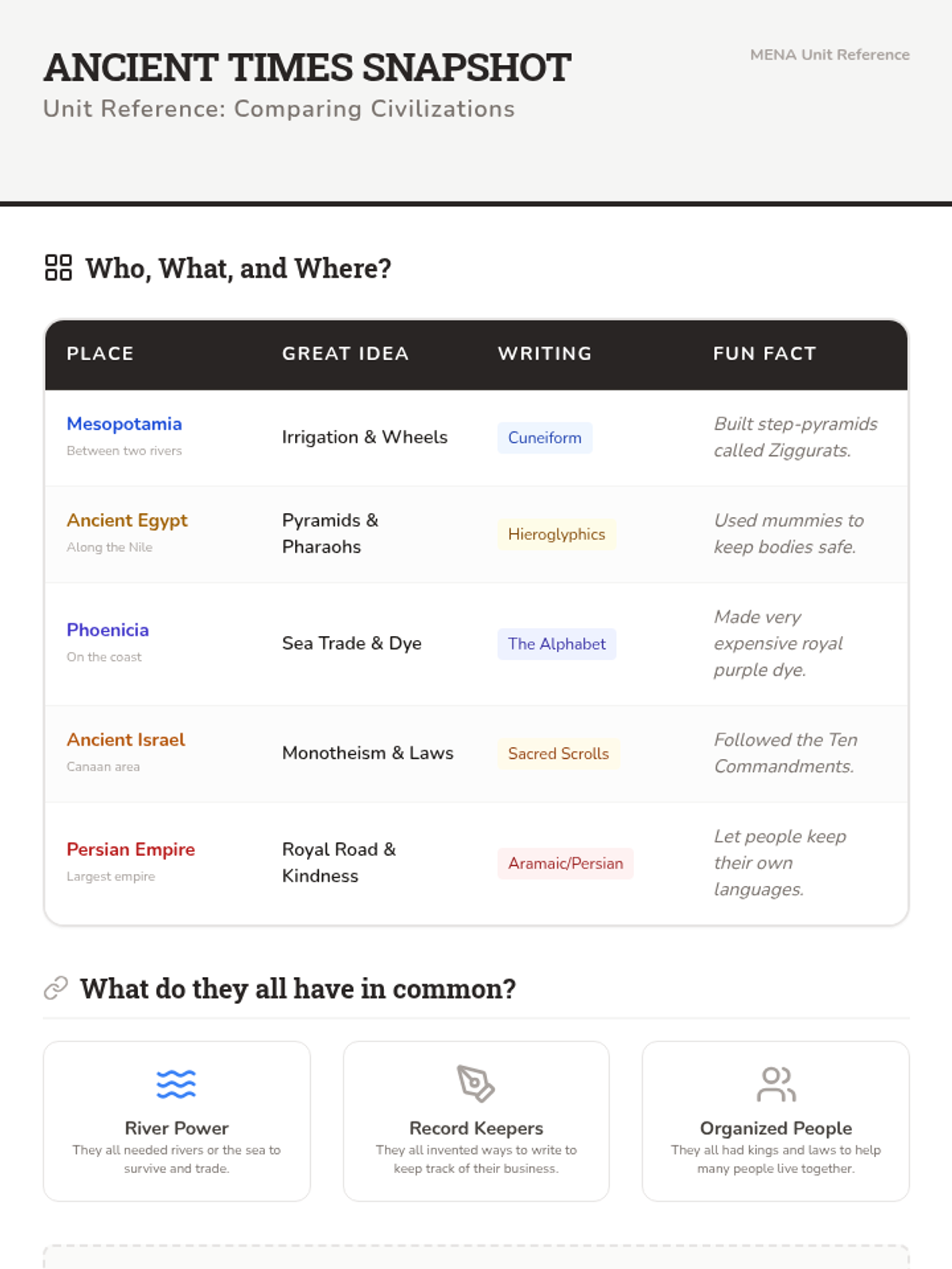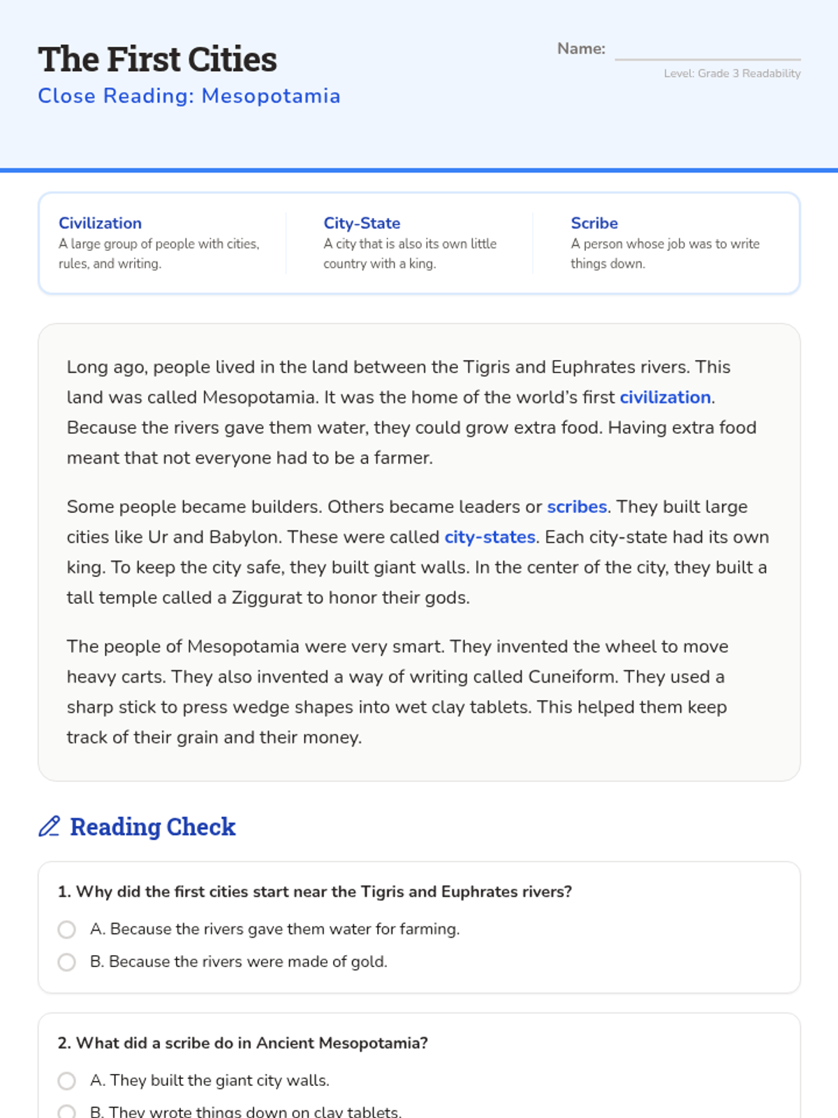 Explores the rise of the first civilizations in Mesopotamia, focusing on irrigation, city-states, and the invention of writing.