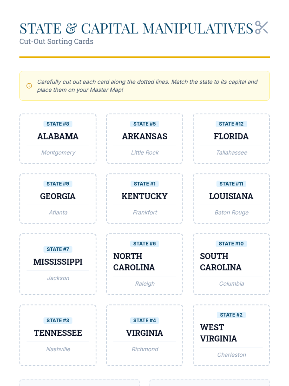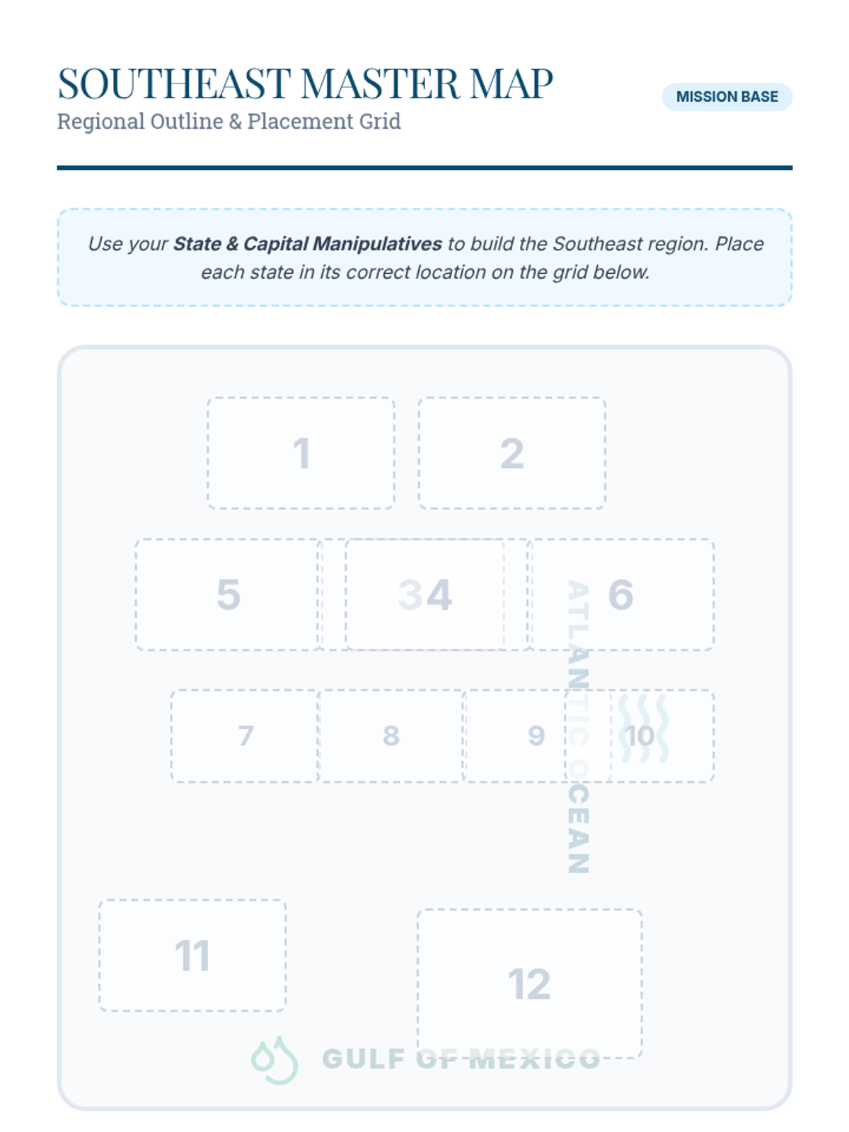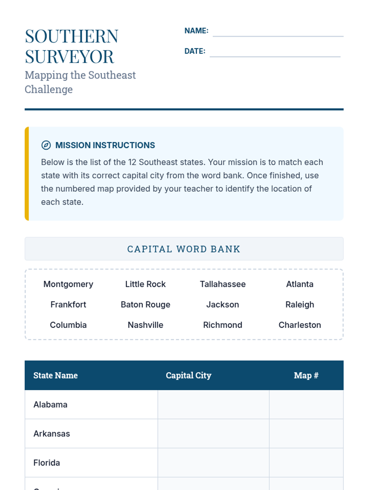 A comprehensive lesson on identifying and mapping the states and capitals of the Southeast region of the United States. Students will explore geographic features, state locations, and regional identity through visual presentation and hands-on mapping.