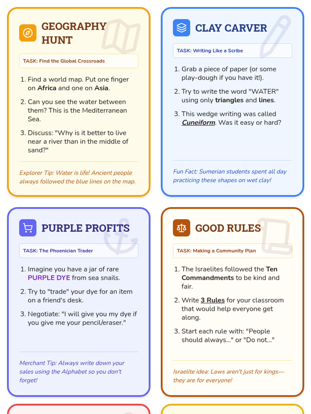 A hands-on introduction to using a compass rose and cardinal directions (North, South, East, West) using a town map. Students will learn the 'Never Eat Soggy Waffles' mnemonic and apply their skills to navigate a fictional town.