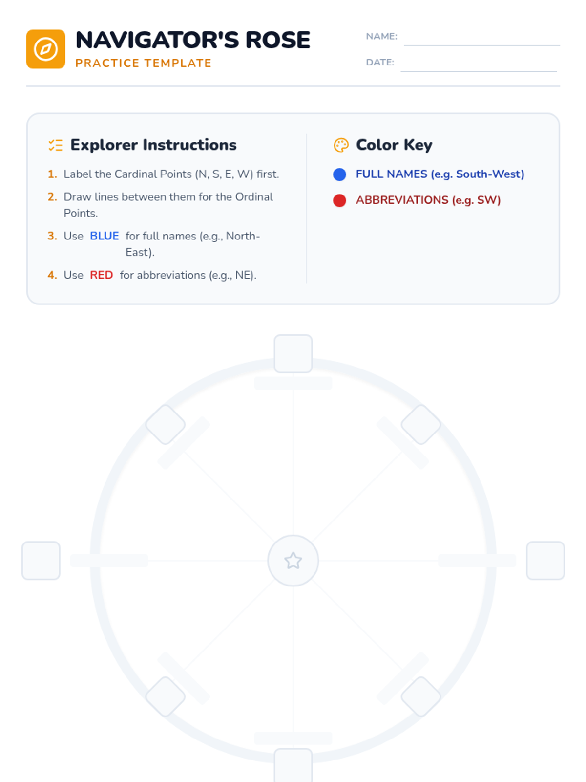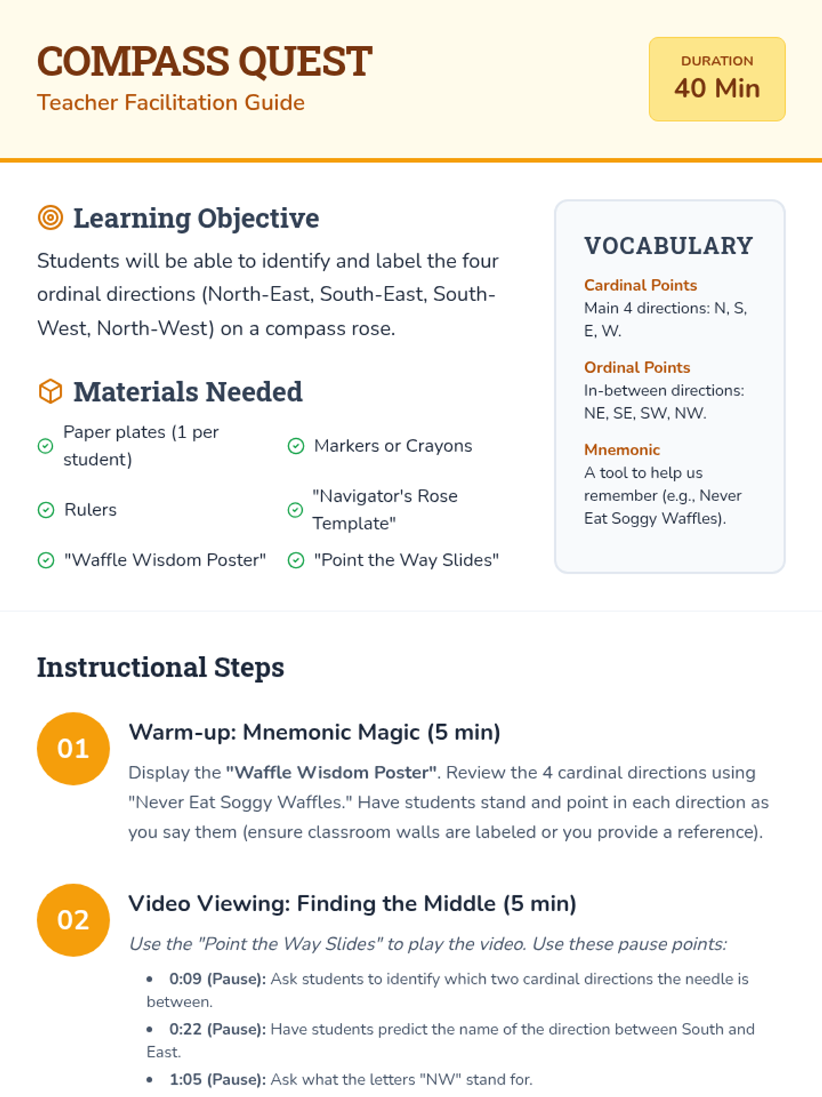 A 2nd-grade geography lesson where students learn to identify and label cardinal and ordinal directions using a mnemonic and a hands-on paper plate compass rose activity.