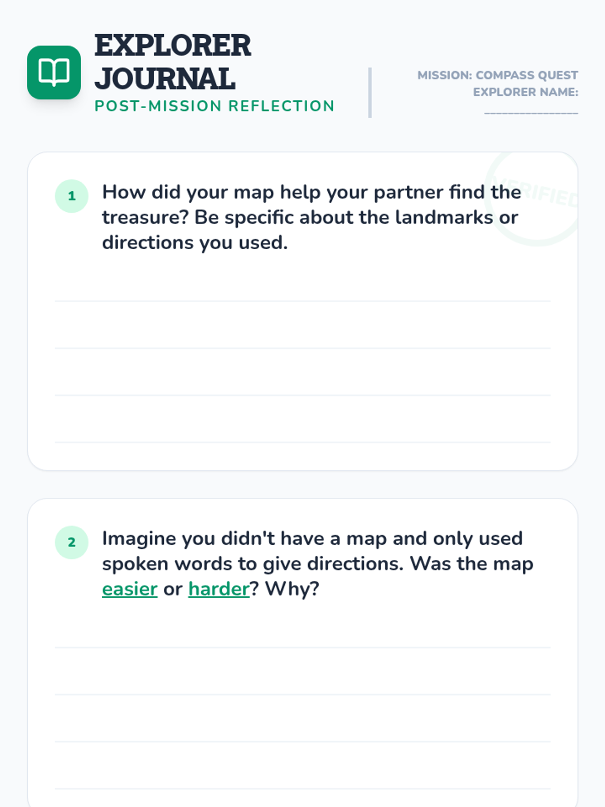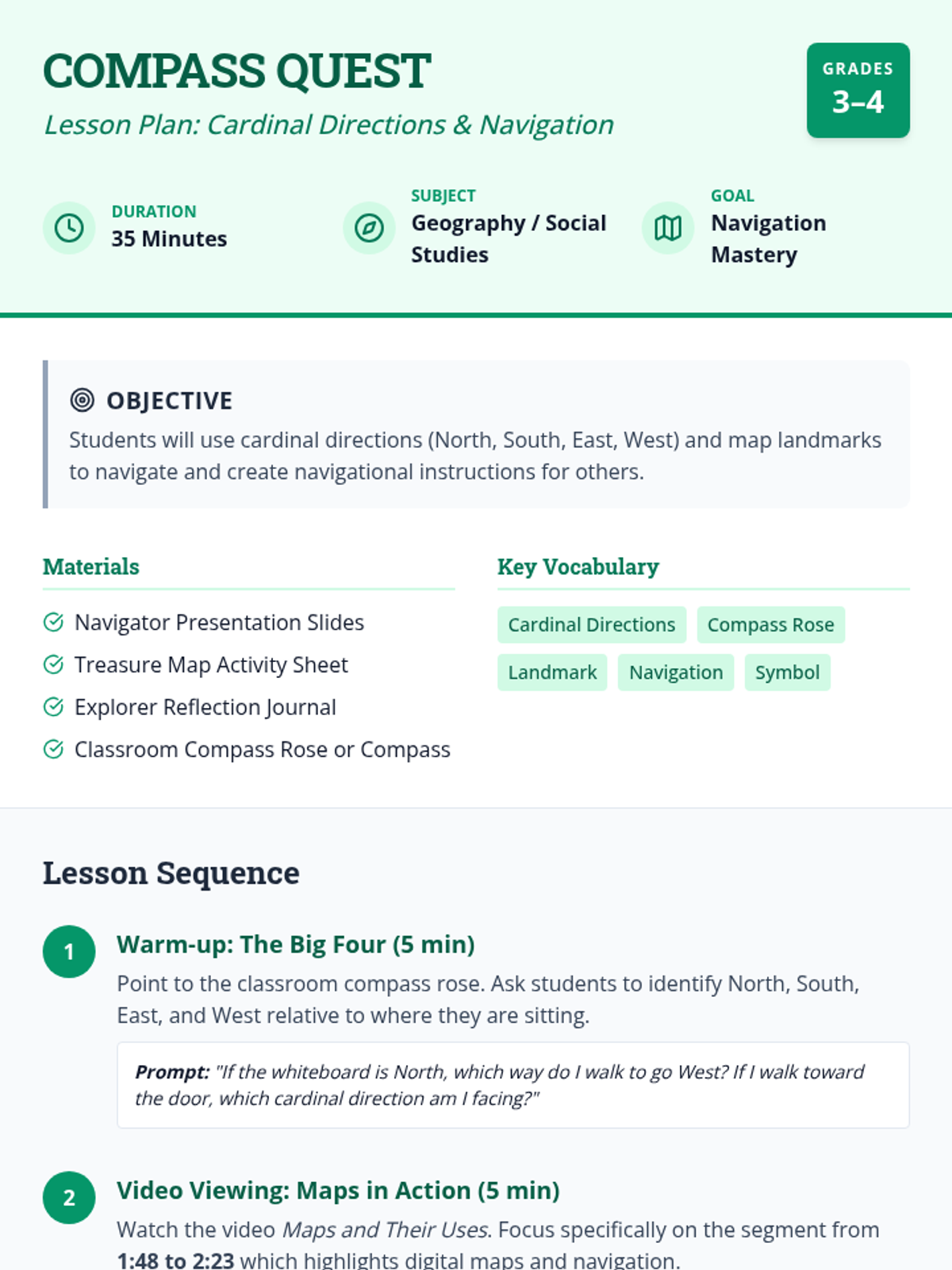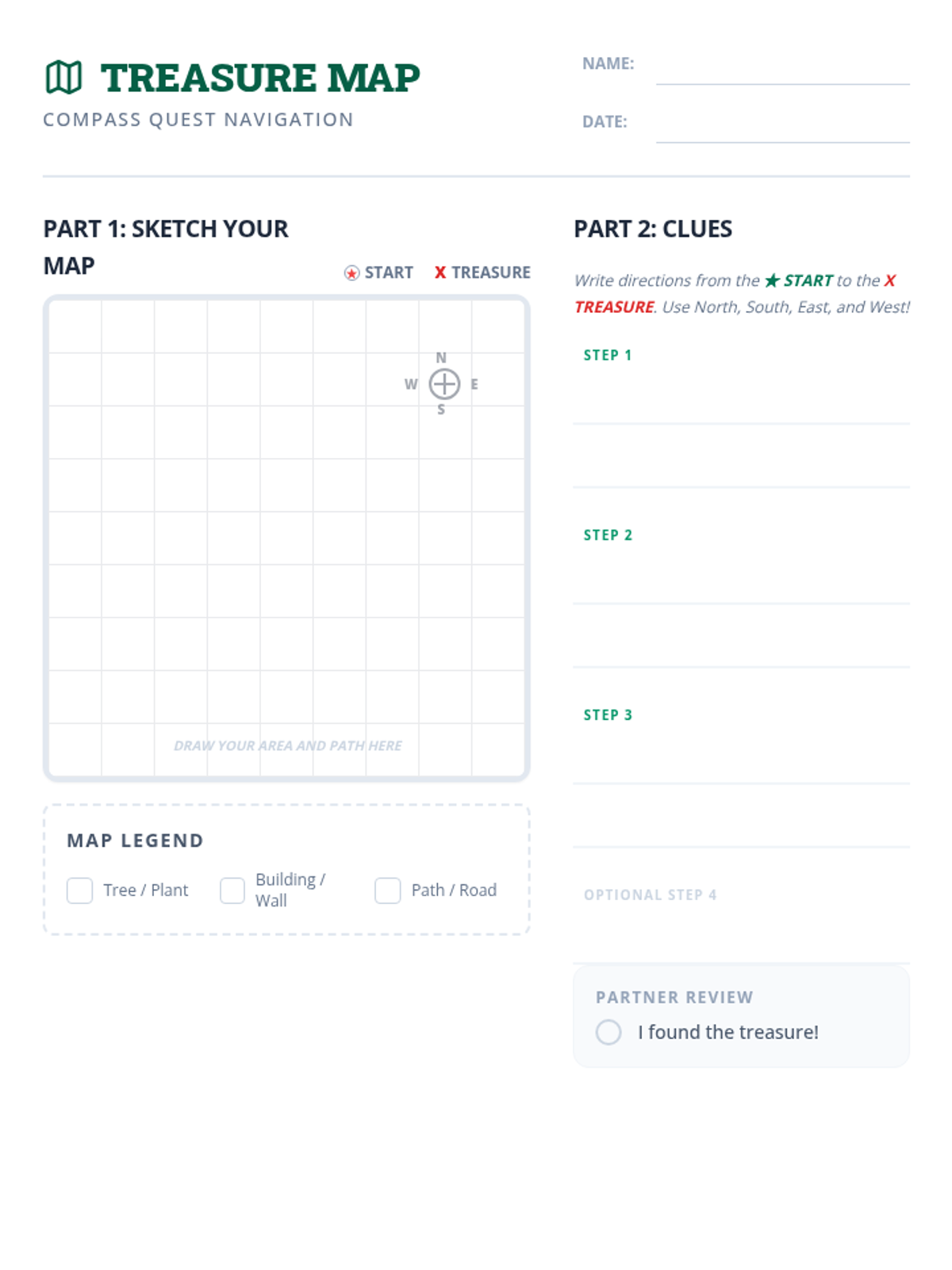 A hands-on geography lesson for 3rd and 4th graders to master cardinal directions and map navigation through a playground treasure hunt. Students explore digital map navigation and create their own directional guides to find hidden 'treasure'.