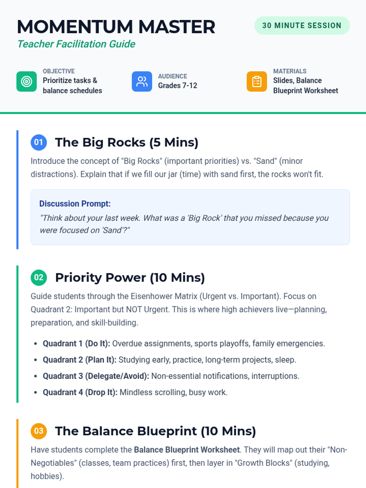 A high-impact 30-minute lesson designed to help students navigate the juggle of academics and extracurricular activities using the Eisenhower Matrix and time-blocking strategies.