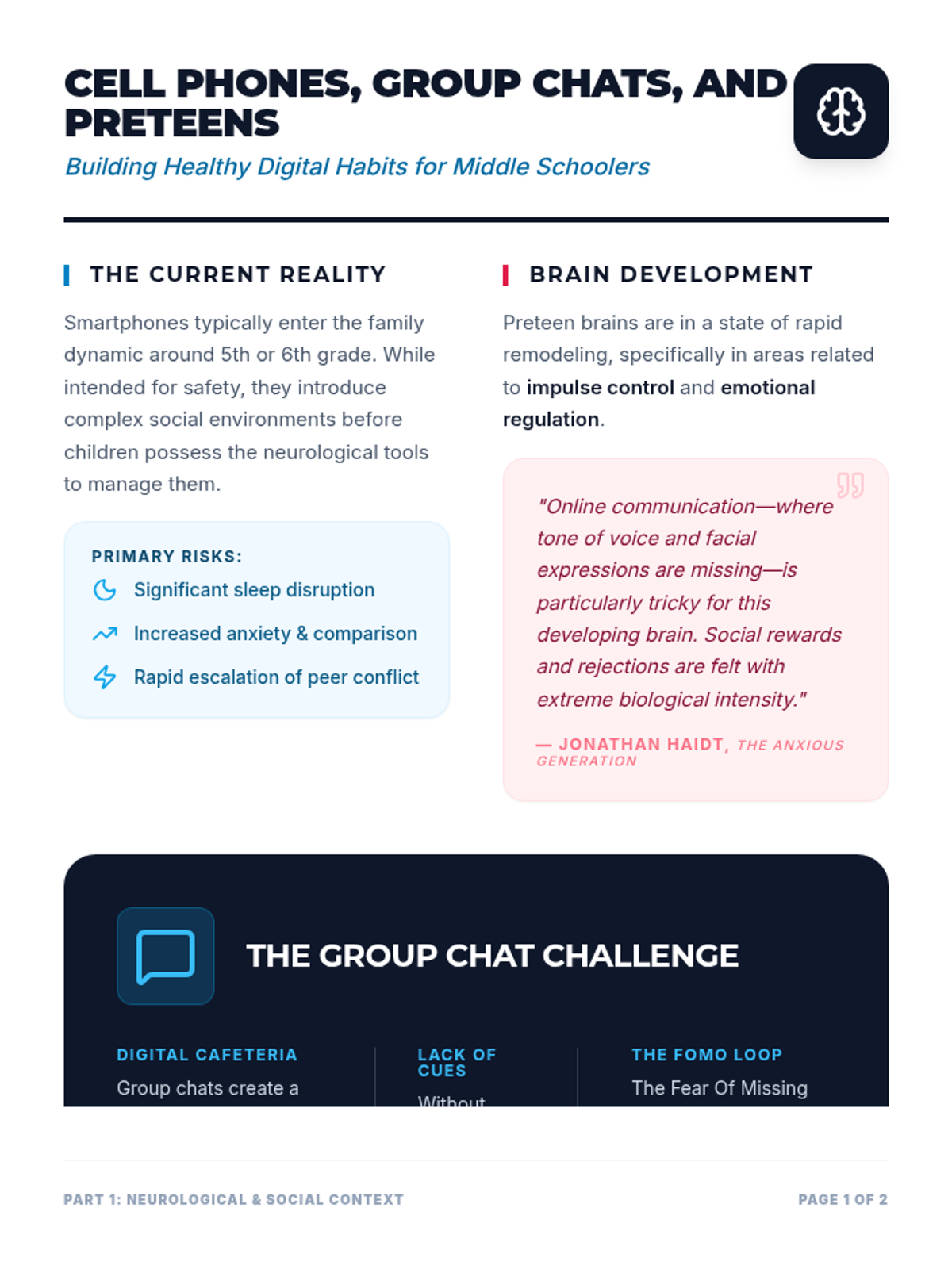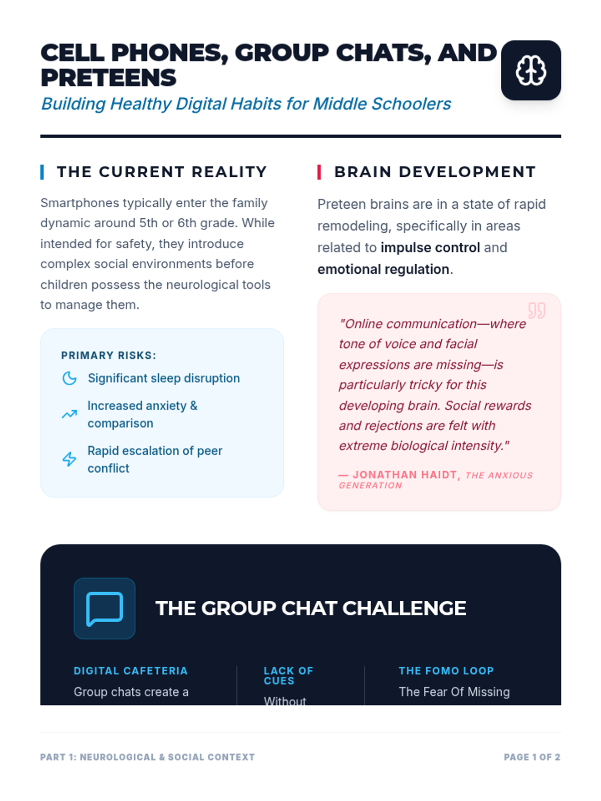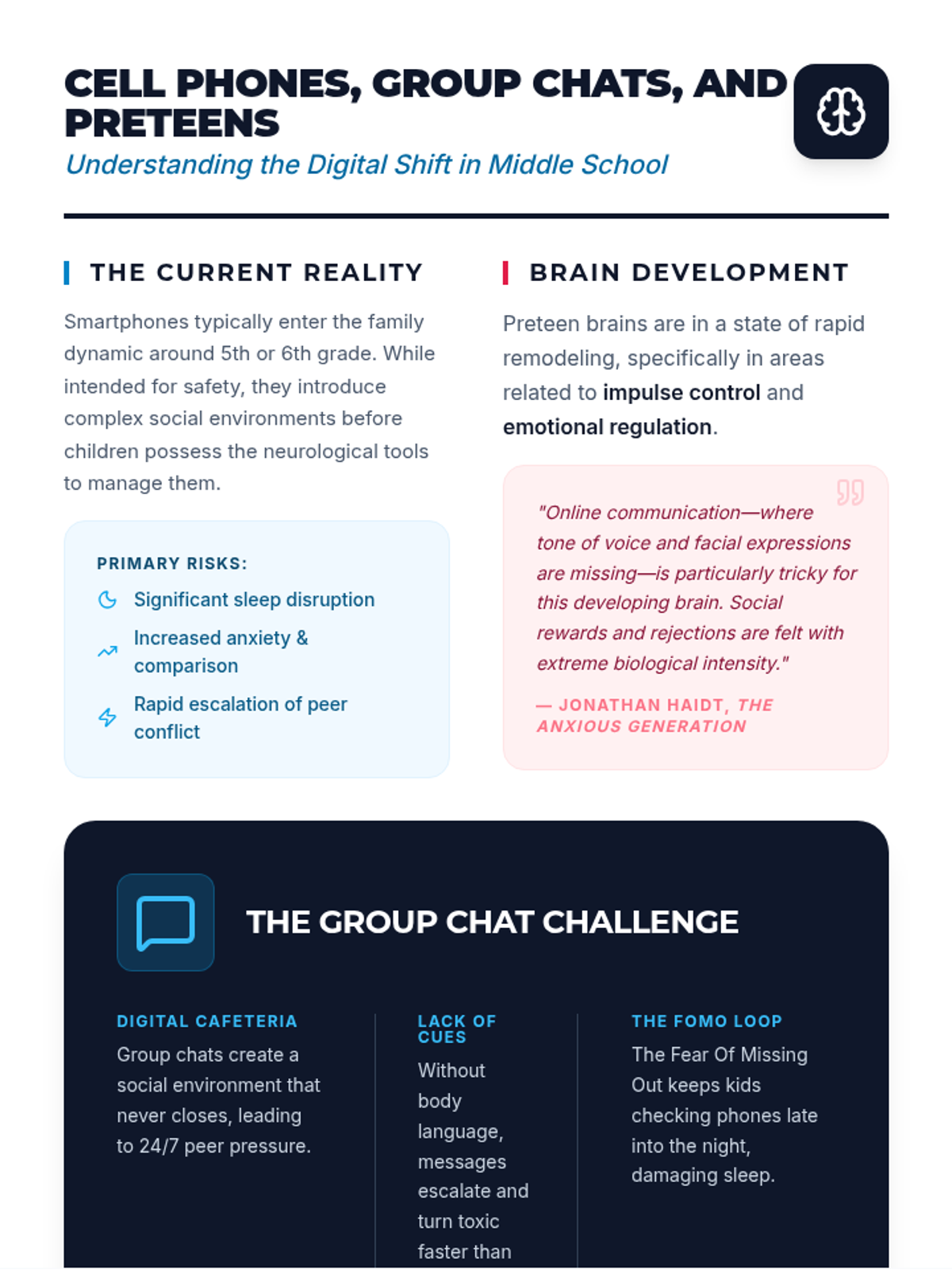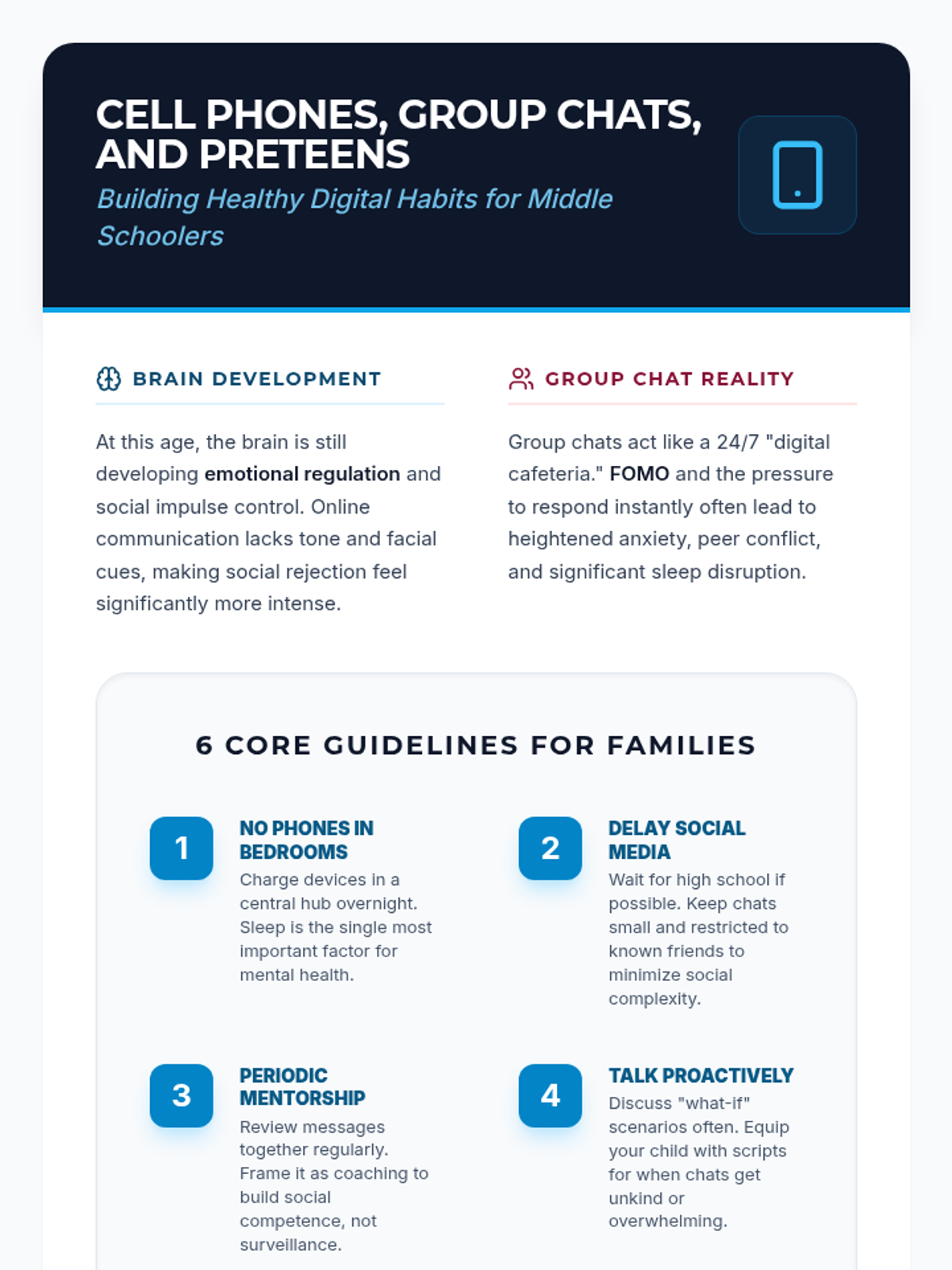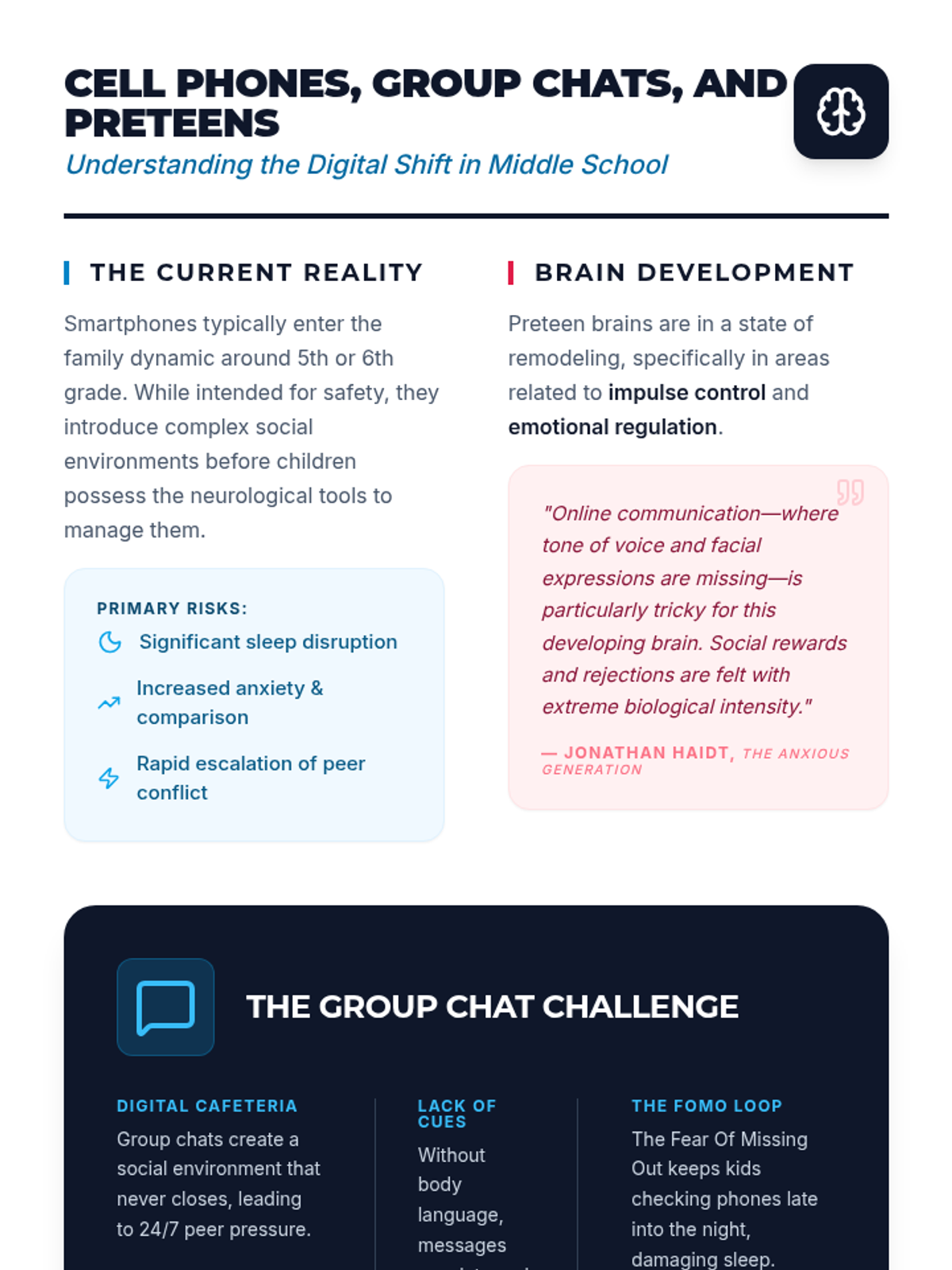 A comprehensive guide for parents of preteens focused on navigating the challenges of cell phones, group chats, and digital social life while fostering healthy development.