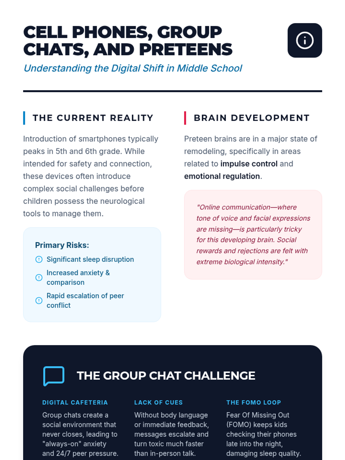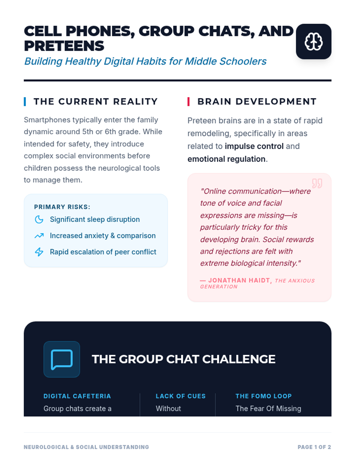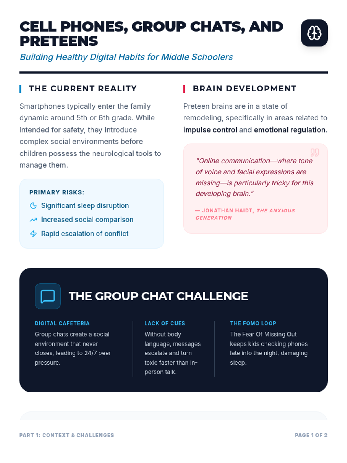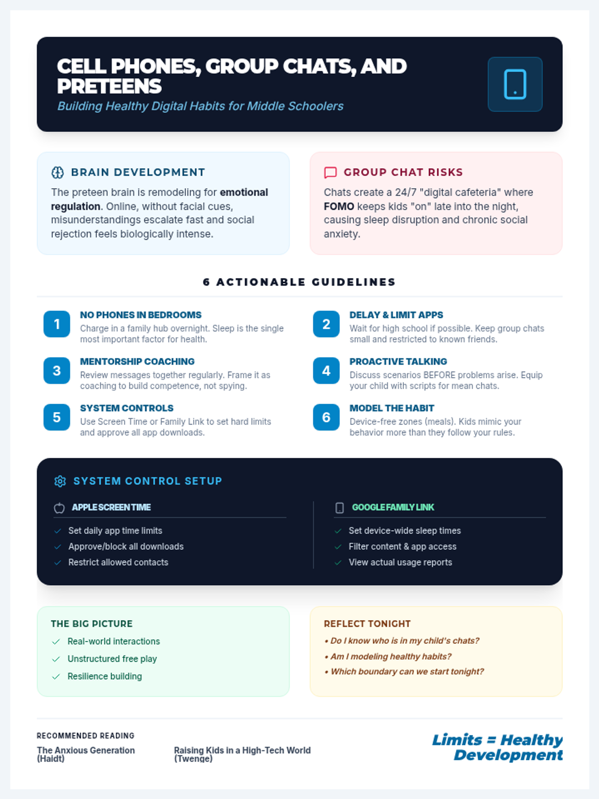 A comprehensive guide for parents of preteens focused on navigating the challenges of cell phones, group chats, and digital social life while fostering healthy development.