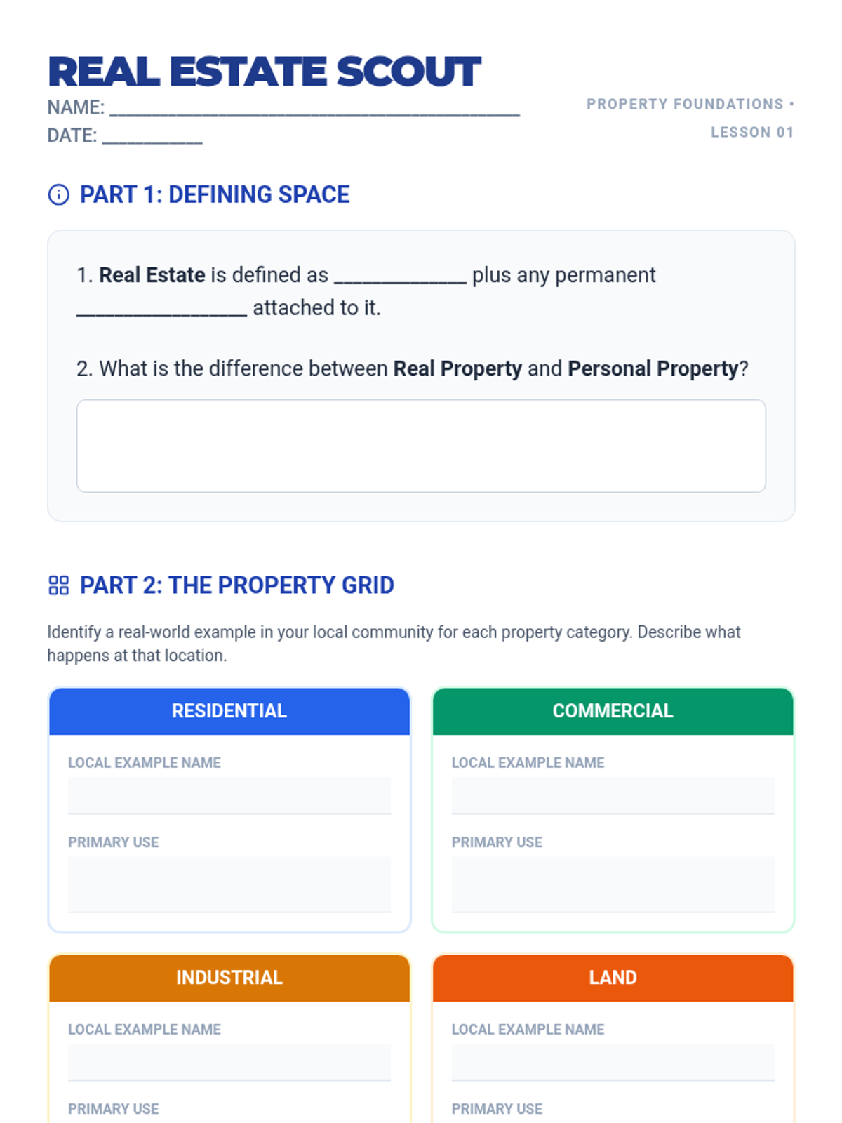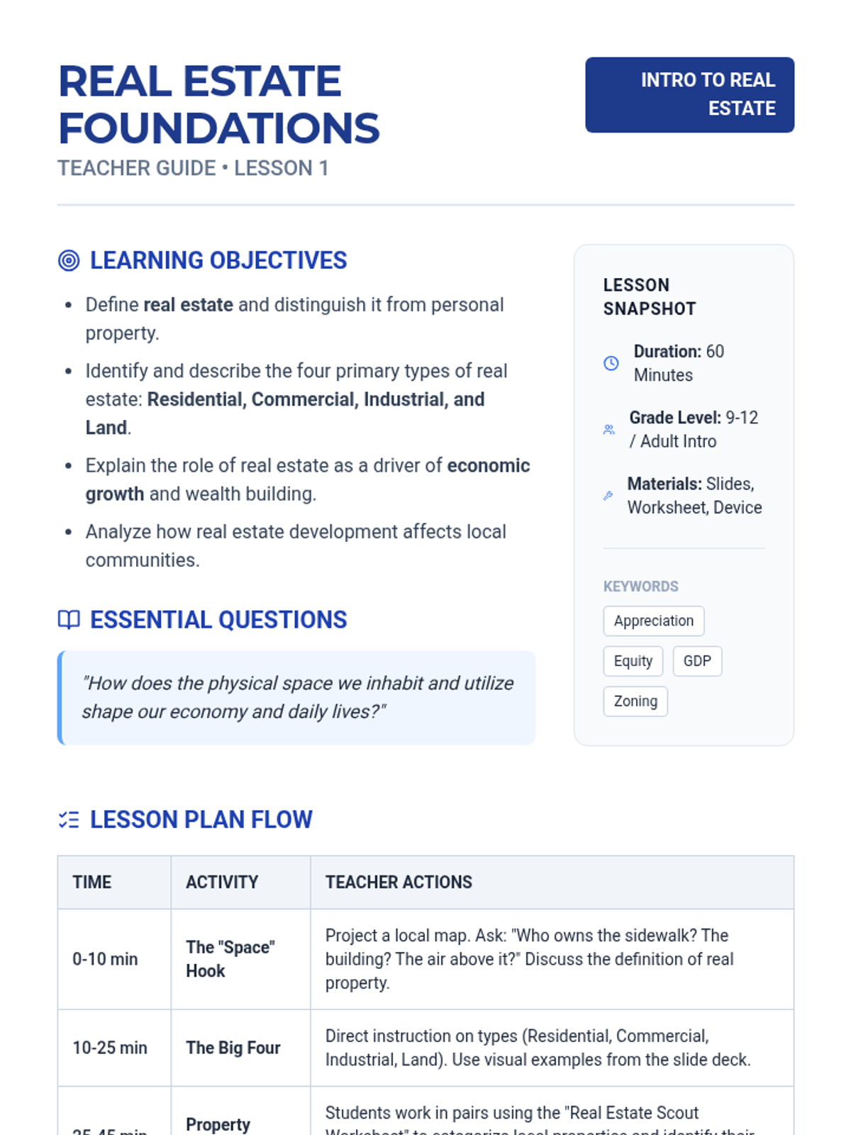 An introductory lesson exploring the definition of real estate, the four main categories (residential, commercial, industrial, and land), and its significant impact on the economy.