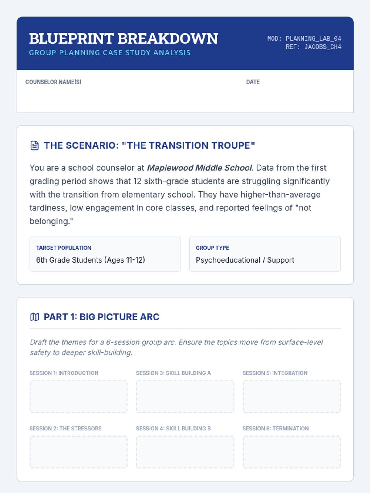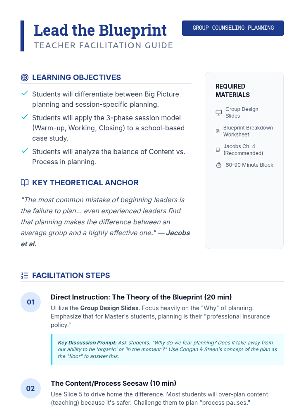 Focuses on the essential skills of big-picture and session-specific planning for school counseling groups, drawing from key texts by Jacobs, Coogan, Steen, and Salerno. Students will learn to structure sessions from warm-up to closing while balancing content and process.