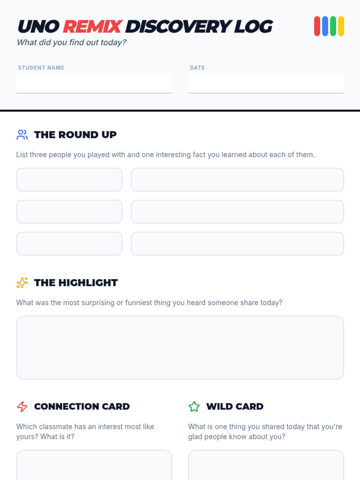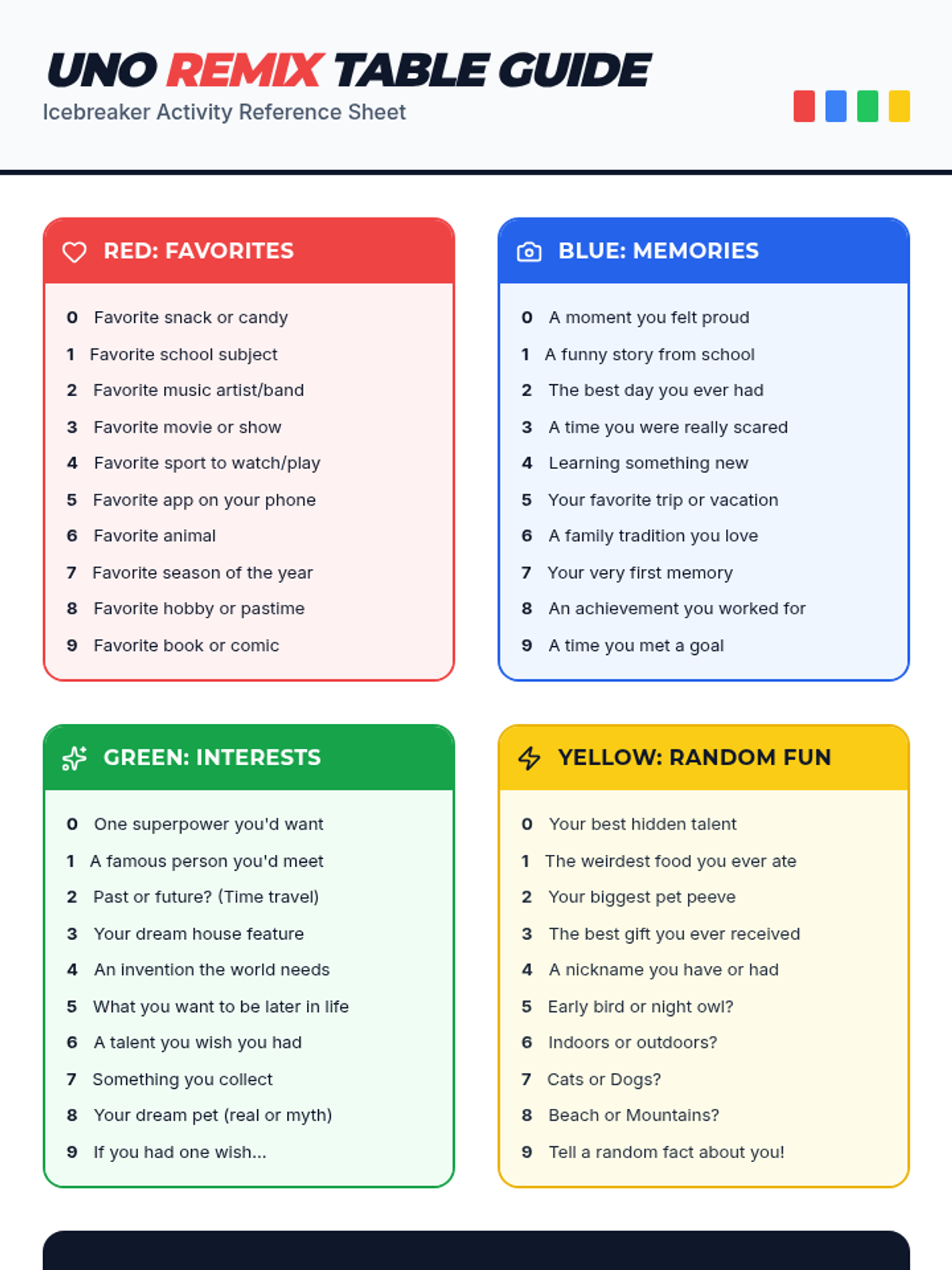 A high-energy "get to know you" game using a standard deck of Uno cards to prompt student sharing and peer connection through color-coded categories.