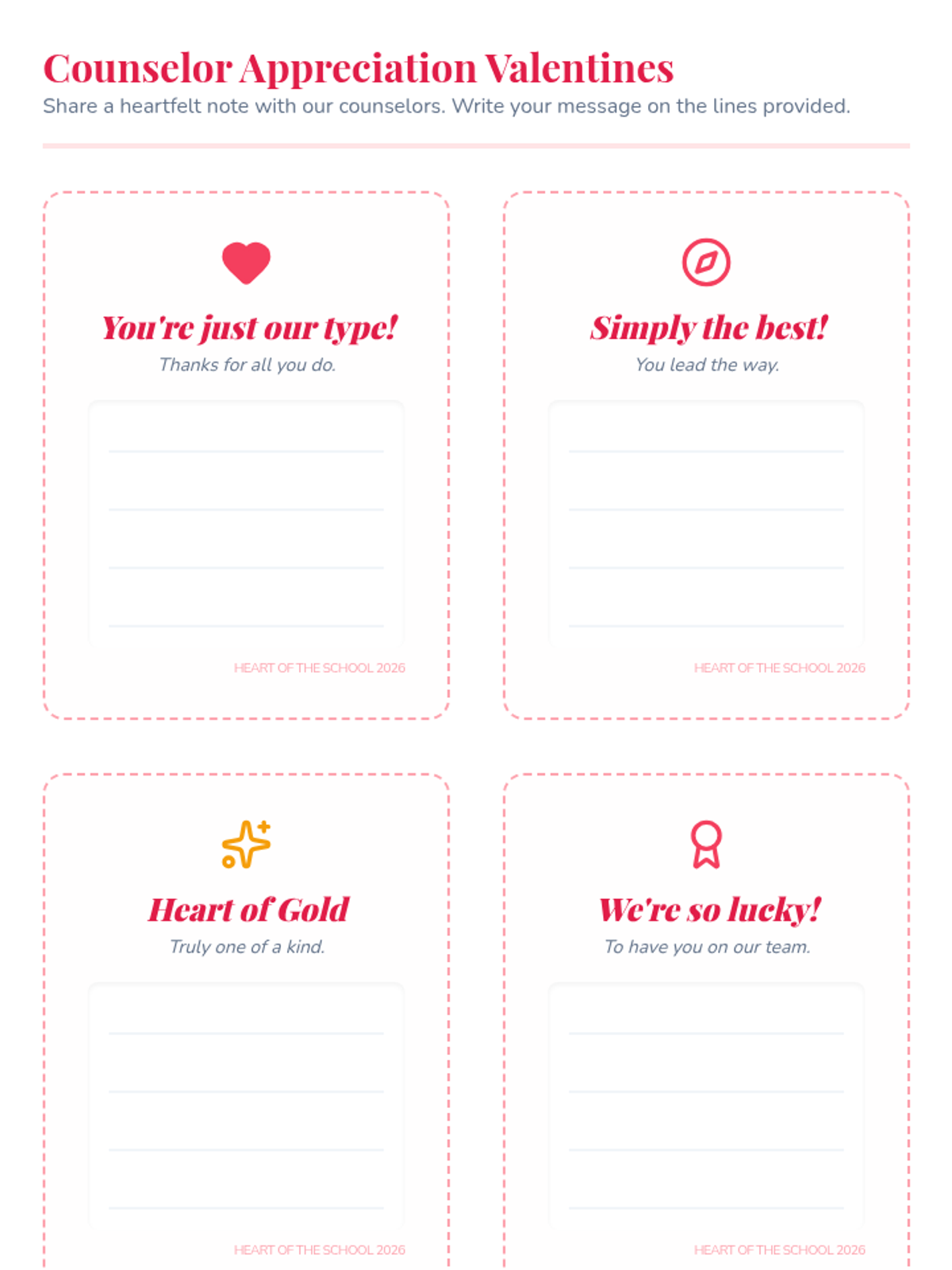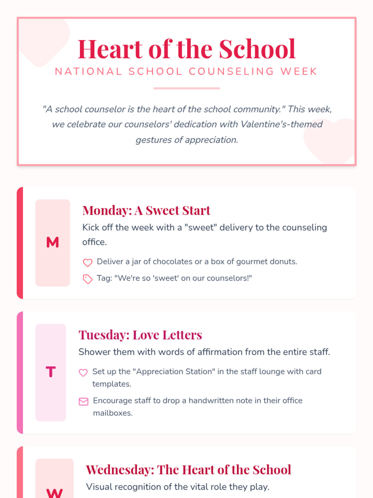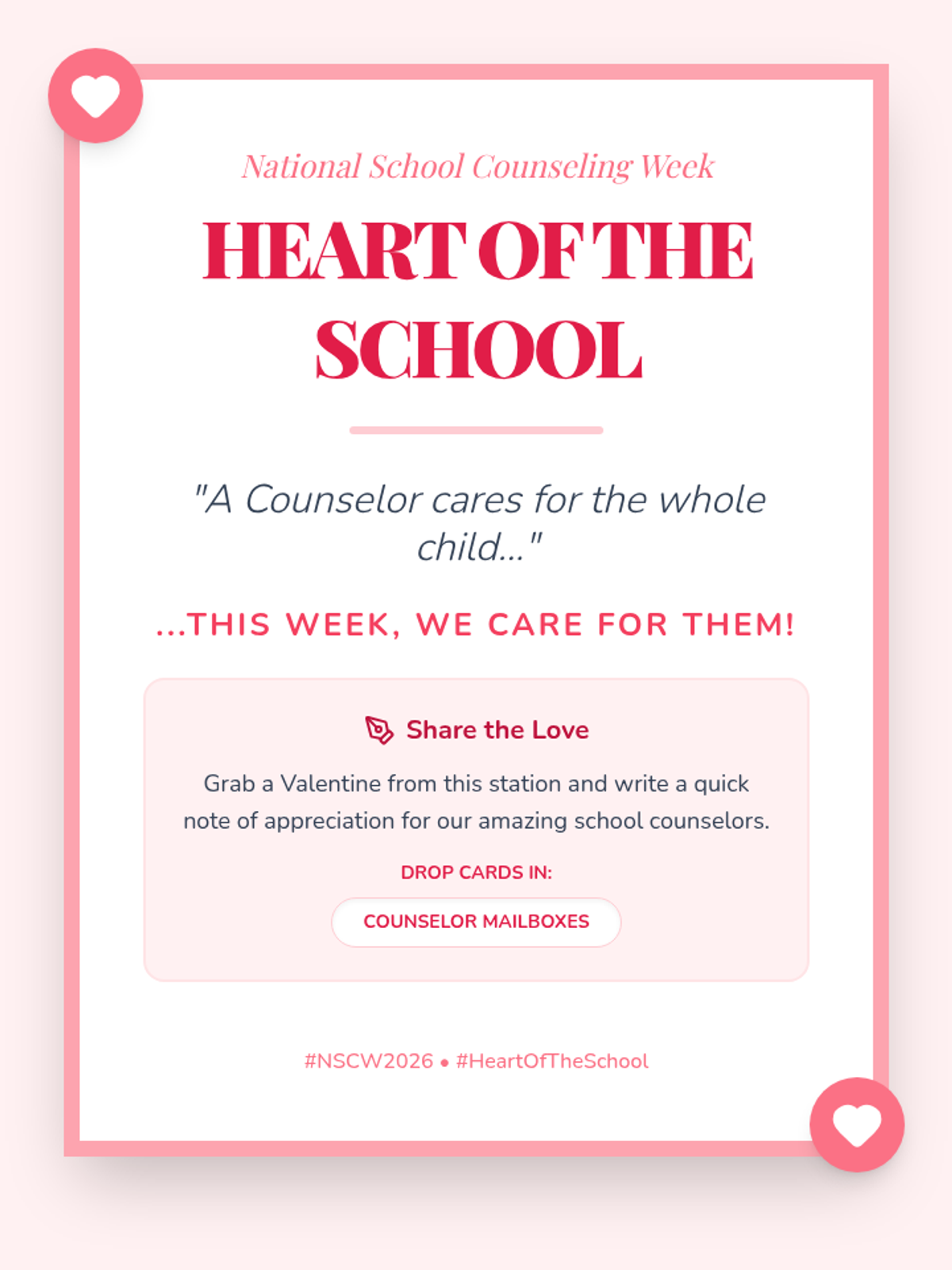 A week-long series of Valentine's-themed activities and gestures to celebrate school counselors during National School Counseling Week.