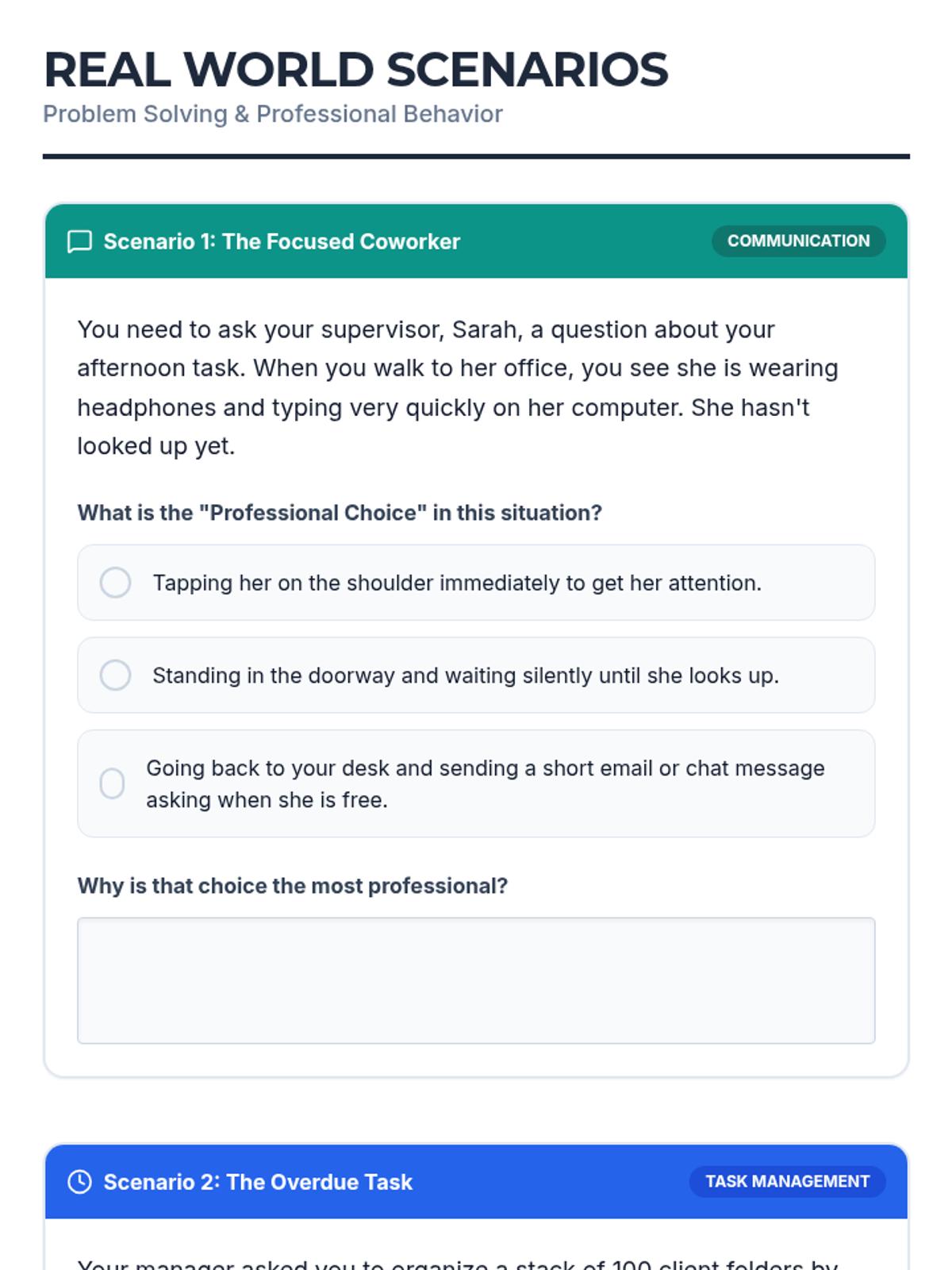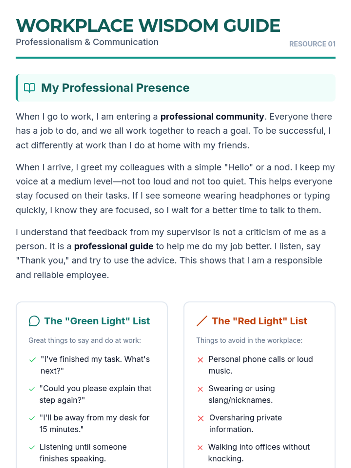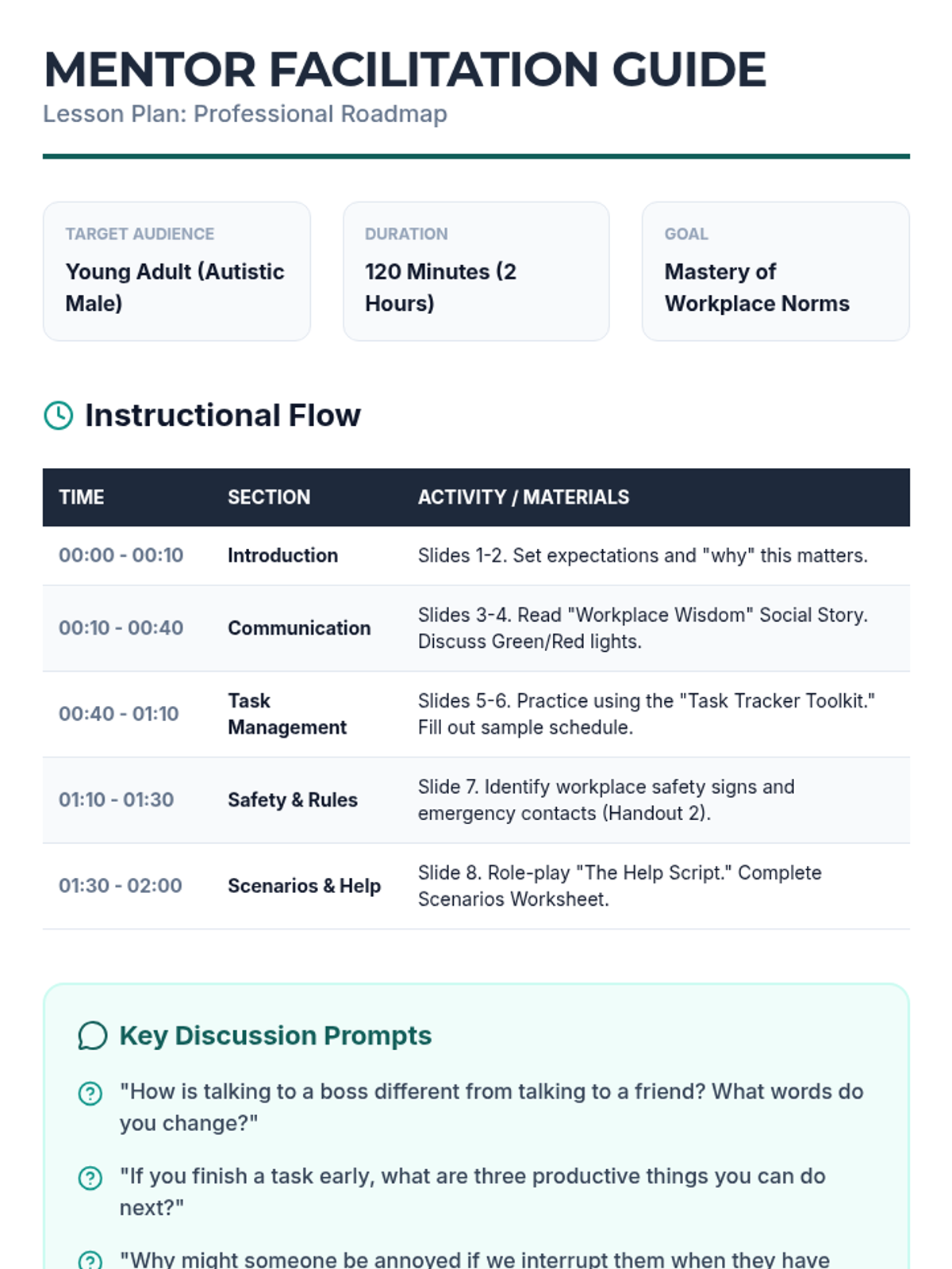 A comprehensive two-hour lesson designed for an autistic young adult focusing on essential workplace expectations including professional communication, task management, safety, and problem-solving through visual supports and scenario-based learning.