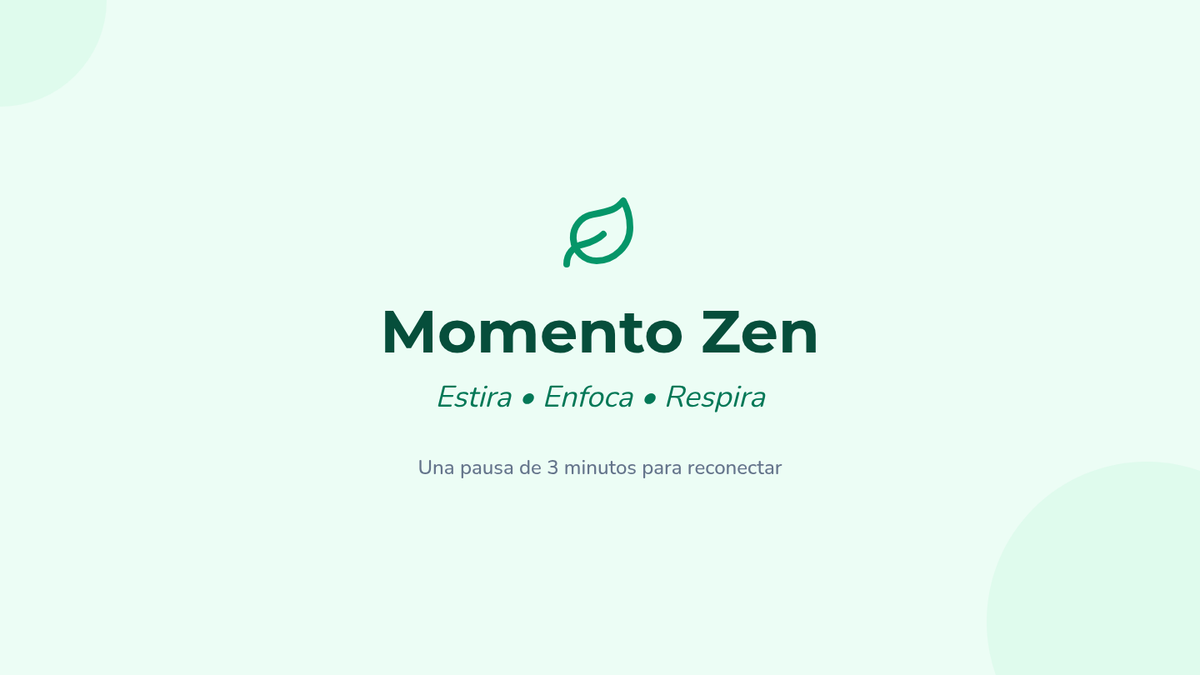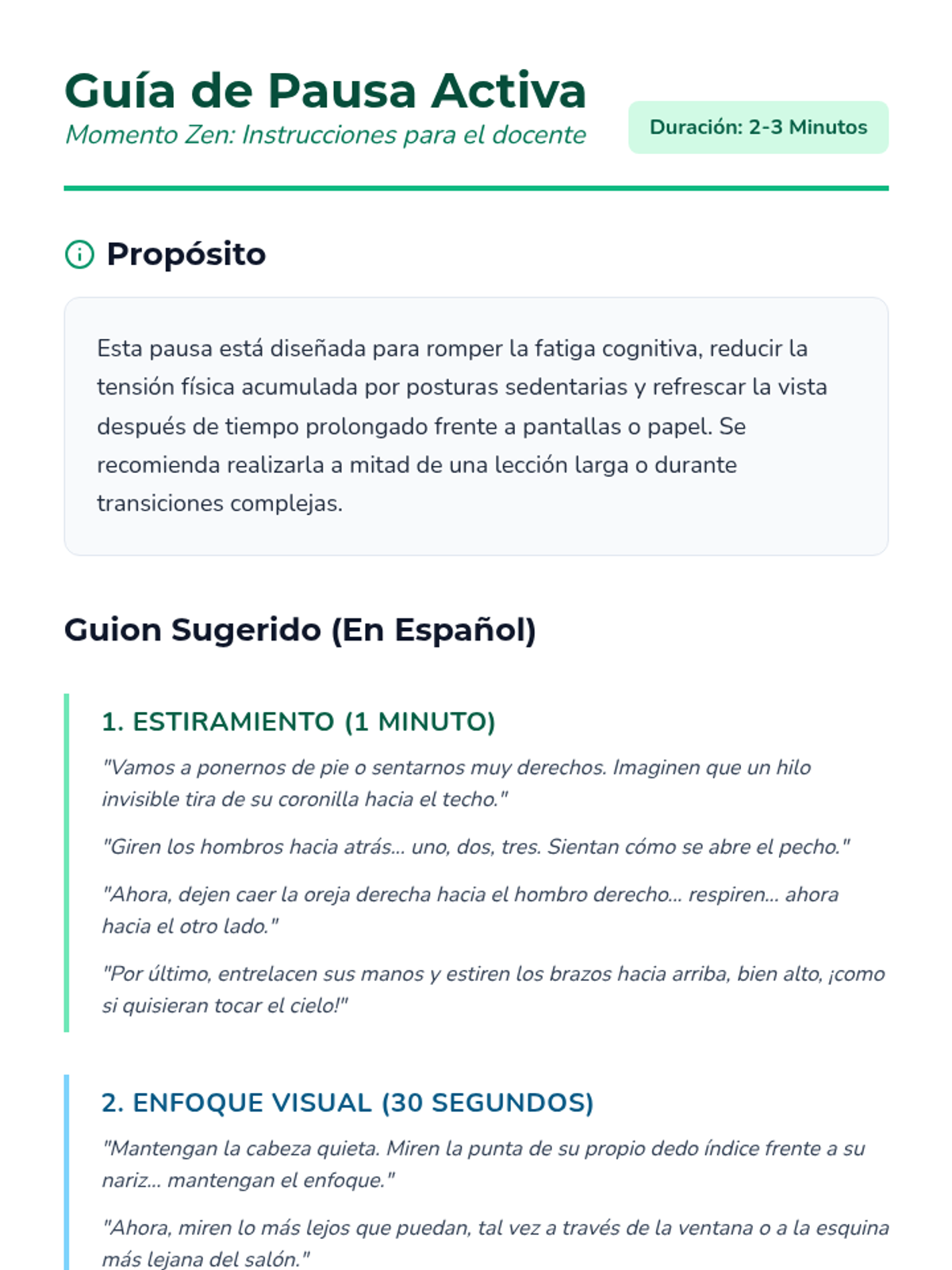 Una breve pausa de 2-3 minutos diseñada para que los estudiantes estiren su cuerpo, refresquen su vista y centren su mente a través de la respiración consciente. Ideal para transiciones o momentos de fatiga mental.