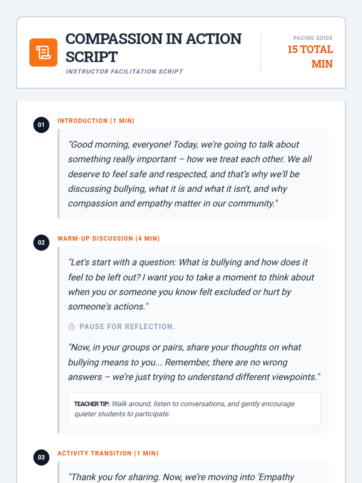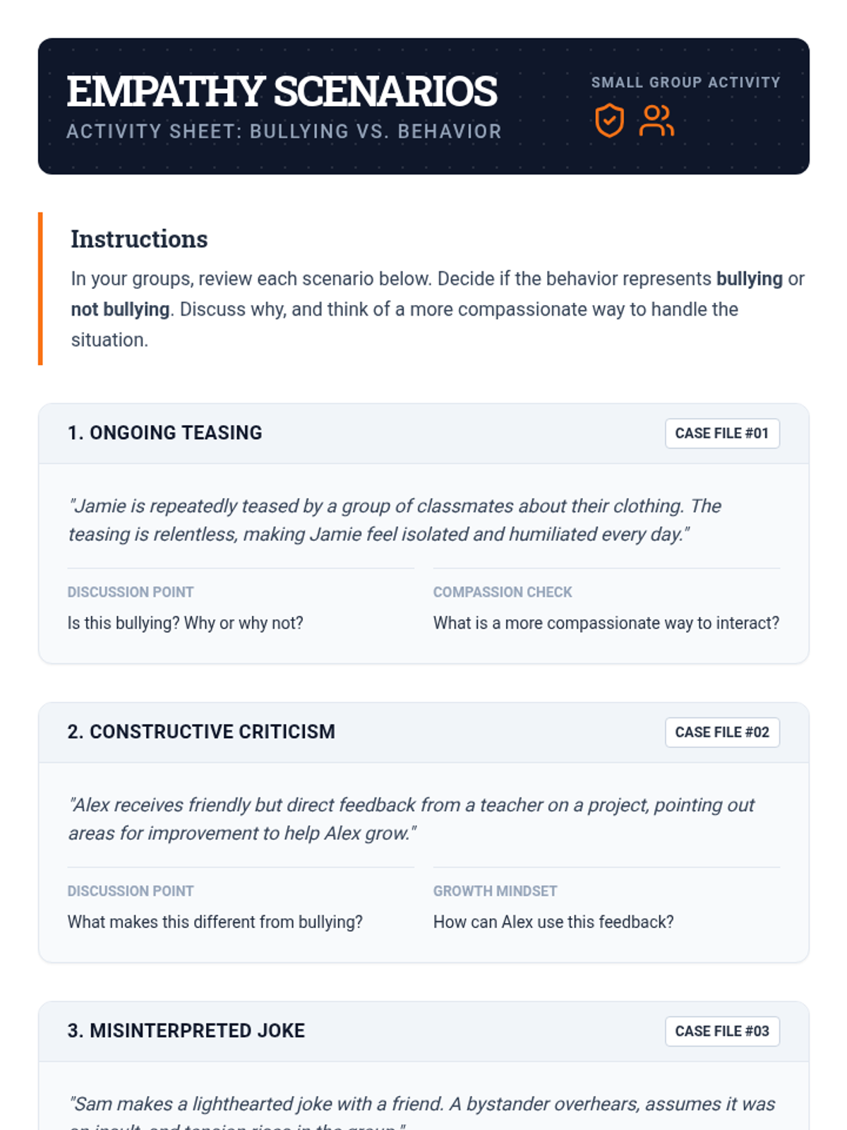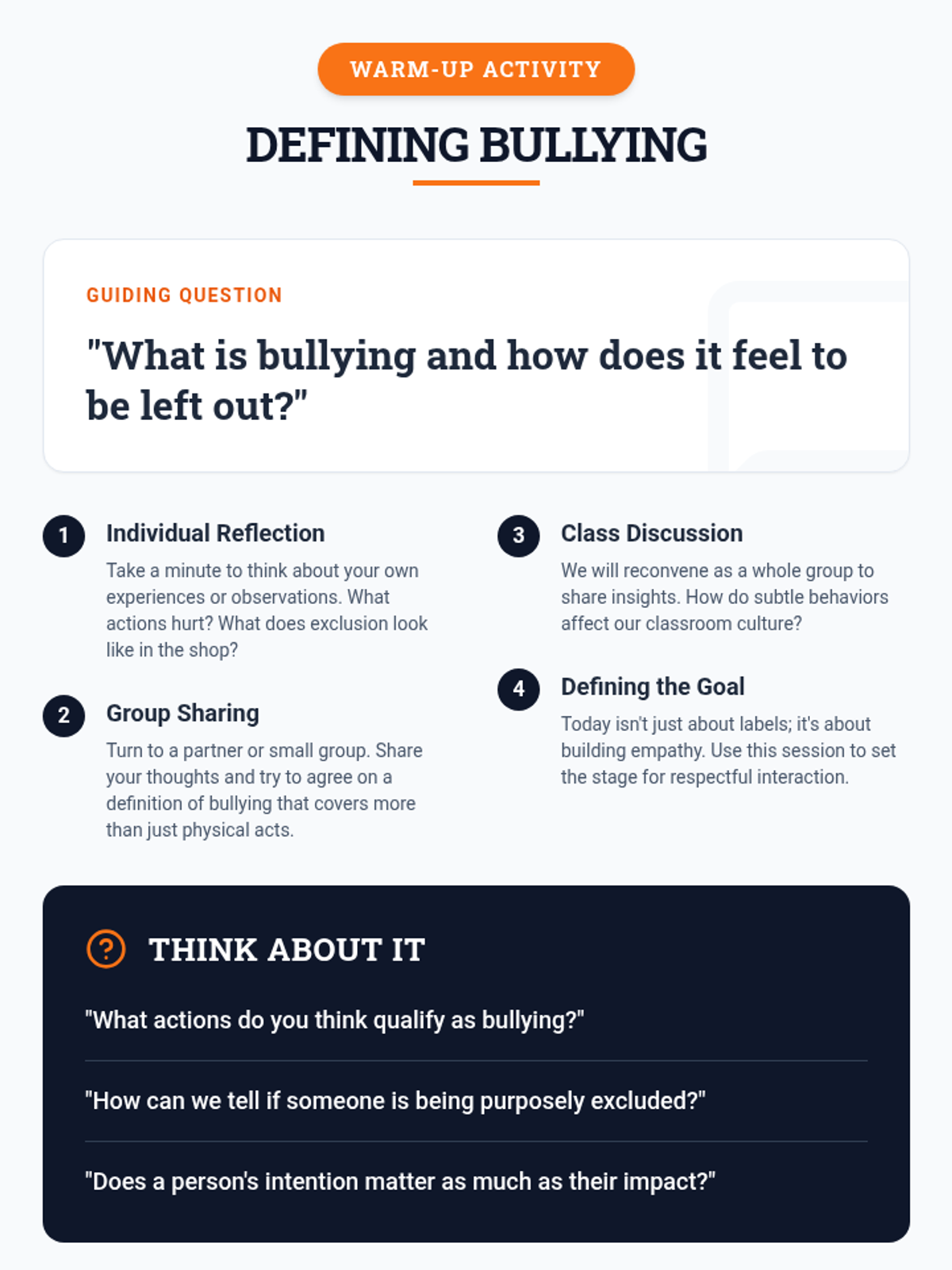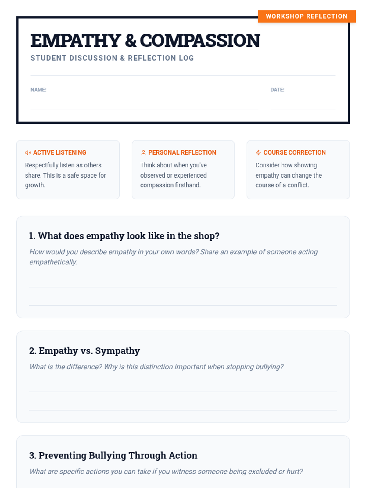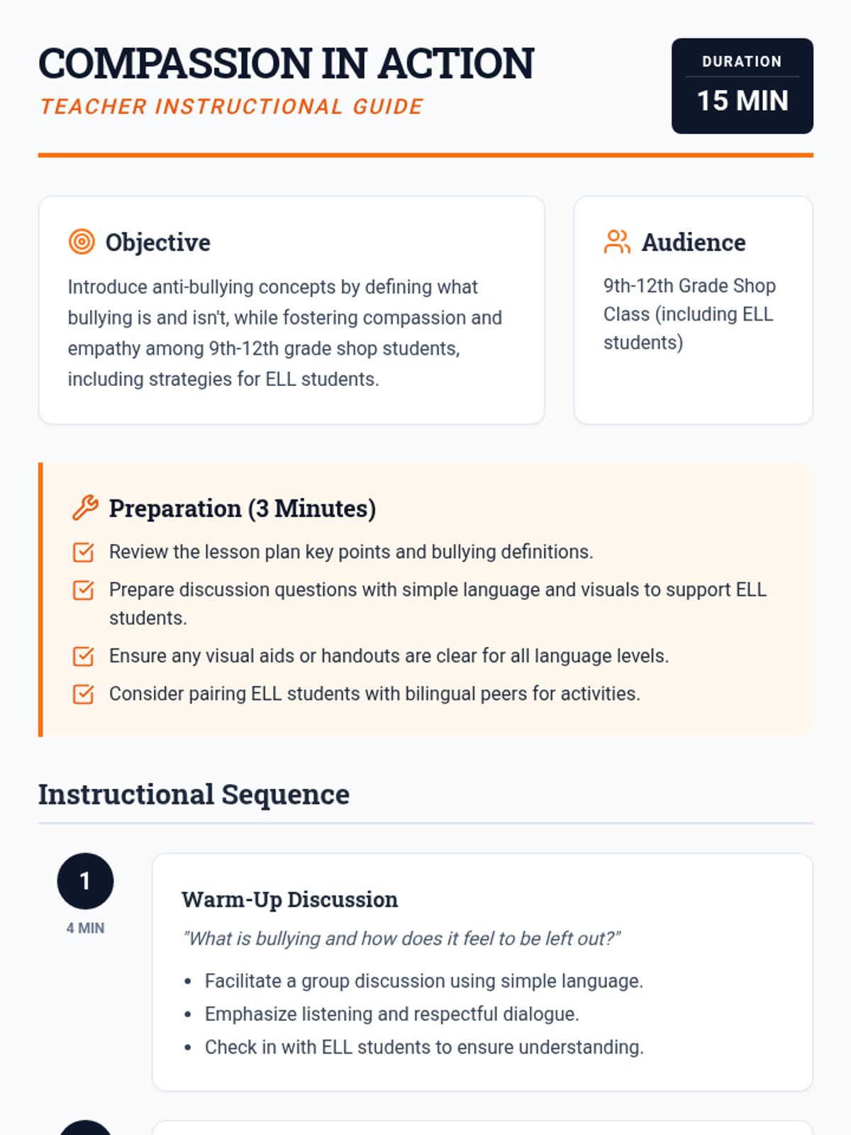 A concise 15-minute lesson for 9th-12th grade shop students to define bullying, distinguish it from non-bullying behaviors, and cultivate a culture of compassion and empathy in the workshop.
