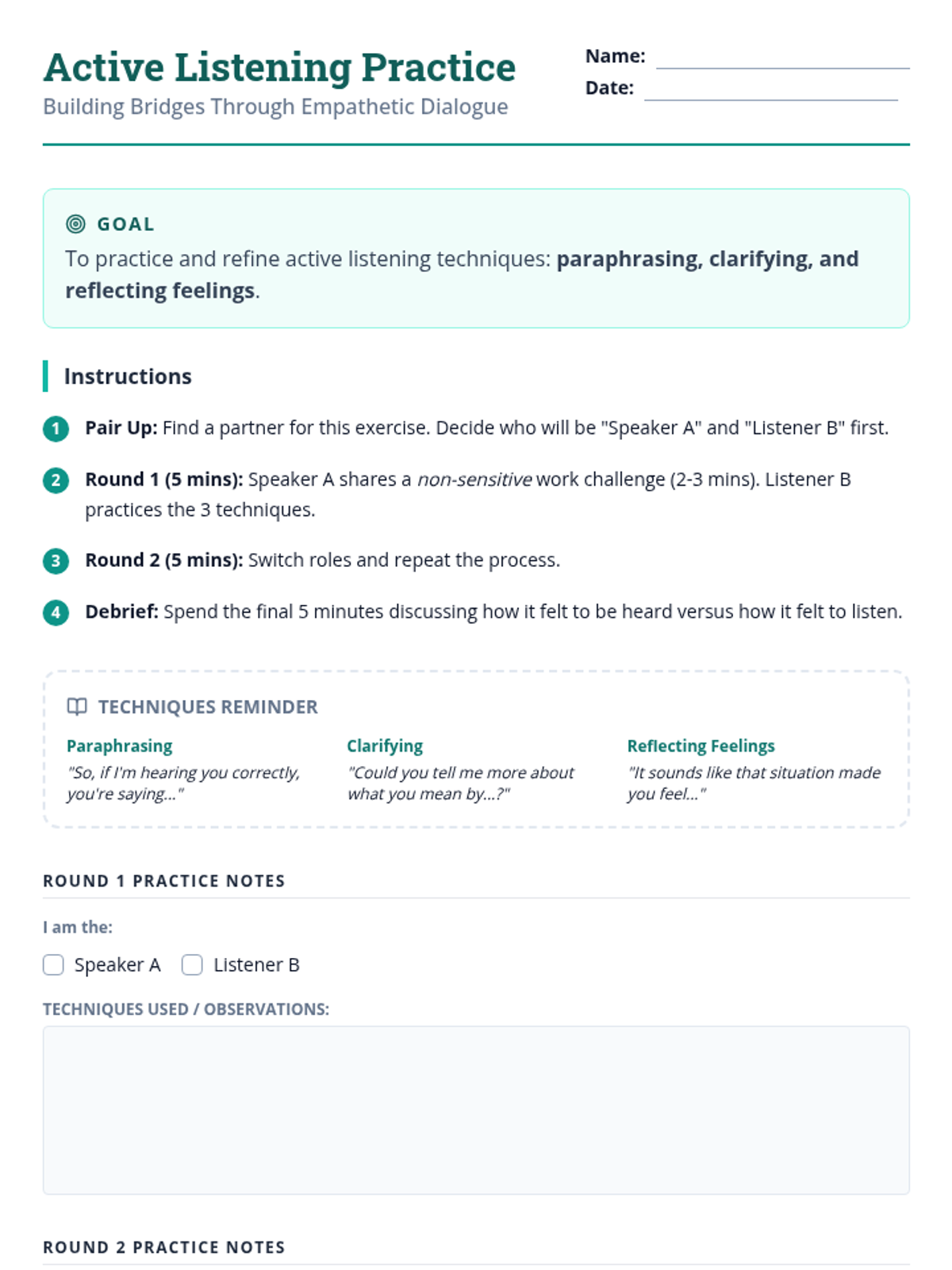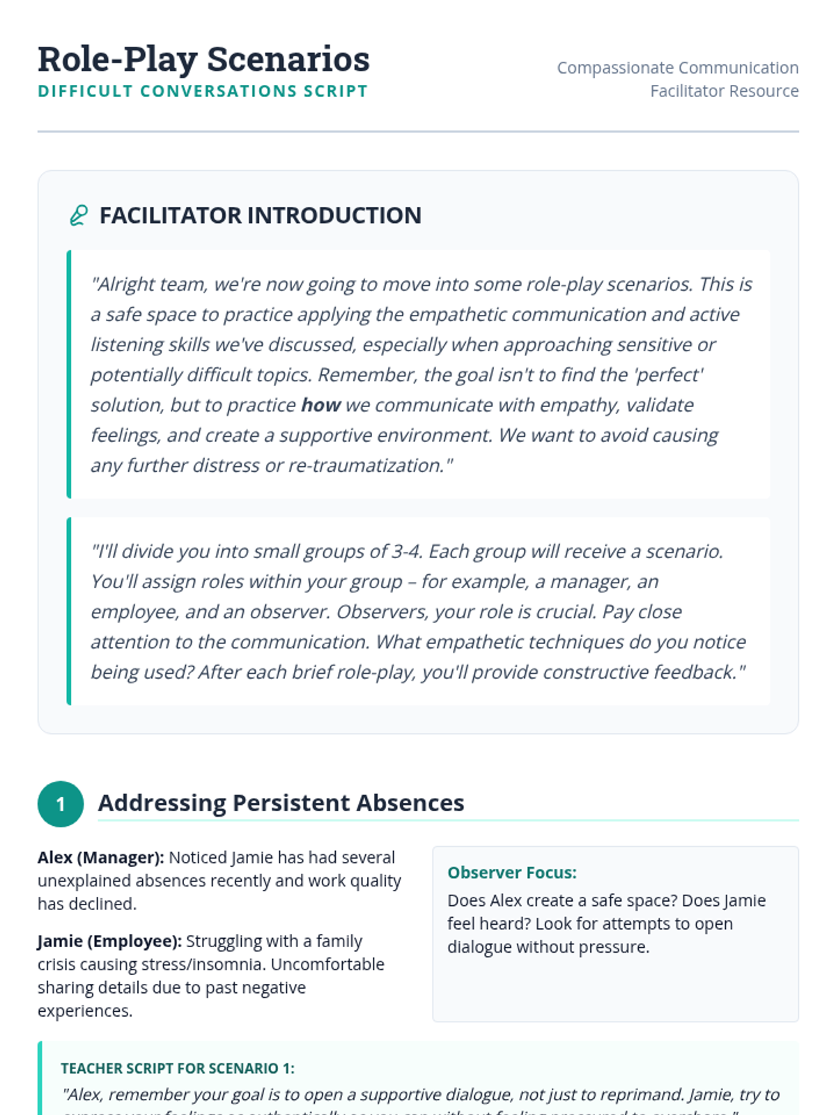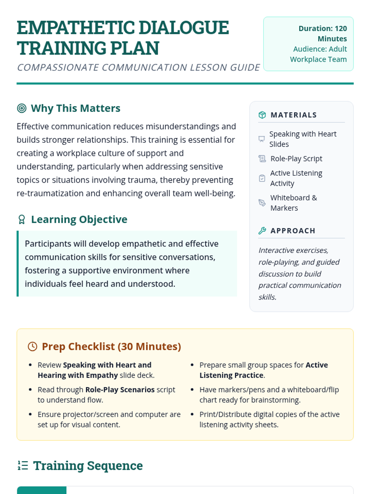 A 120-minute training session for adult workplace teams focused on building empathy, active listening skills, and trauma-aware communication to foster a supportive work environment.