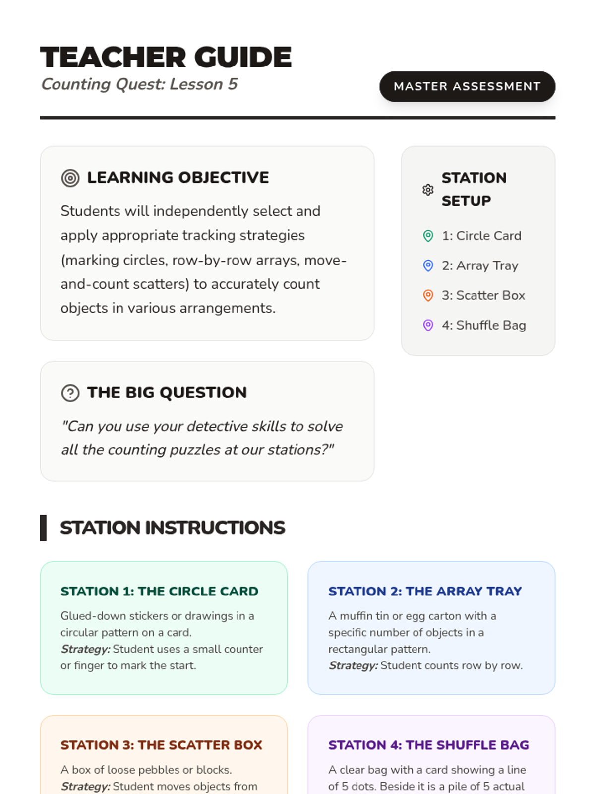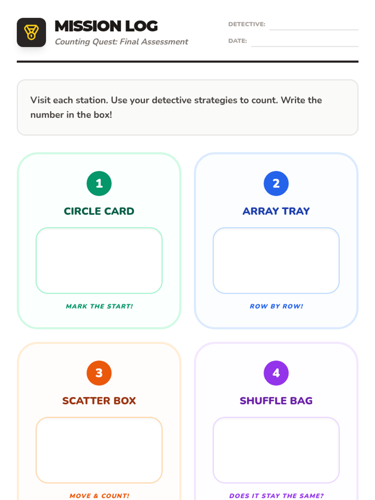 Students rotate through stations featuring objects in bags, glued on cards in circles, and scattered in boxes. They record the quantity for each station. This verifies their ability to apply different tracking strategies based on the arrangement.