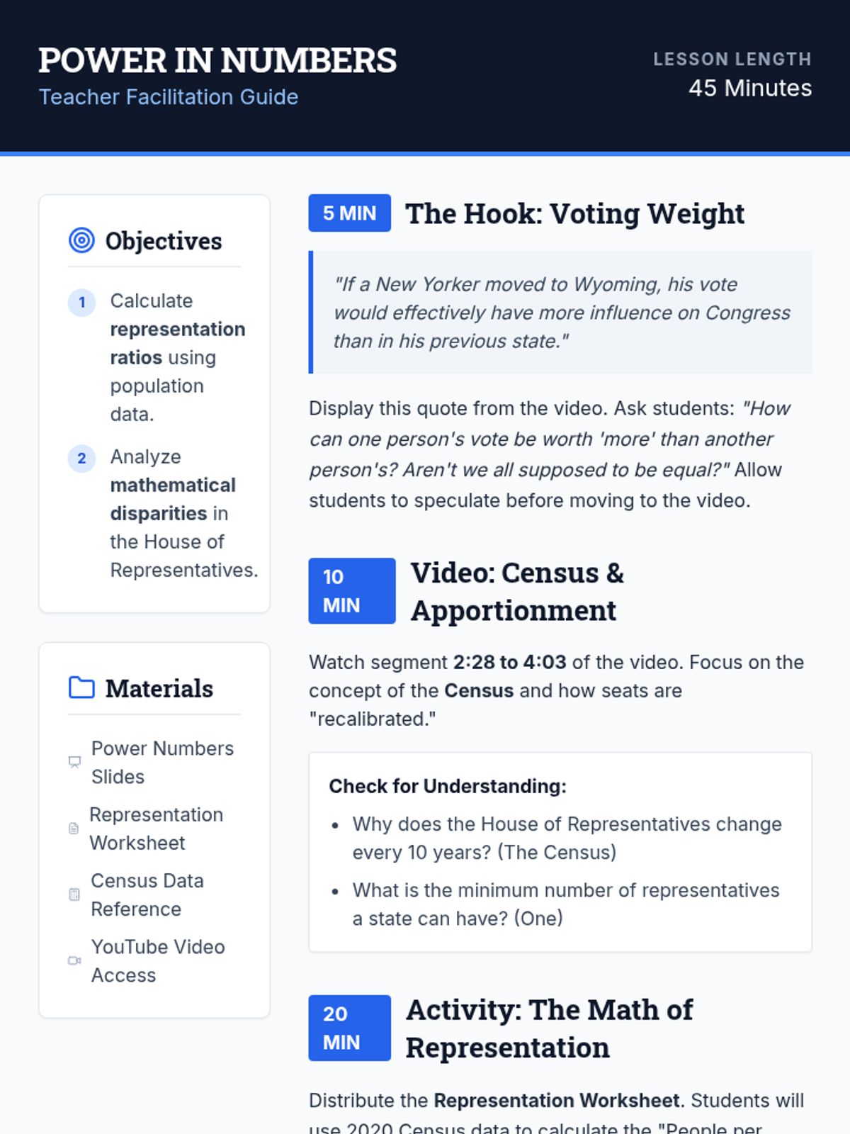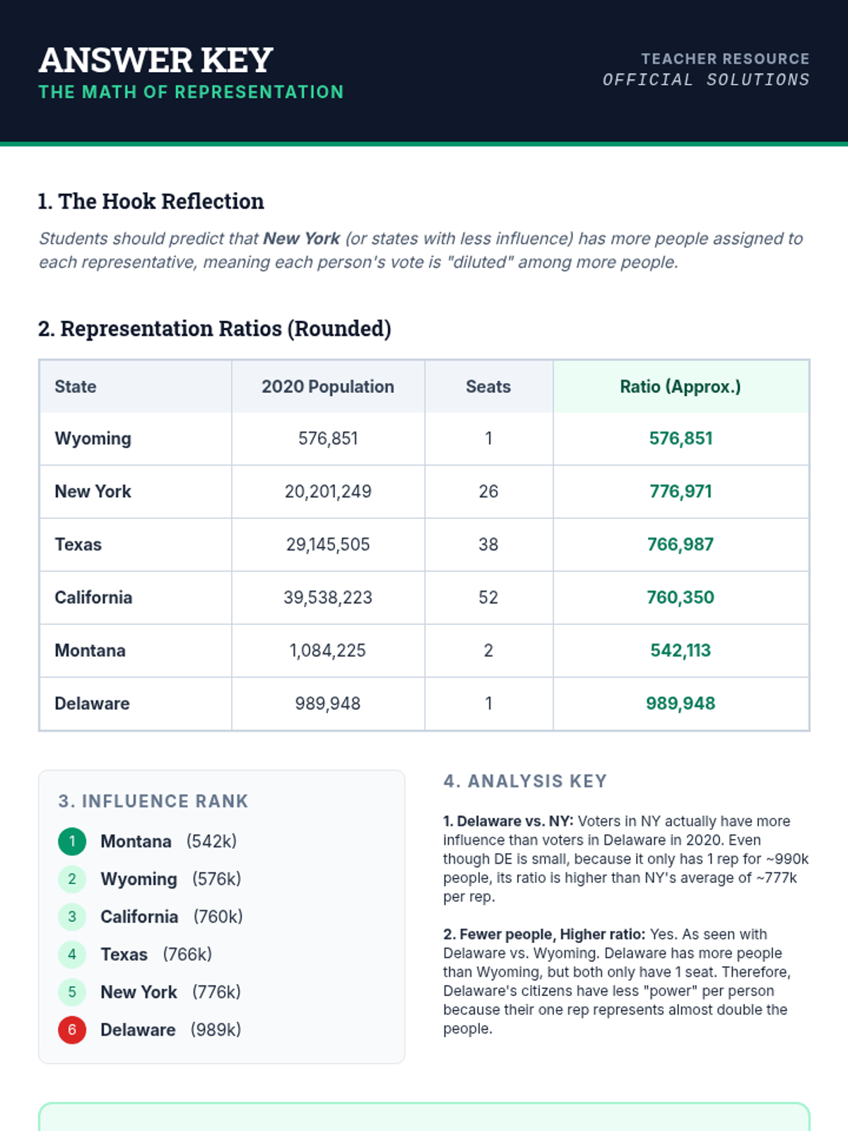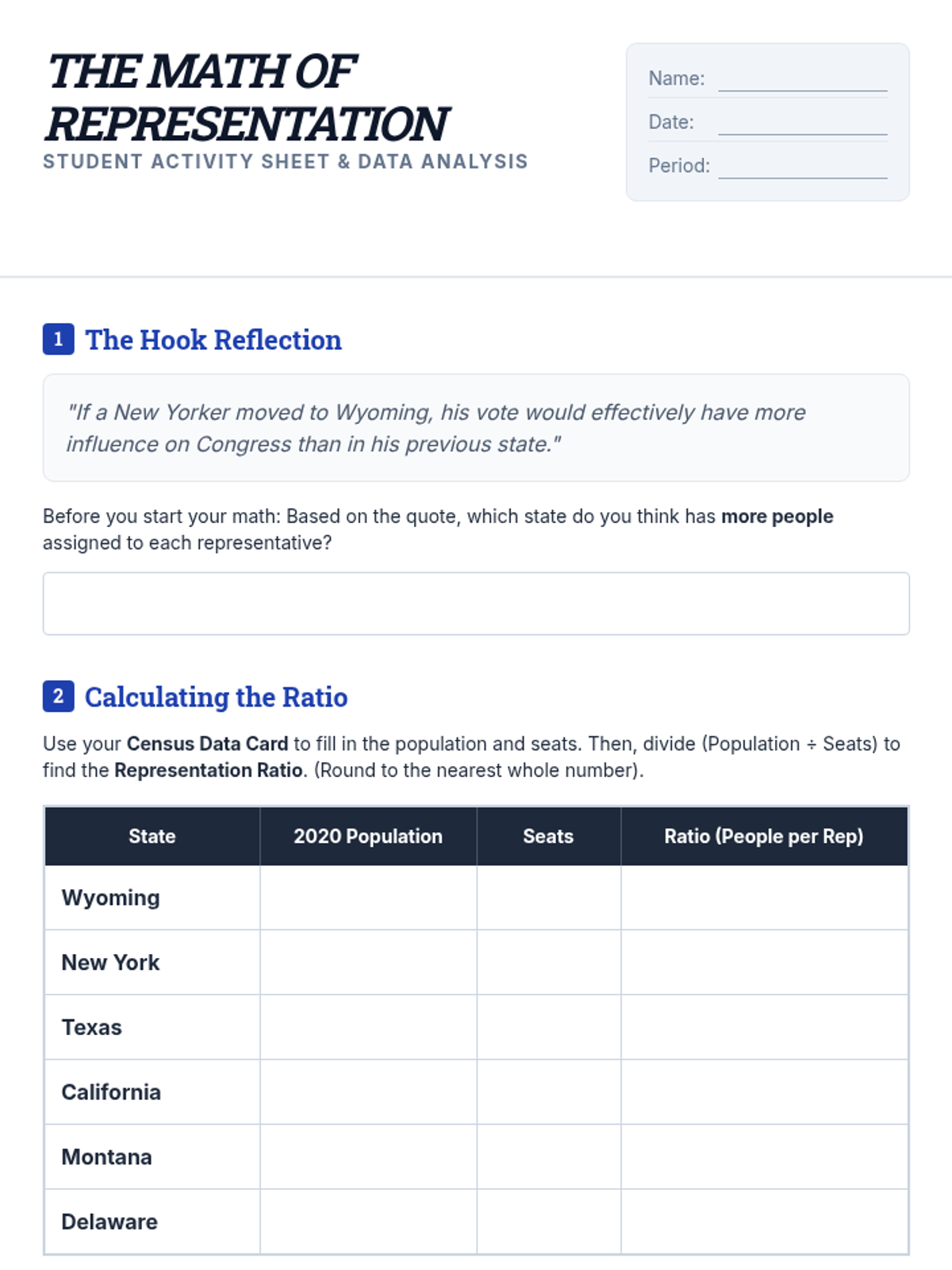 A cross-curricular lesson combining 8th-grade math and civics. Students use 2020 Census data to calculate representation ratios in the House of Representatives, identifying mathematical disparities in voting power across different states.