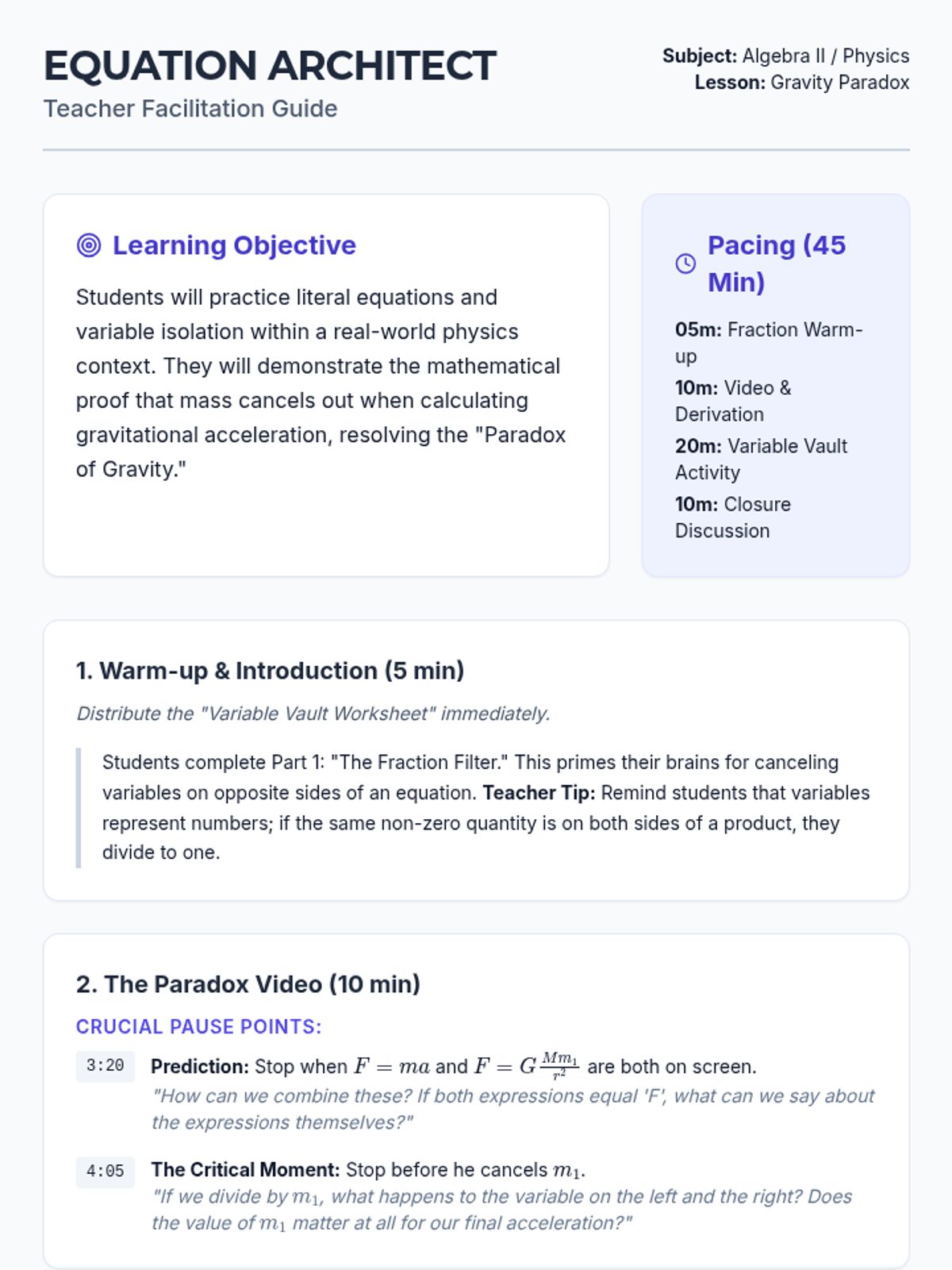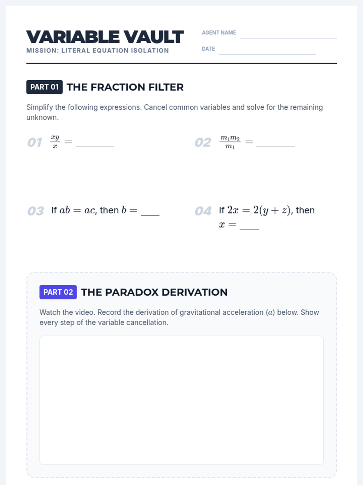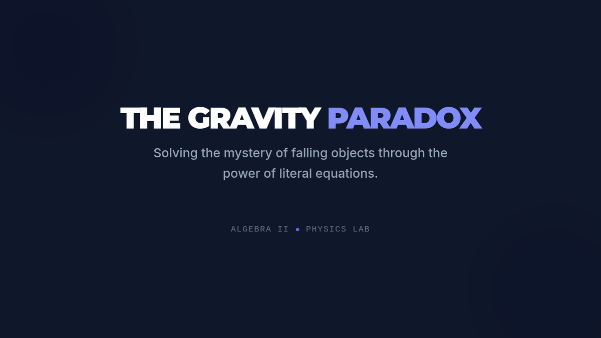 Students investigate the mathematical 'paradox' of gravity, learning how to manipulate literal equations and isolate variables in a physics context. By deriving the formula for gravitational acceleration, students see the power of algebraic cancellation before substituting numerical values.