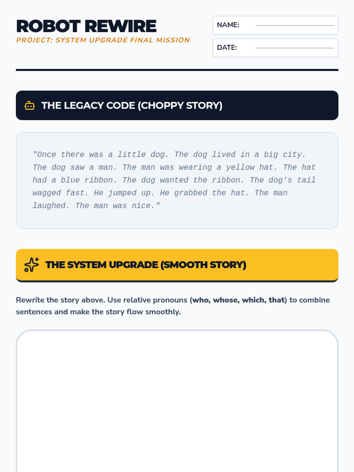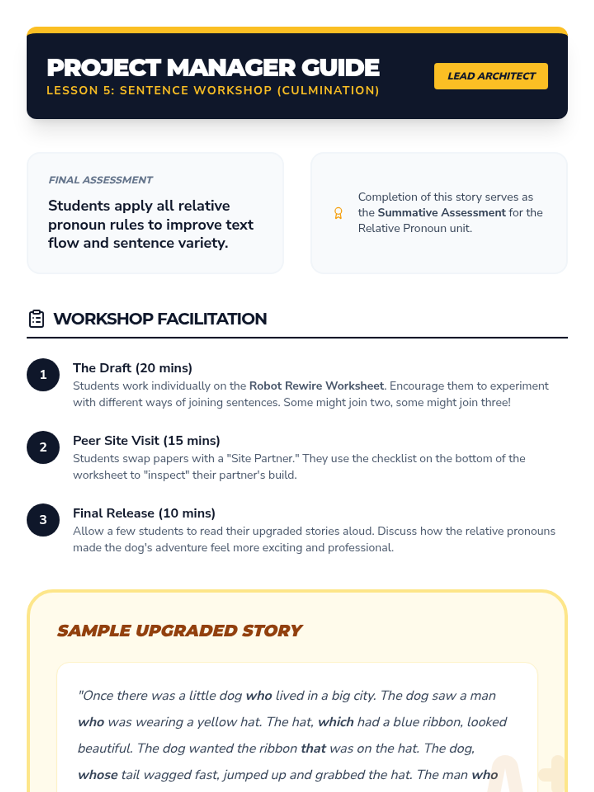 In this culminating application lesson, students take a short story written entirely in simple sentences and rewrite it using relative pronouns to improve sophistication. They peer-review the new versions for clarity and flow.