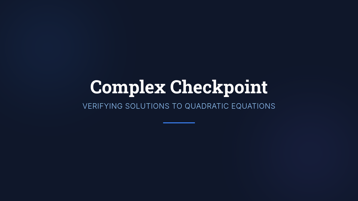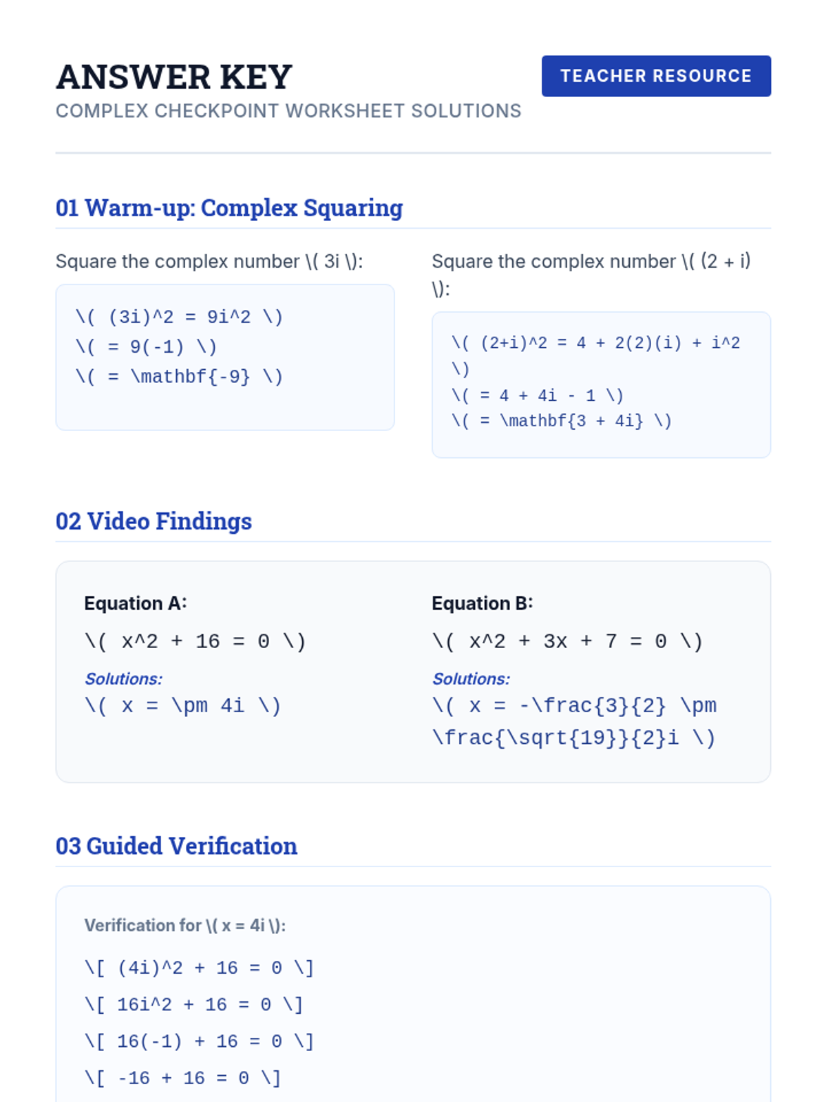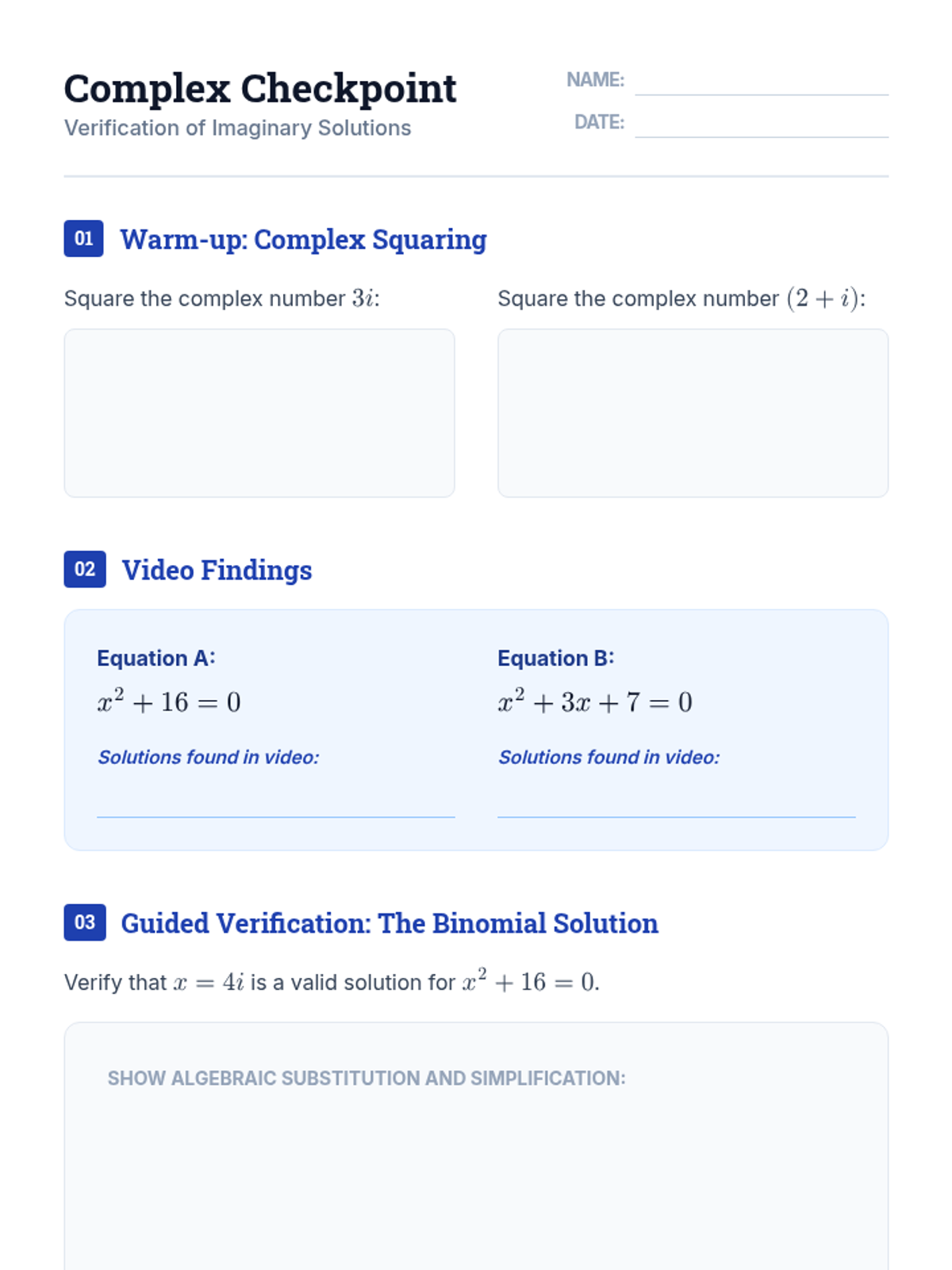A high-school pre-calculus lesson focused on the algebraic verification of complex solutions to quadratic equations, featuring a guided video analysis and hands-on verification practice.