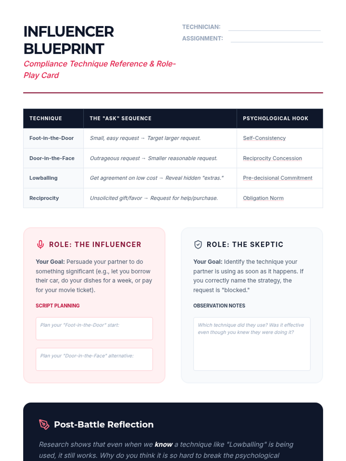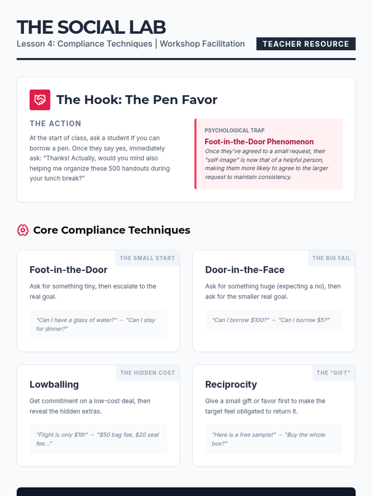 A workshop focusing on specific psychological strategies used to gain compliance, including 'Foot-in-the-Door' and 'Door-in-the-Face,' with role-playing exercises to identify and counter these techniques.