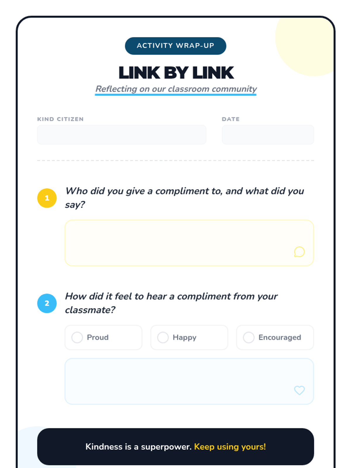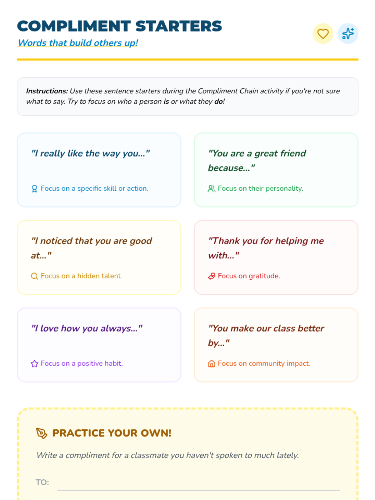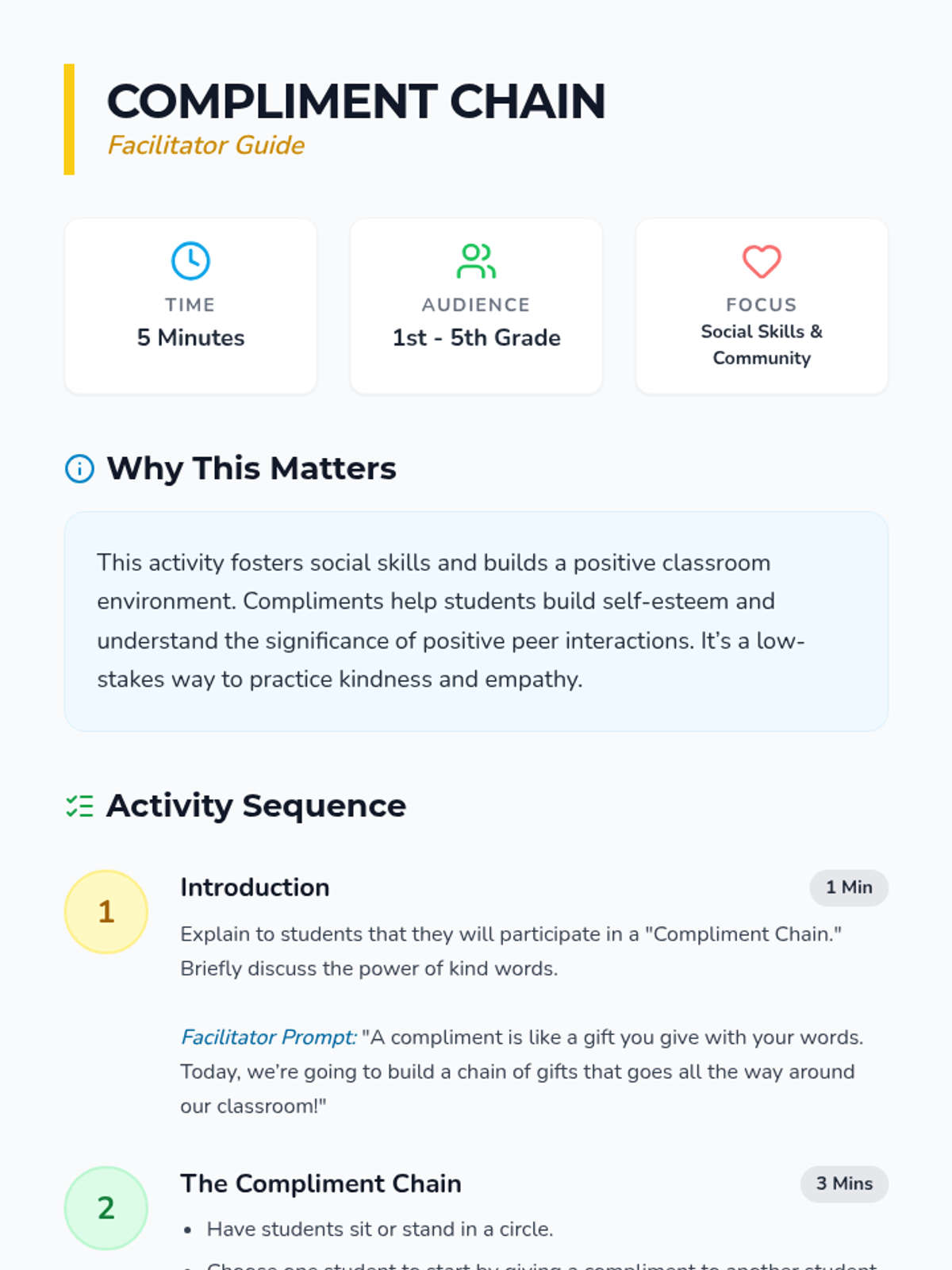 A quick social-emotional learning activity designed to build self-esteem and foster a positive classroom environment through the power of positive interaction. Students learn to give and receive meaningful compliments in a structured chain format.