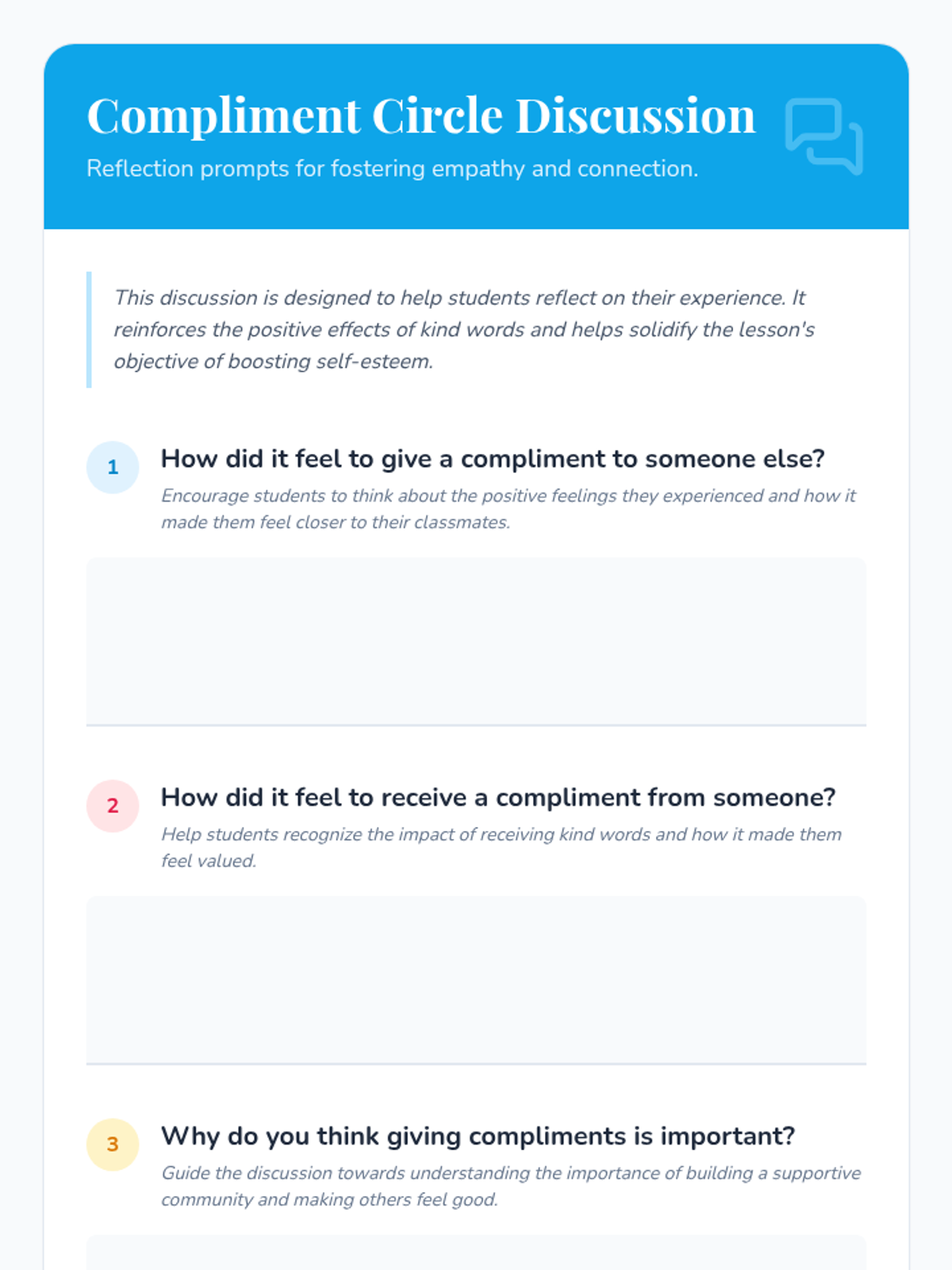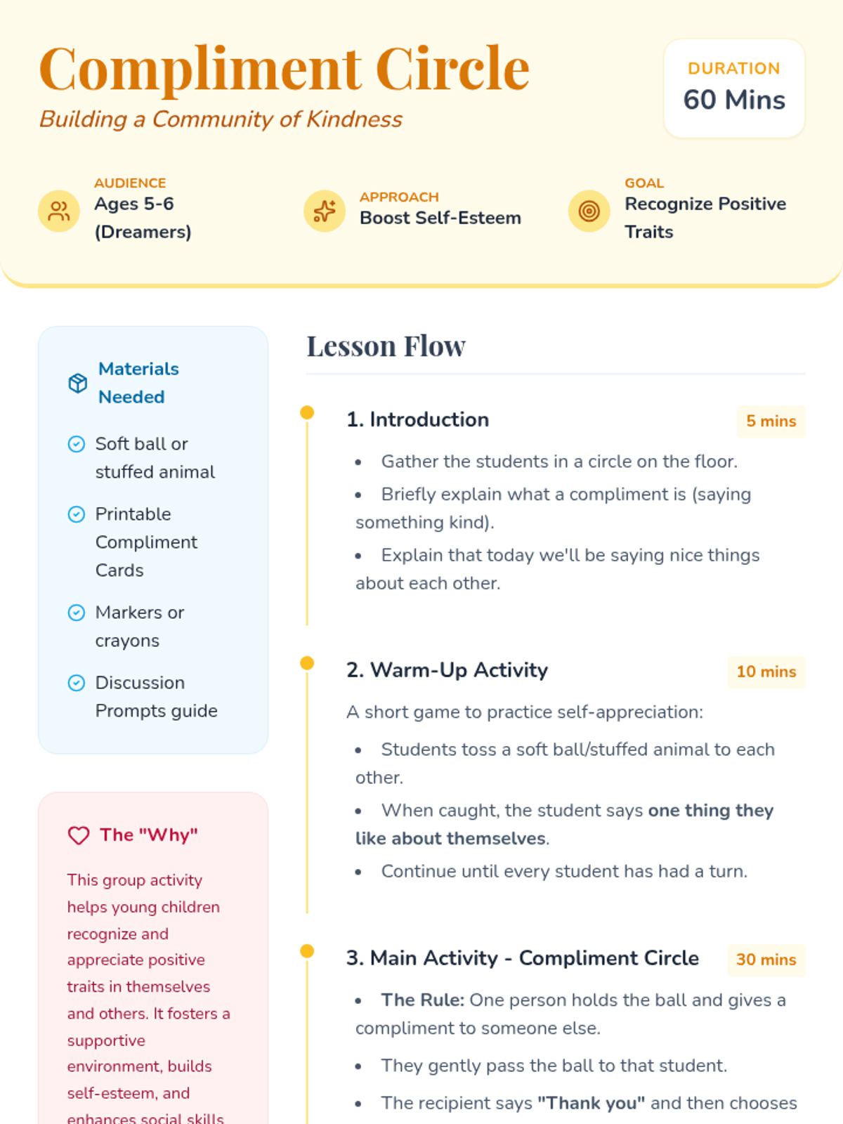 A social-emotional learning lesson for young children focused on building self-esteem and community through the practice of giving and receiving compliments. Students participate in a 'Sunshine Circle' to share kindness and create personalized compliment cards.