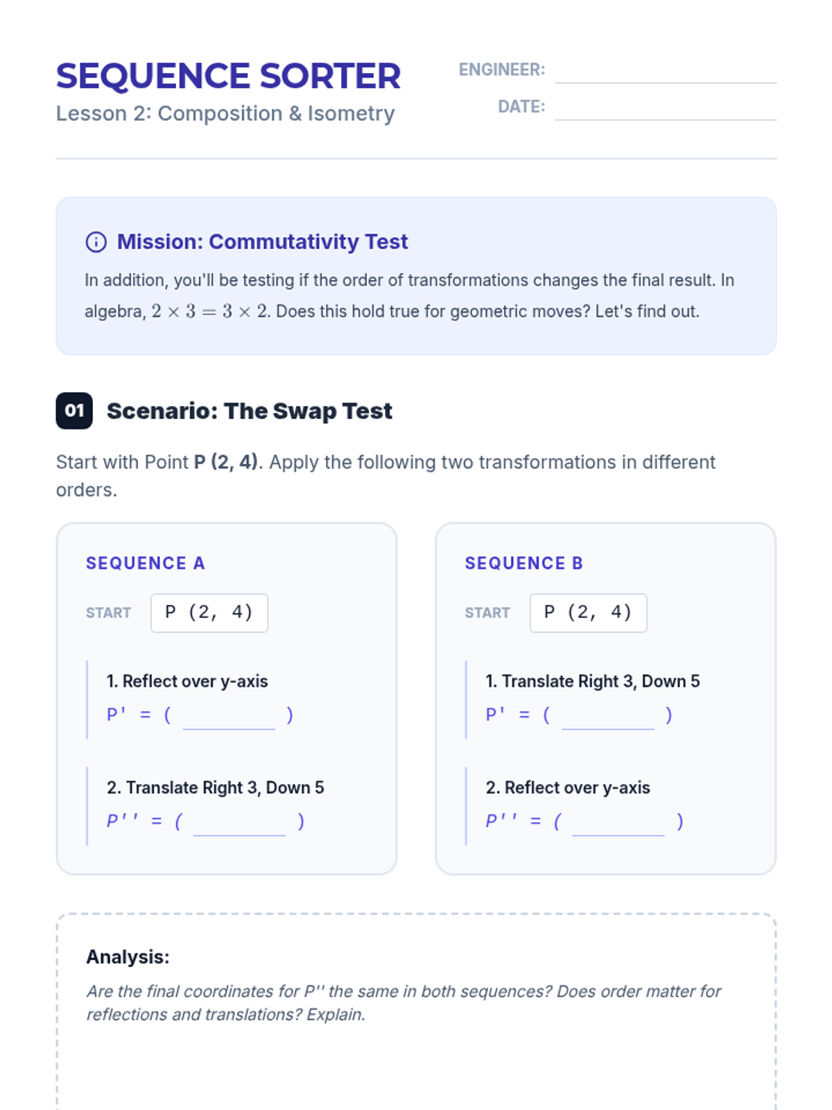 Students investigate the composition of transformations, verifying that properties like distance and angle measure are preserved (isometry) regardless of the sequence of moves.