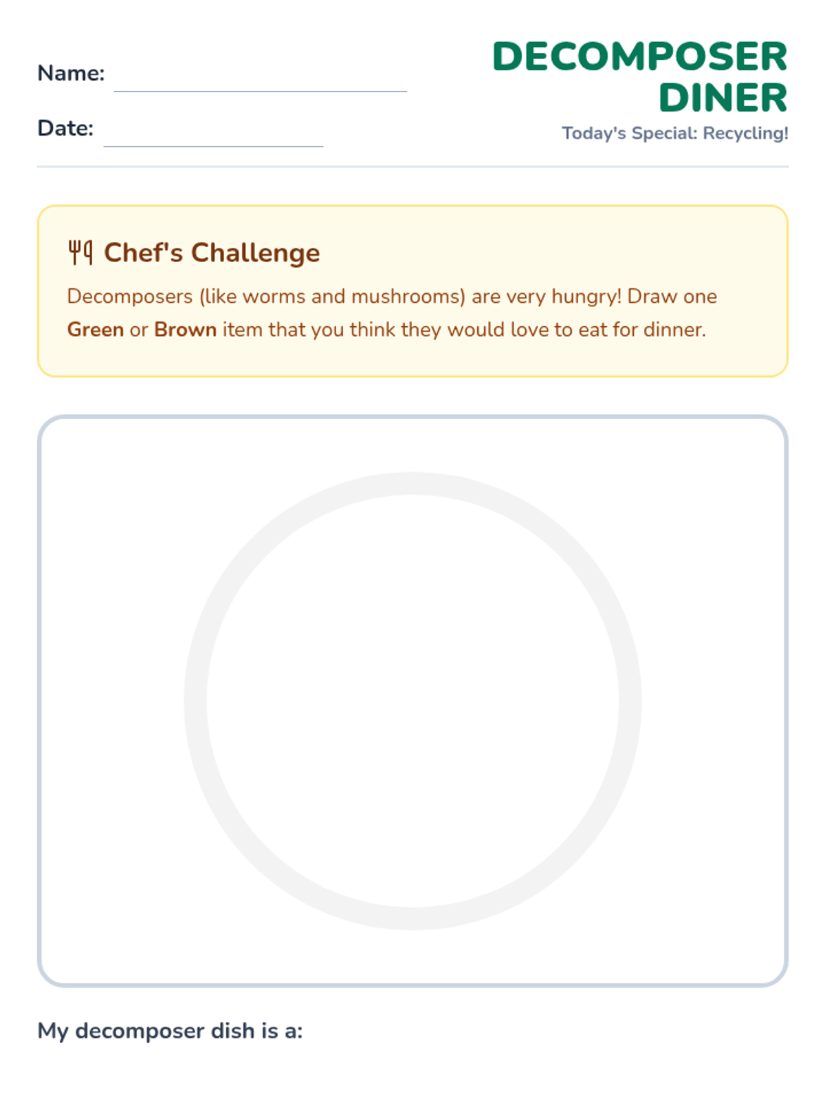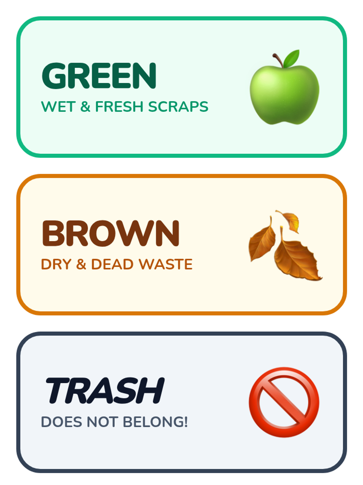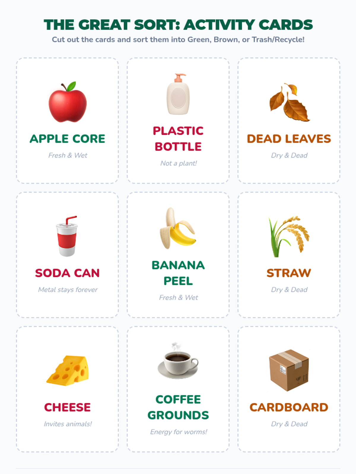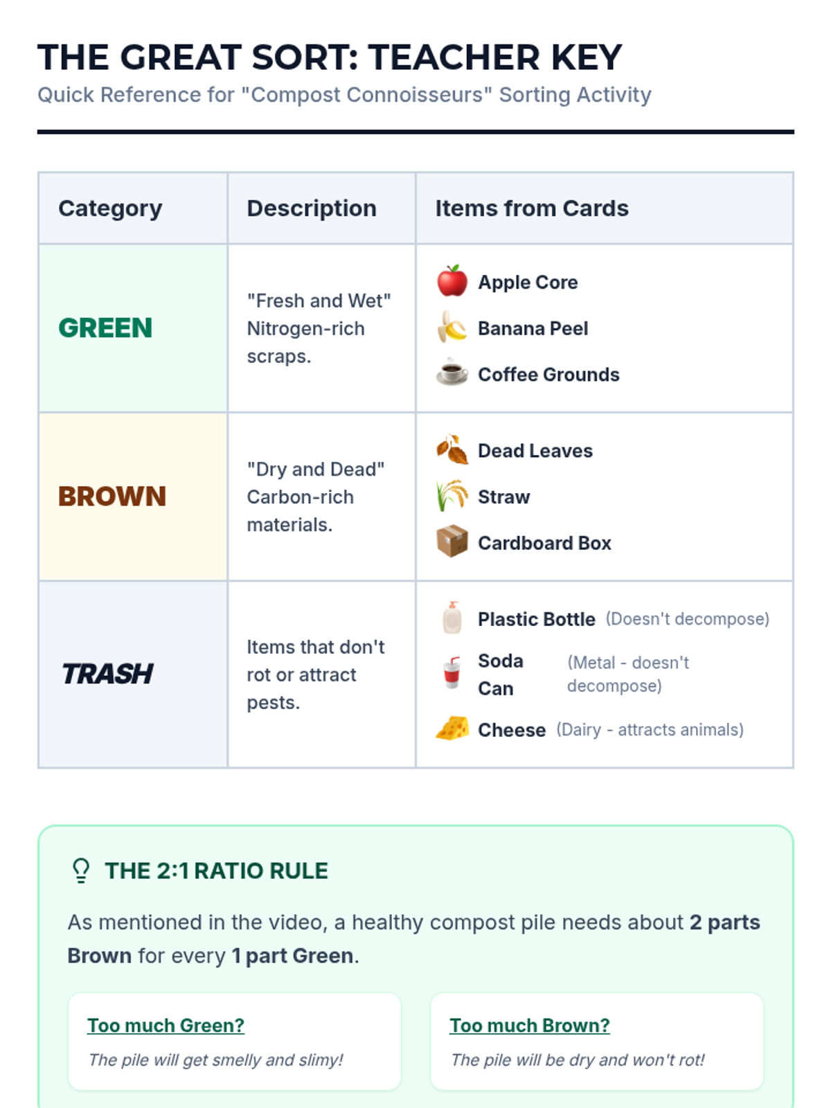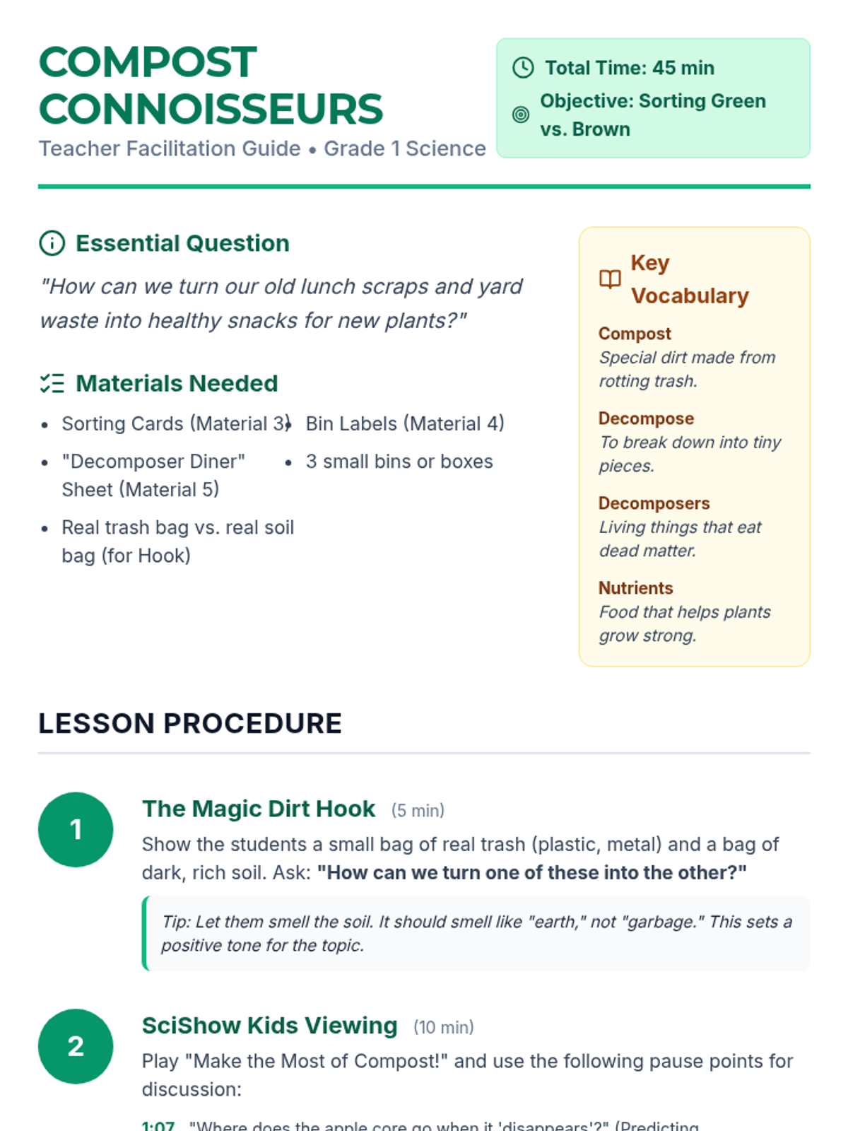 A hands-on introductory lesson where 1st graders learn the 'recipe' for compost by sorting materials into Green (nitrogen-rich), Brown (carbon-rich), and Trash categories. The lesson uses a SciShow Kids video and a physical sorting activity to make decomposition concrete and engaging.