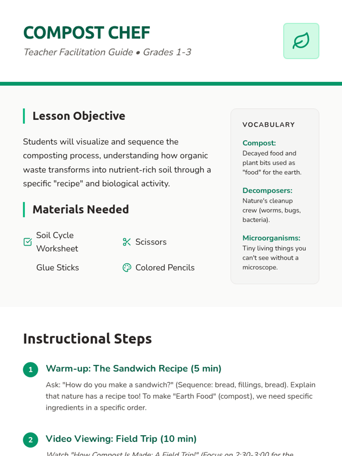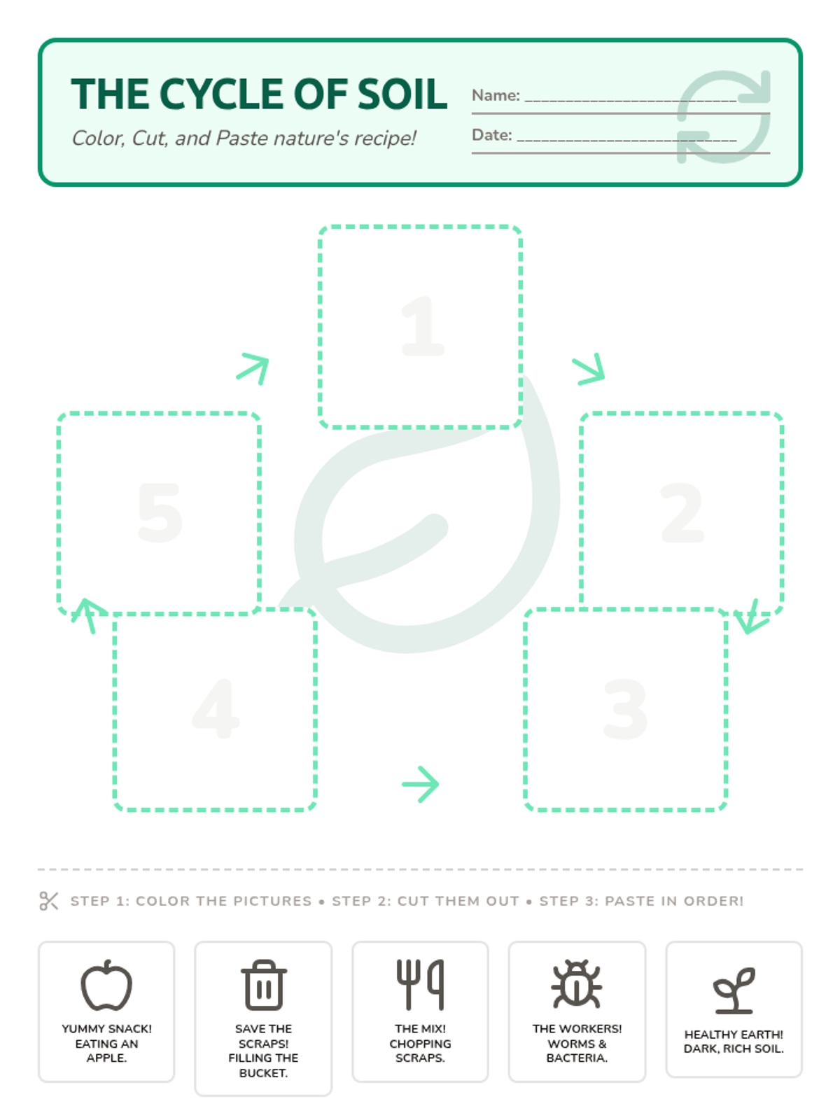 A lesson where students learn the 'recipe' for compost and visualize the circular process of turning food scraps back into healthy soil. This lesson features a field trip video to a composting facility and a cut-and-paste sequencing activity.