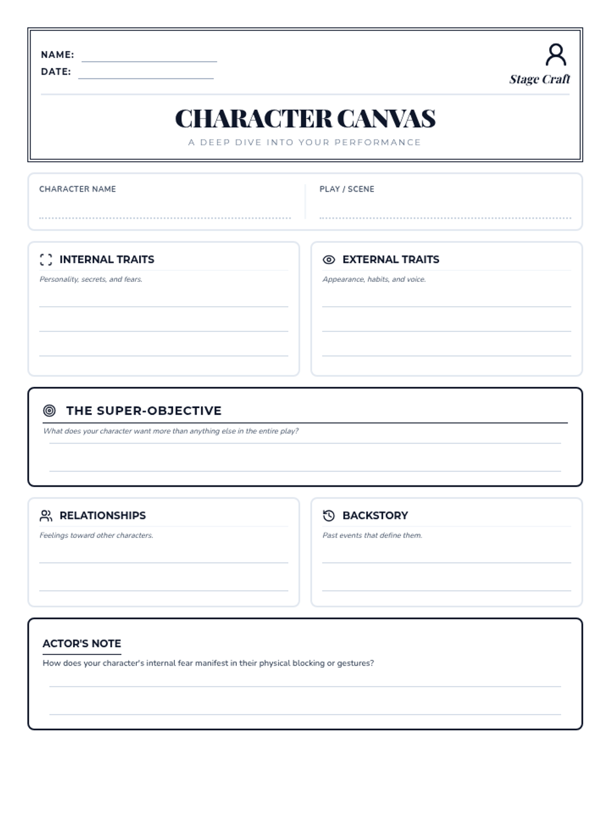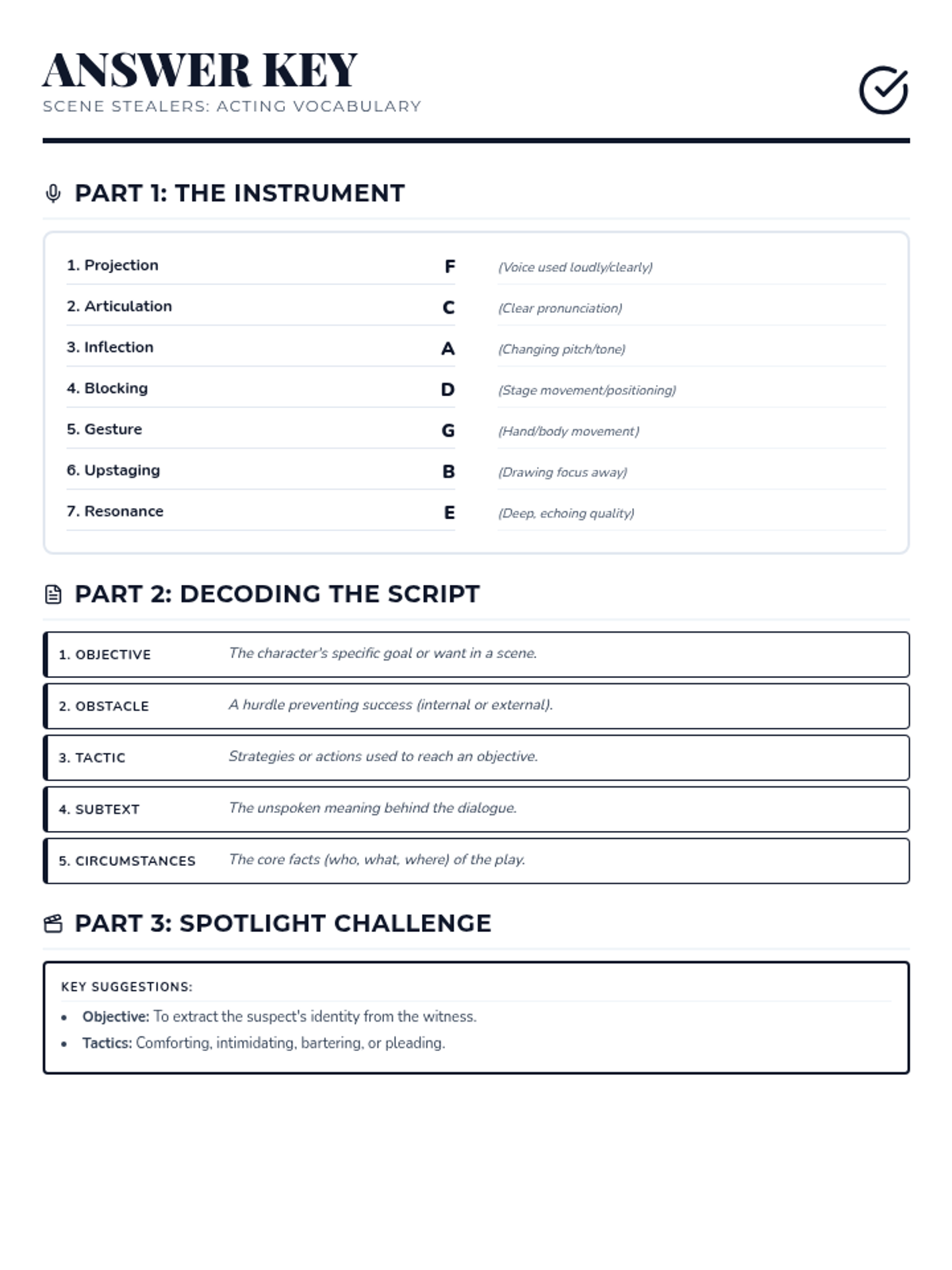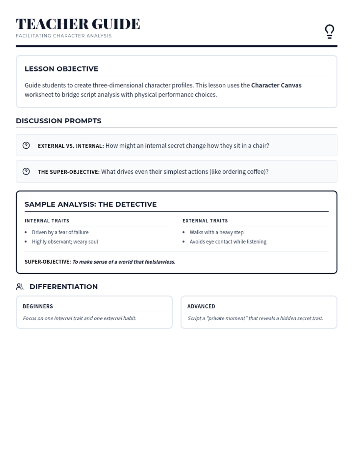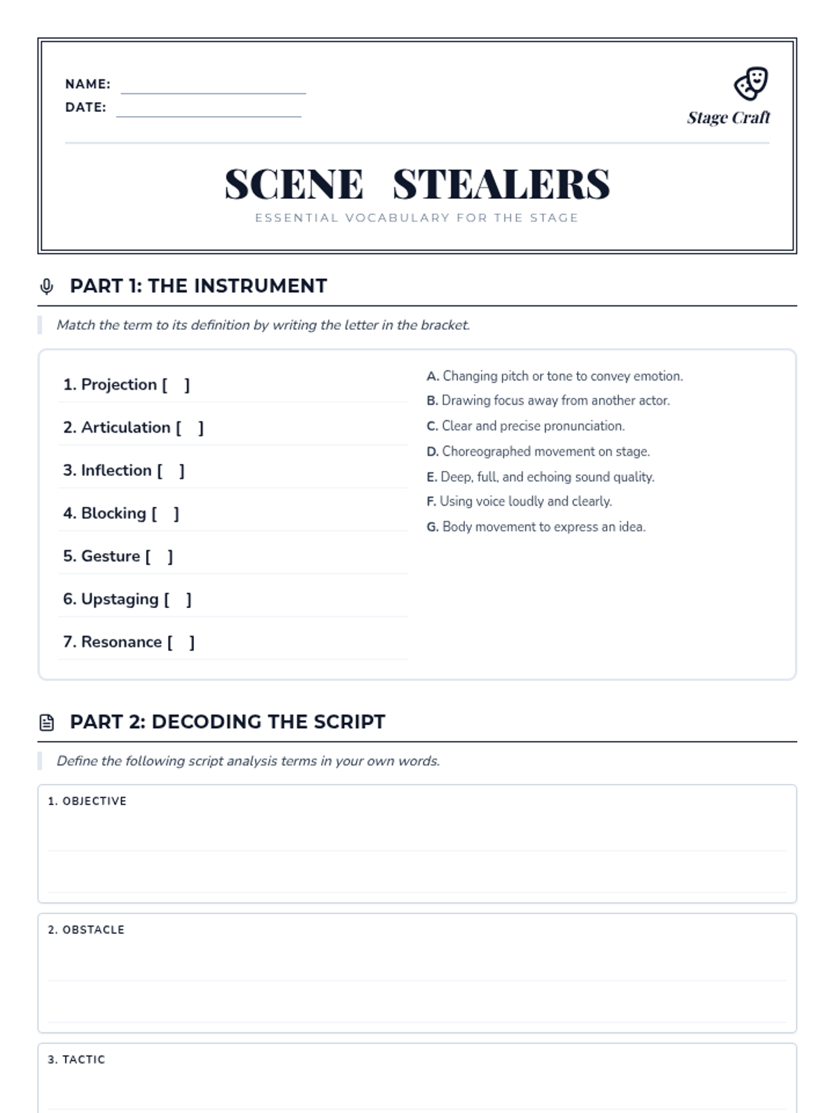 A foundational lesson on theater terminology focusing on how actors use their voice, body, and script analysis to create compelling characters.