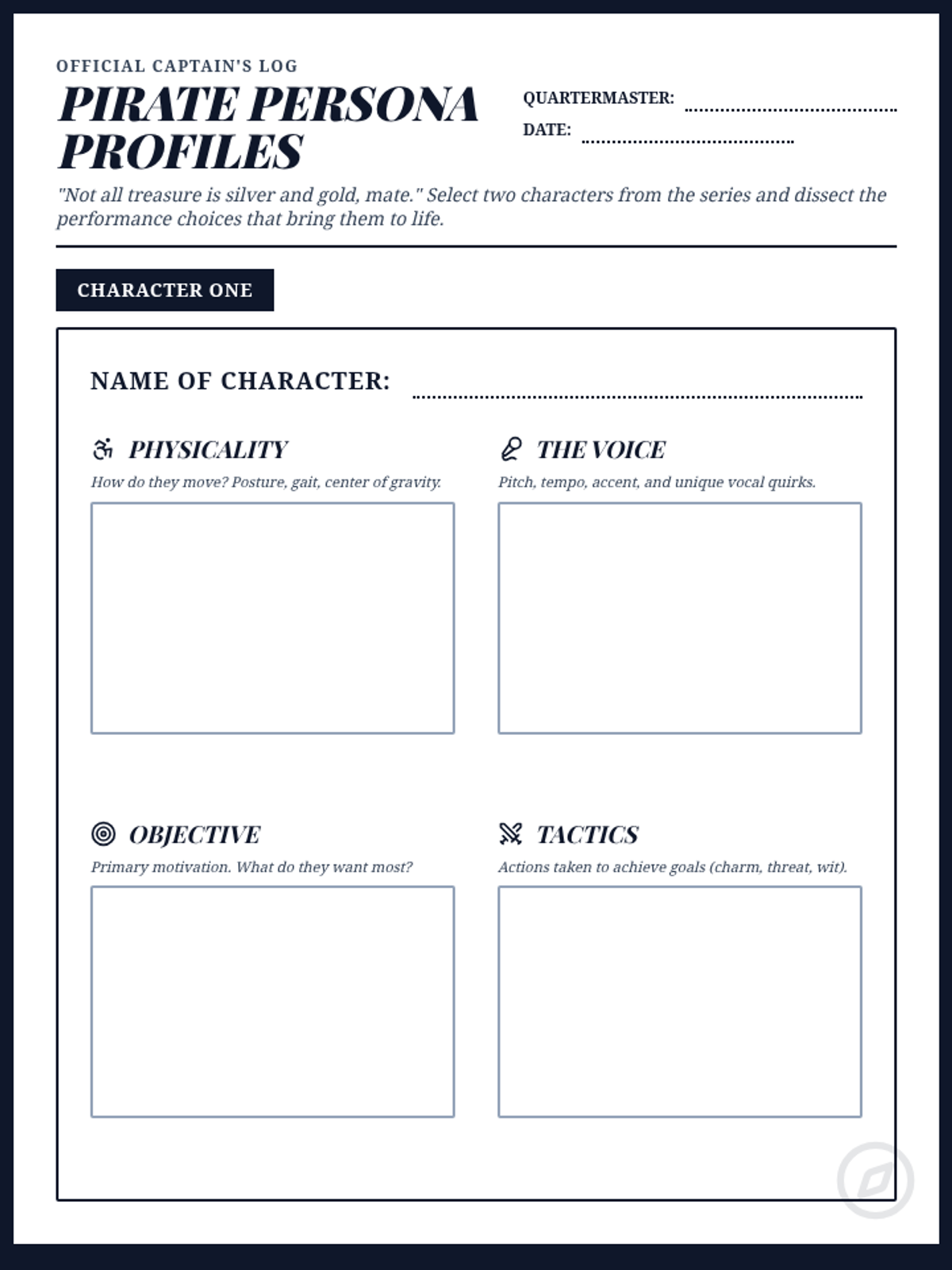 A lesson focused on analyzing the performance choices and narrative motivations of characters in the Pirates of the Caribbean series. Students explore how physicality, voice, and tactics define iconic cinematic figures.