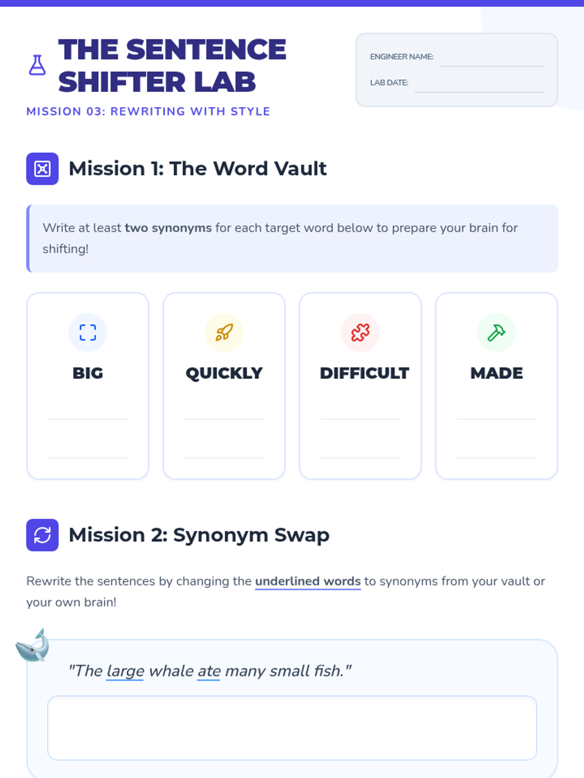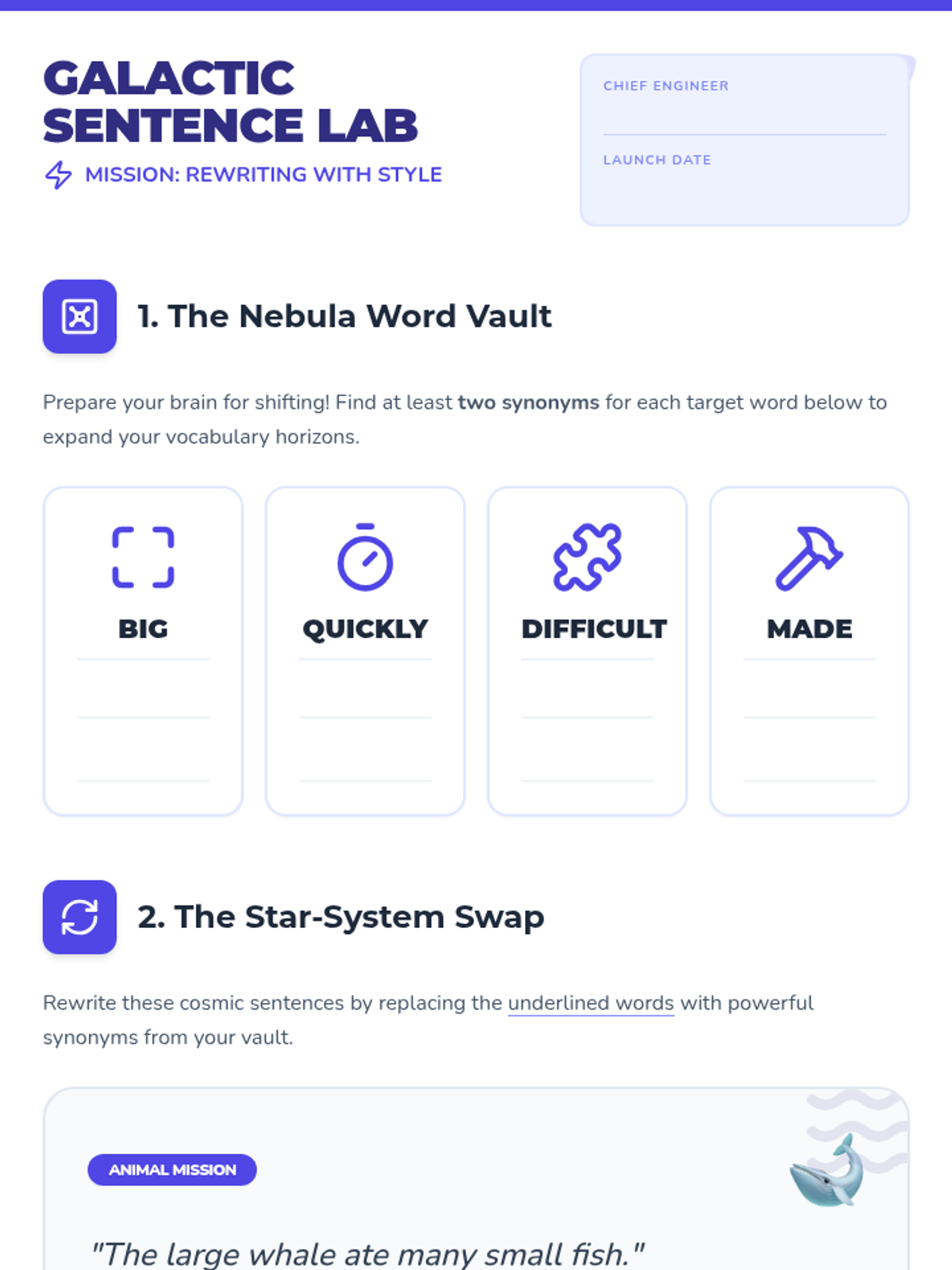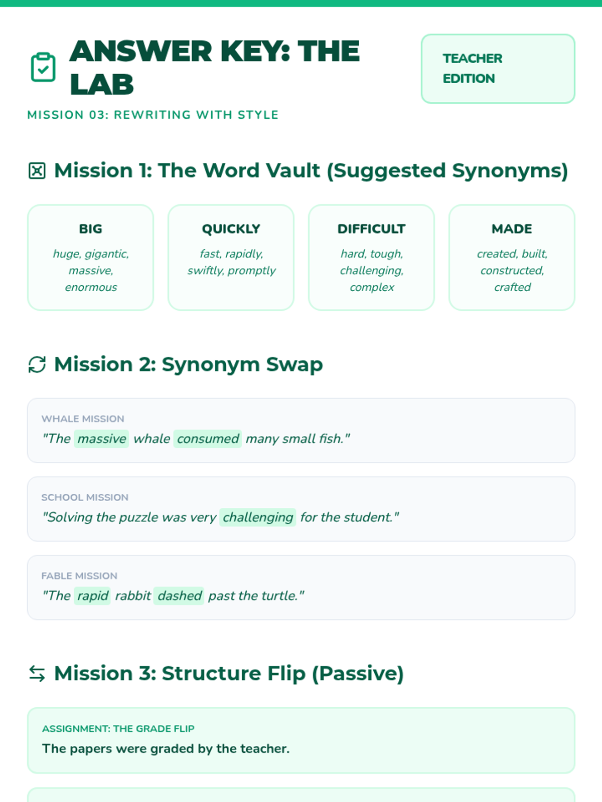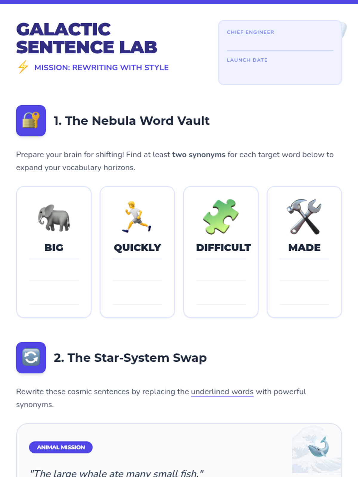 A visual, high-engagement workshop for students to practice sentence manipulation. Students explore synonyms to enhance vocabulary and master the 'Active to Passive' voice flip through space, school, and fable-themed missions.