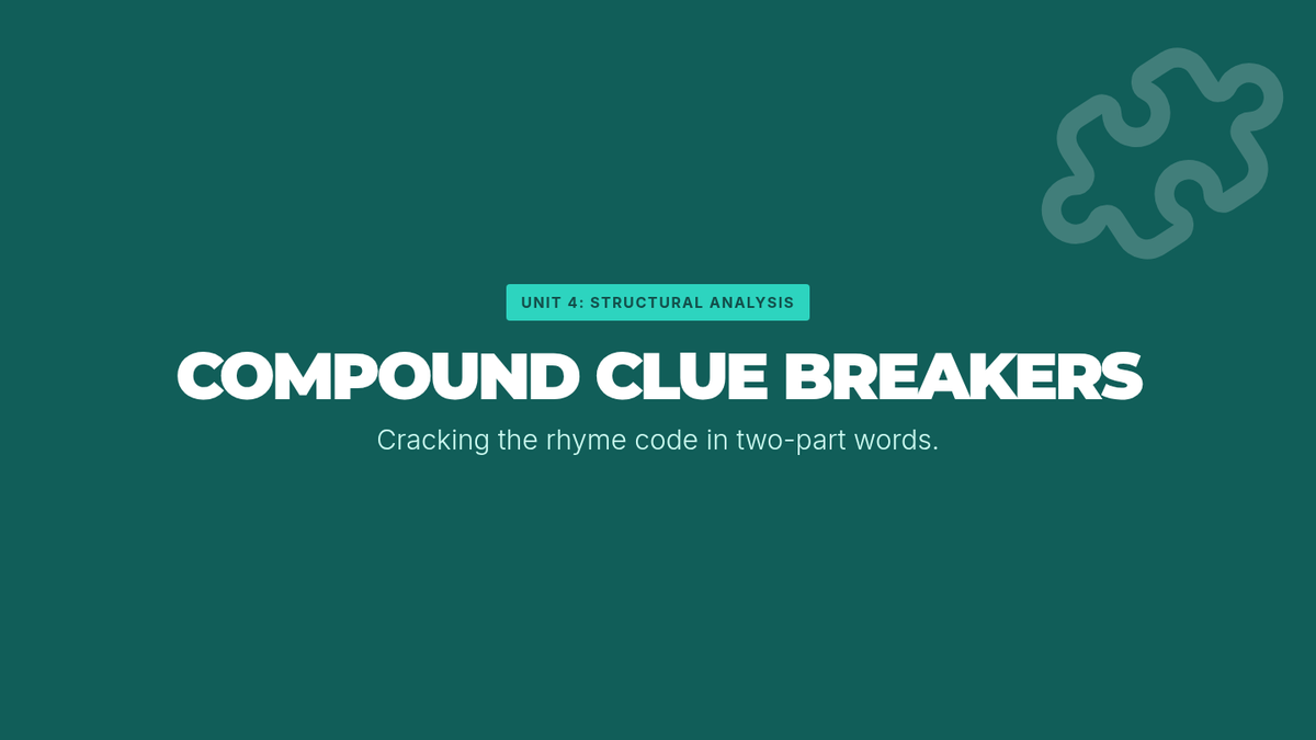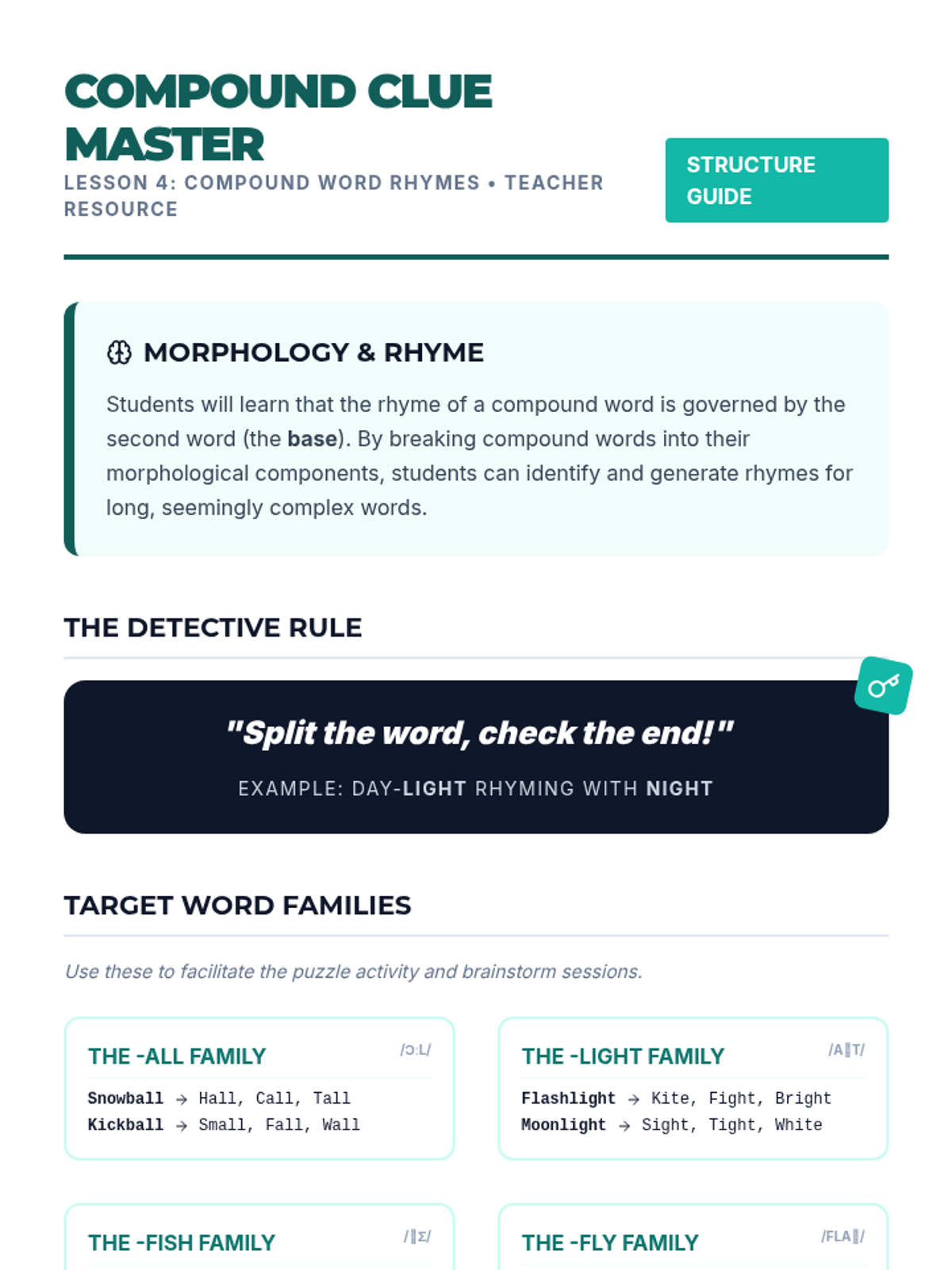 Students explore how compound words rhyme based on their second component and practice generating new rhymes for compound word families.