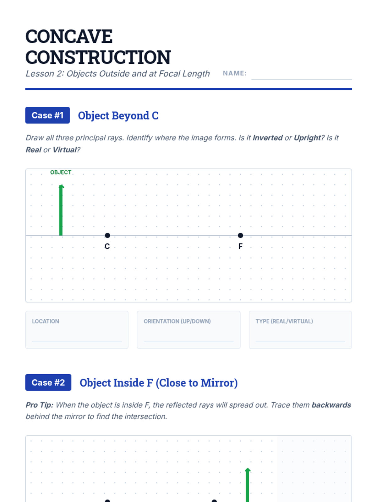 Students apply ray tracing rules to concave mirrors, exploring how object position relative to the focal point changes the image from real and inverted to virtual and upright.