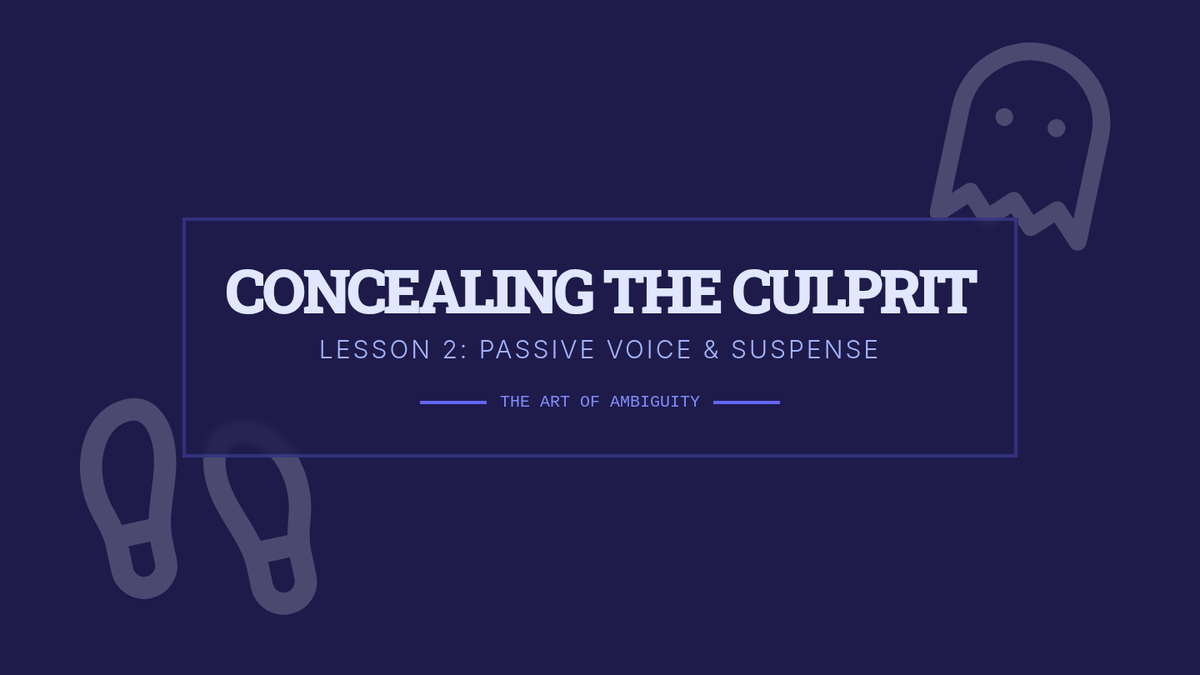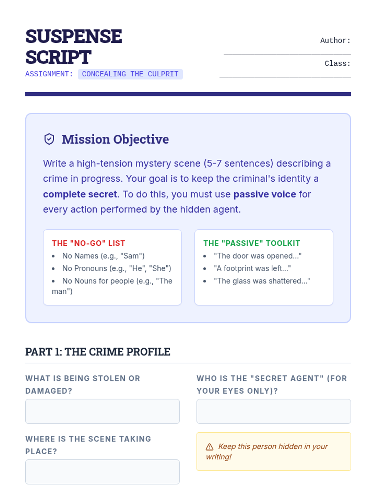 Students practice using passive voice effectively to build suspense and ambiguity by writing a short mystery scene that conceals the criminal.