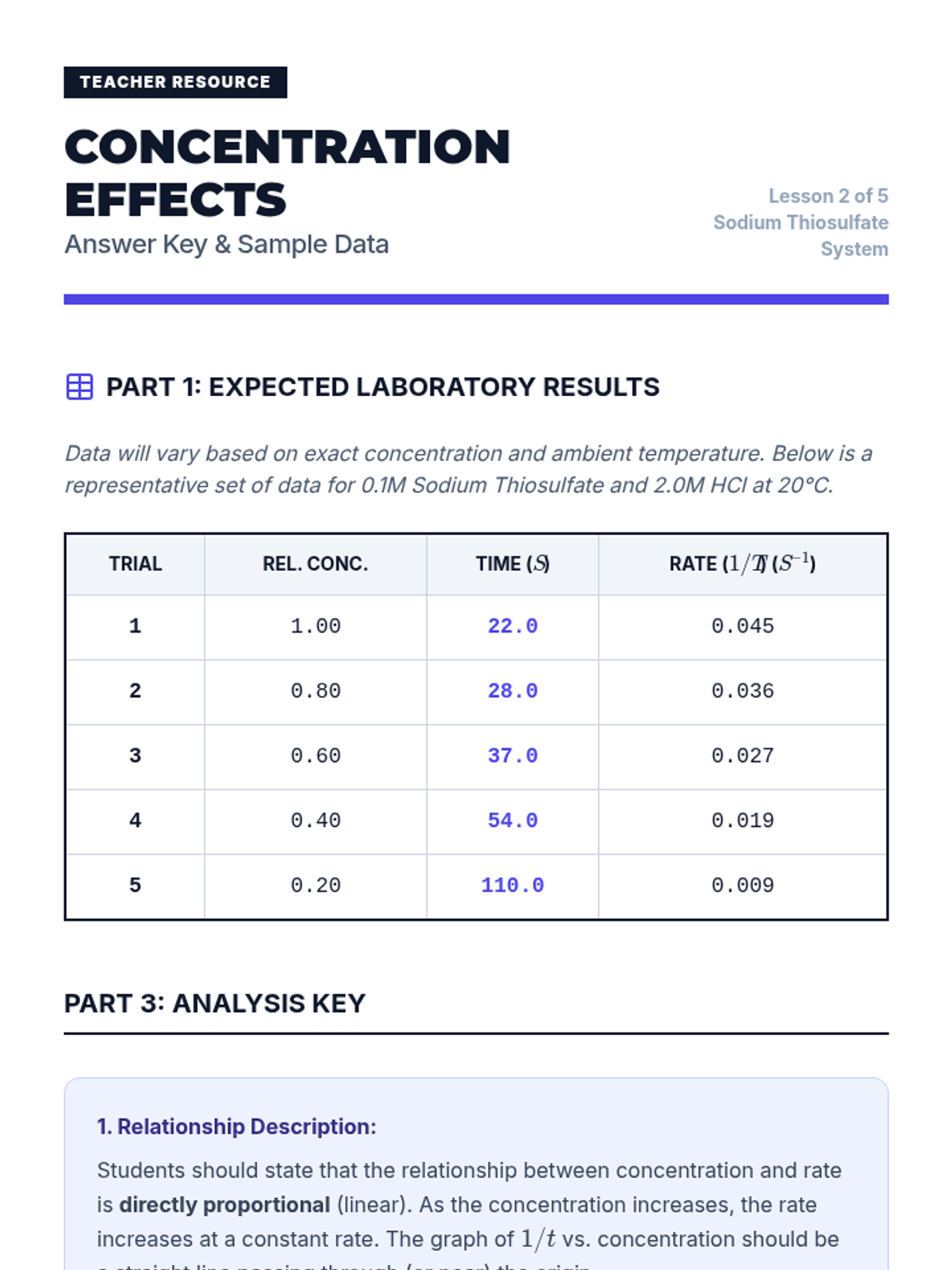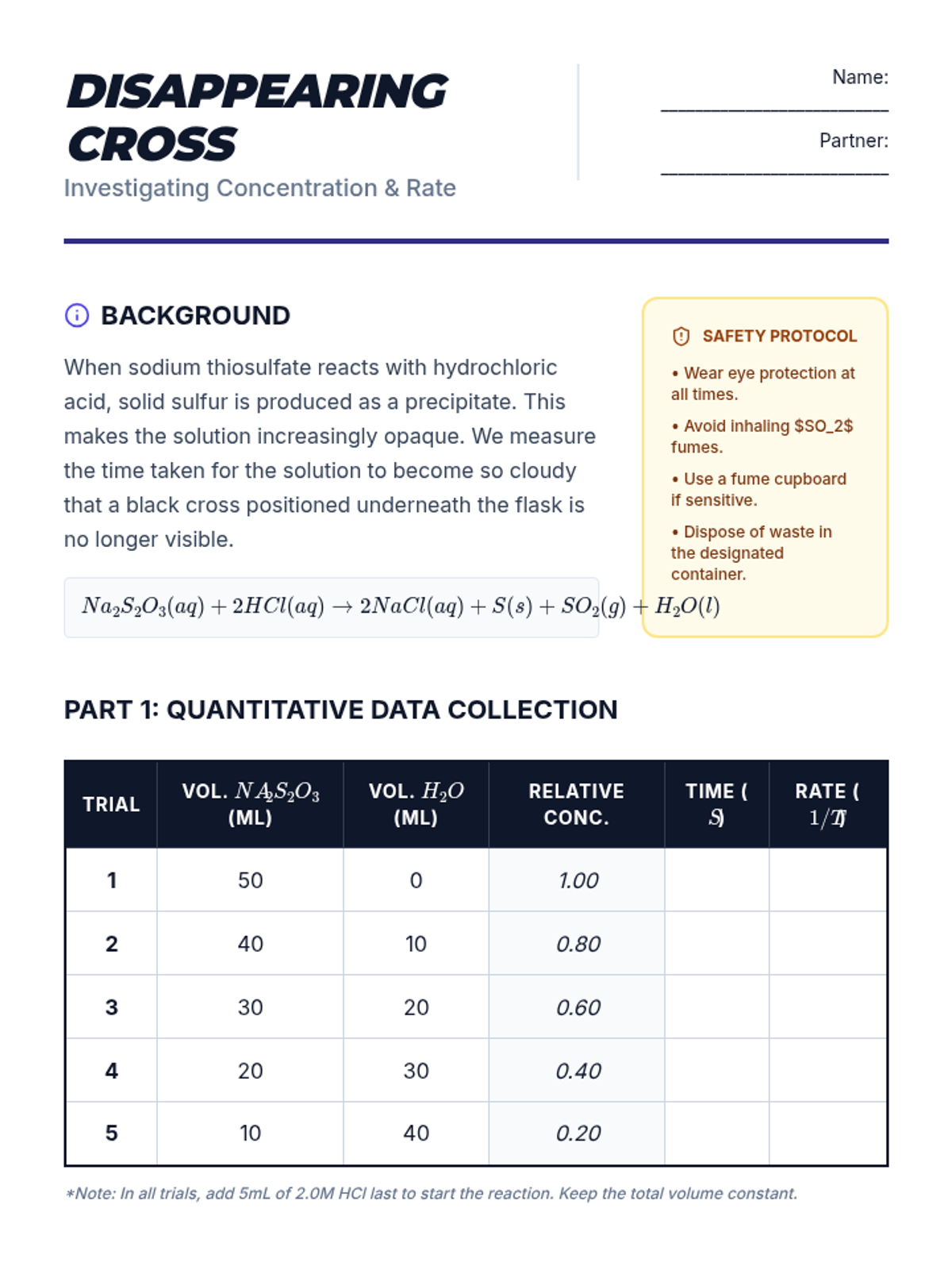 Students investigate the quantitative relationship between reactant concentration and reaction rate using the disappearing cross method, learning to graph linear relationships between concentration and 1/t.