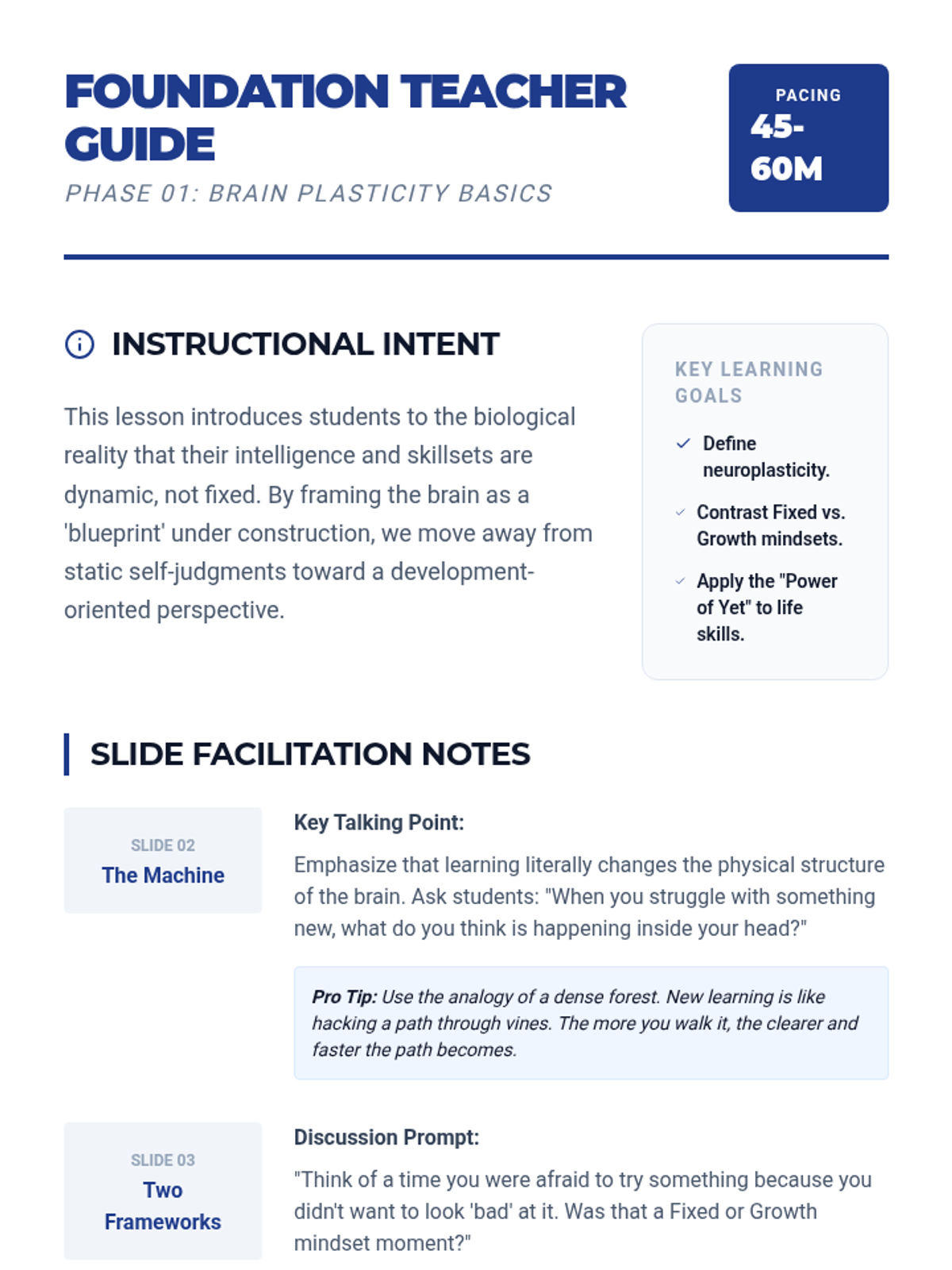 A mentor-facilitated program designed to build student confidence through positive self-talk, growth mindset exercises, and practical coping strategies. The materials provide a structured but flexible framework for meaningful 1-on-1 sessions.
