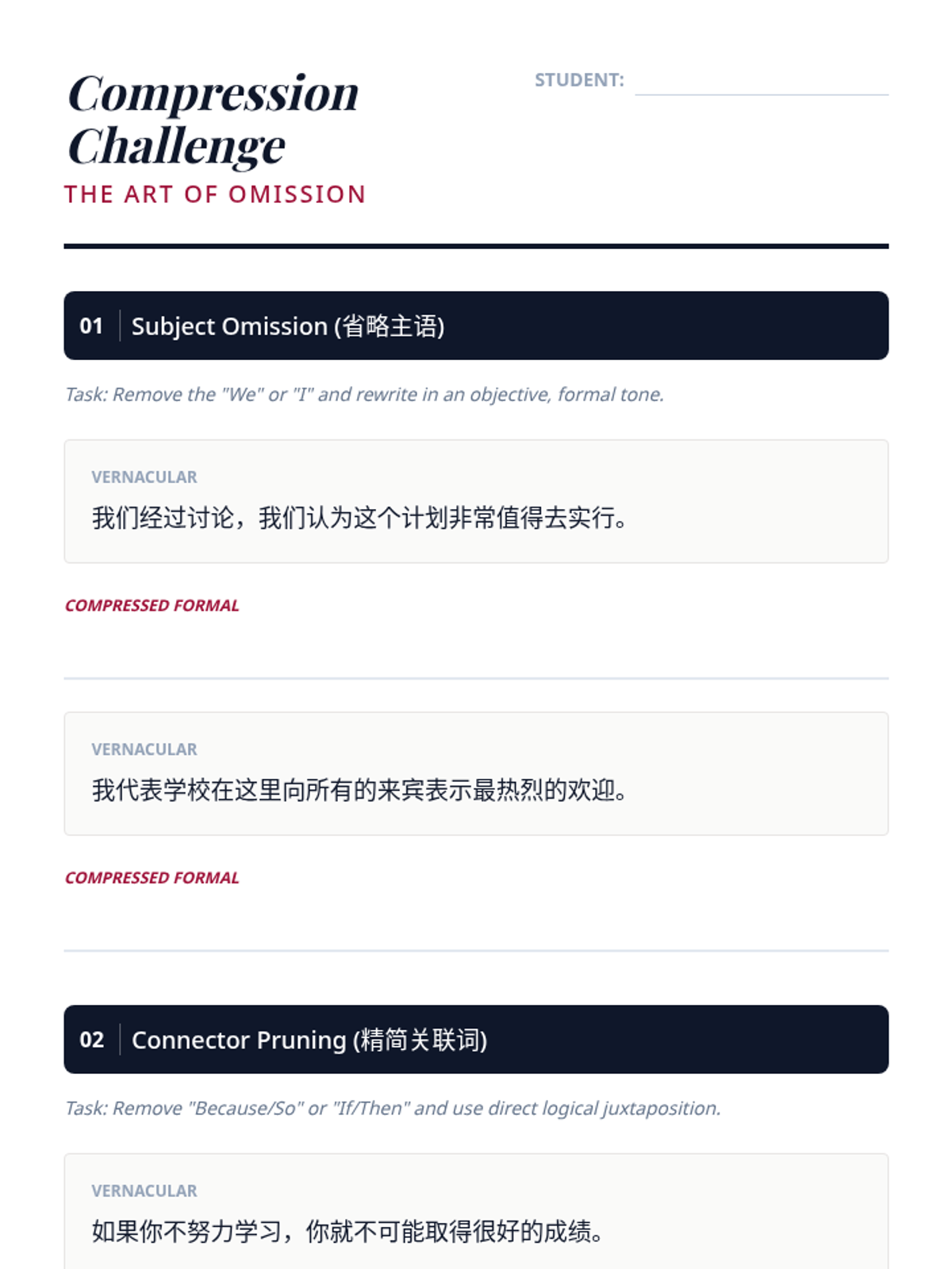 Learning how classical Chinese omits subjects and connecting words for brevity. Students practice 'tightening' loose modern sentences by applying classical ellipsis rules.