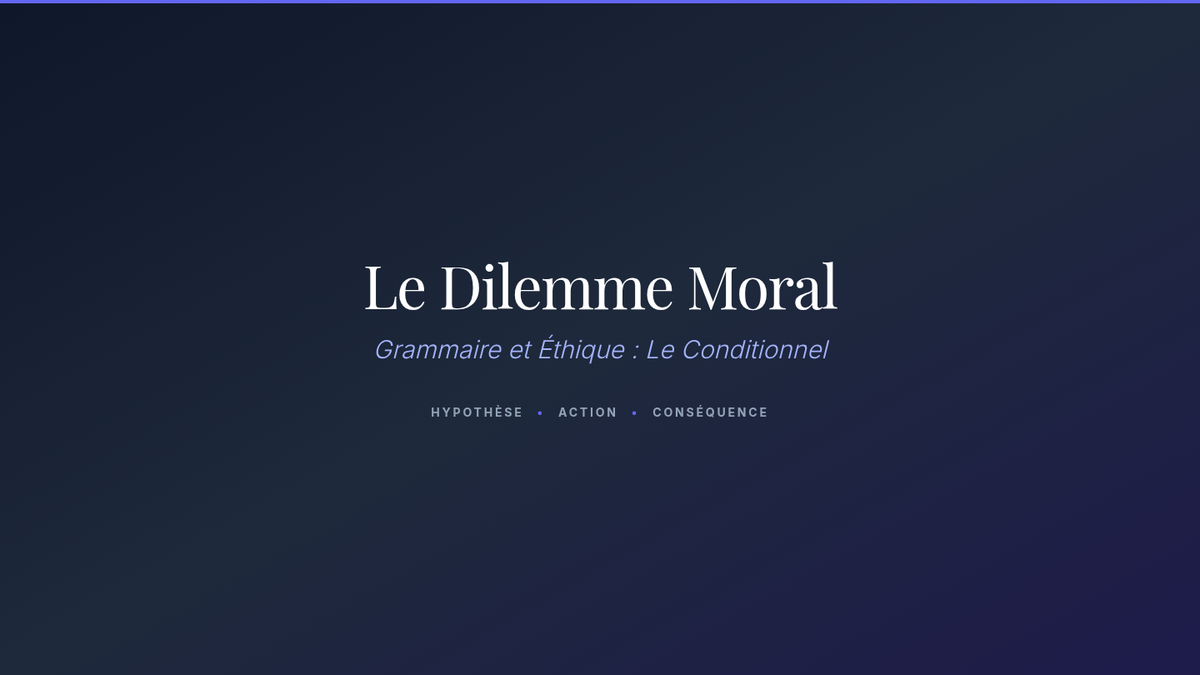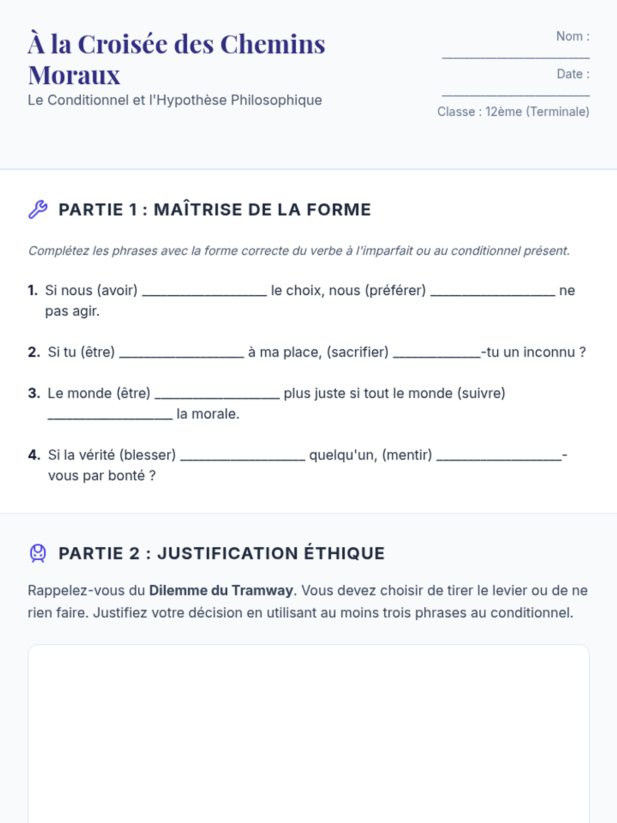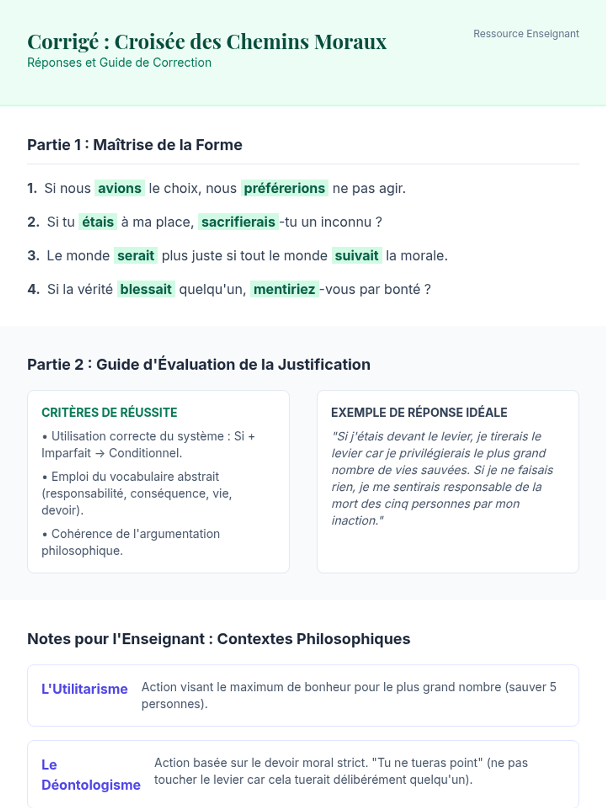 Reviewing the conditional mood, students explore 'si' clauses to discuss hypothetical moral dilemmas. The focus is on precision in describing potential outcomes of philosophical problems, centered around the 'Trolley Problem'.