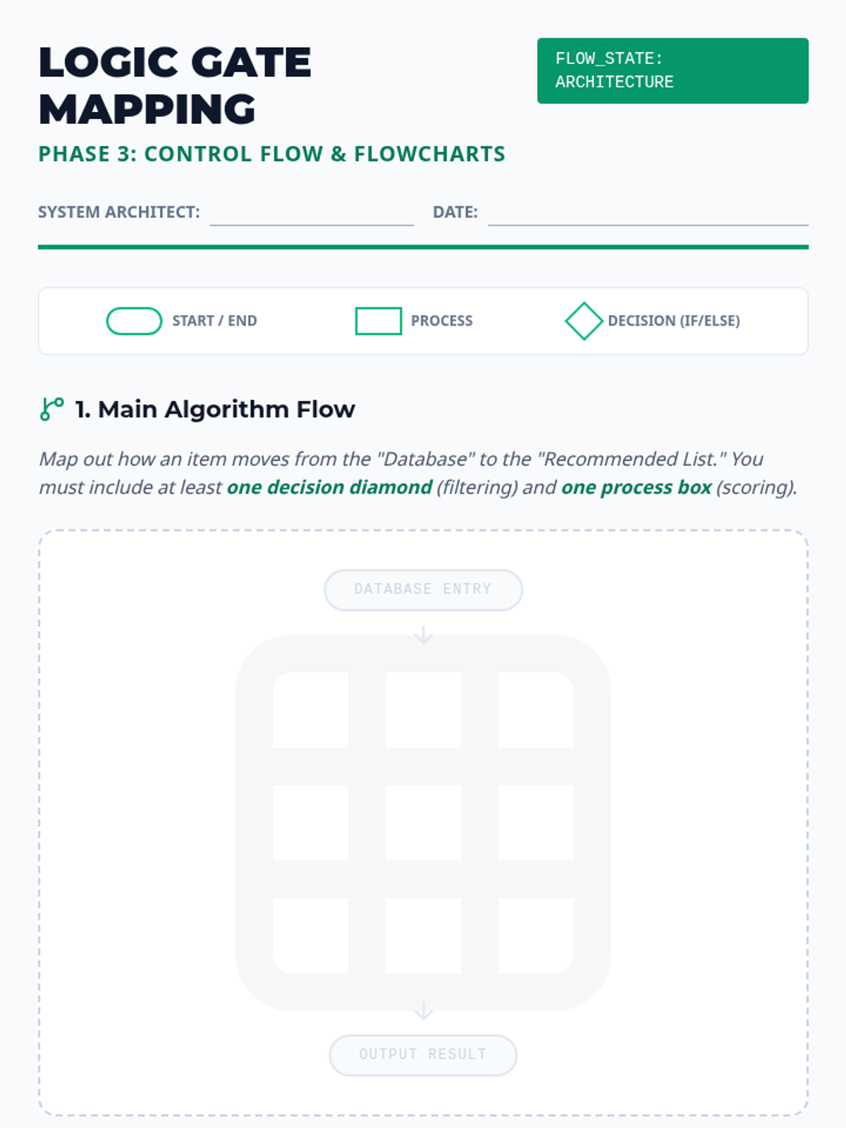 Students map out the flow of their algorithm using 'If/Then/Else' structures to filter and promote data through the system.