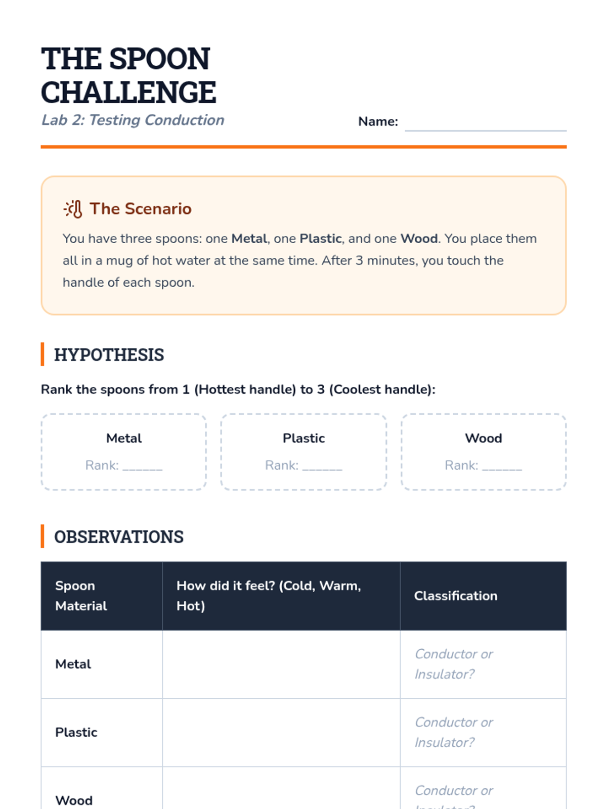 Students test various materials to identify conductors and insulators, defining conduction as heat transfer through direct contact.