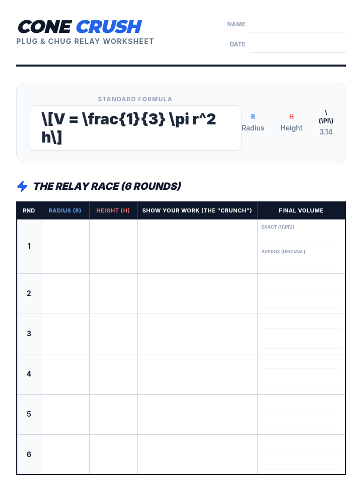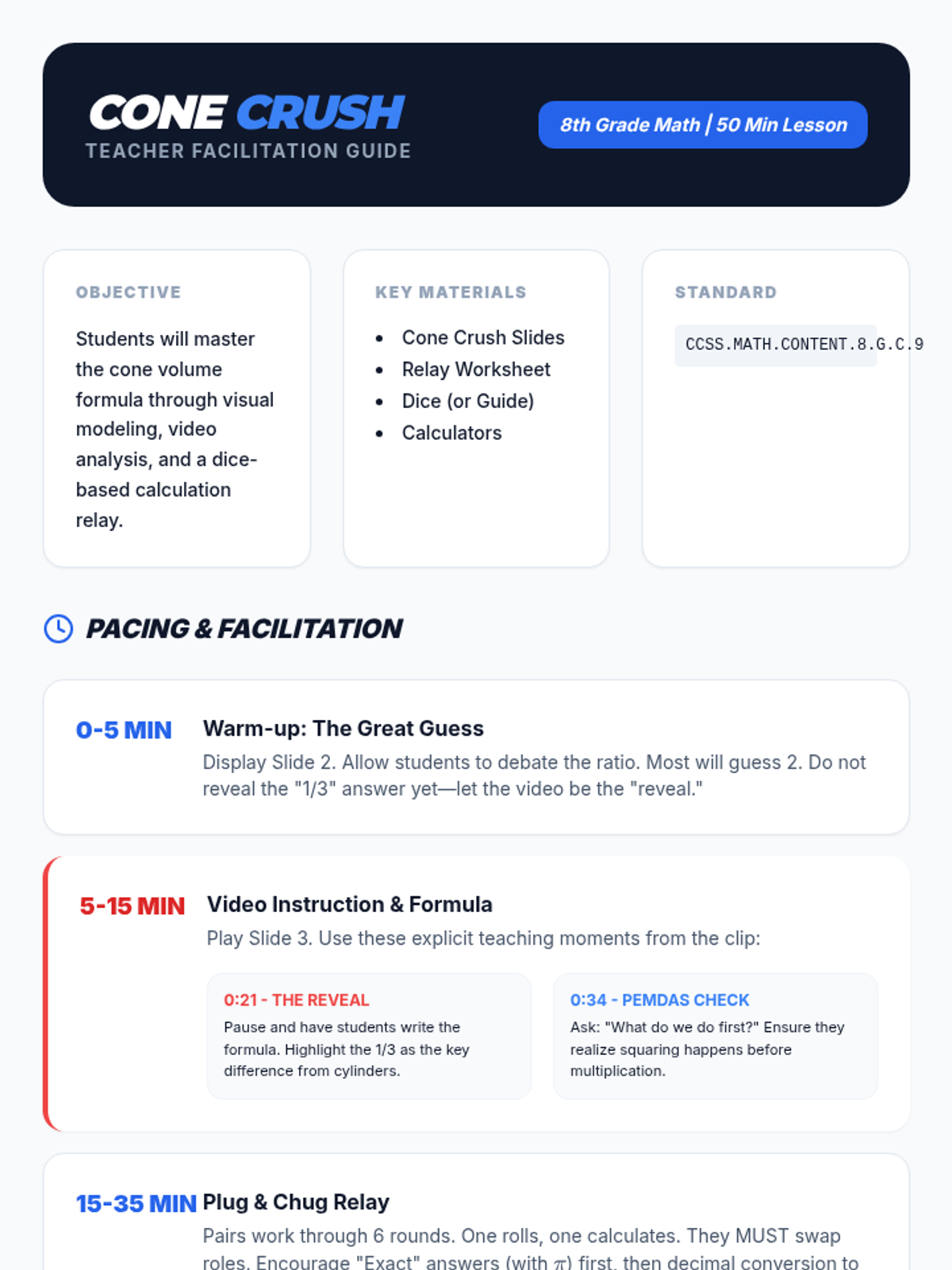 A high-energy lesson where students master the cone volume formula through visual modeling, video analysis, and a 'Plug and Chug' dice relay.